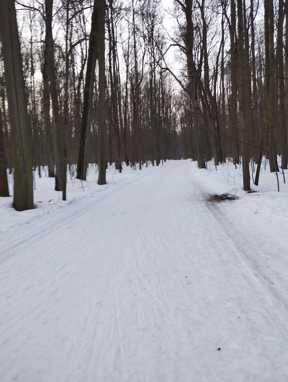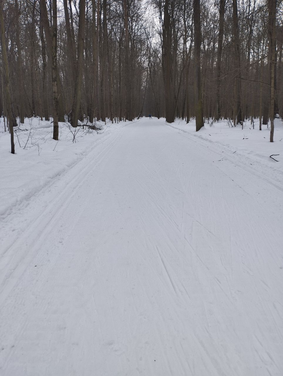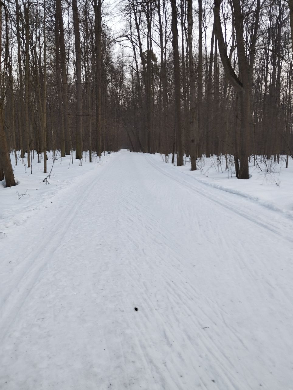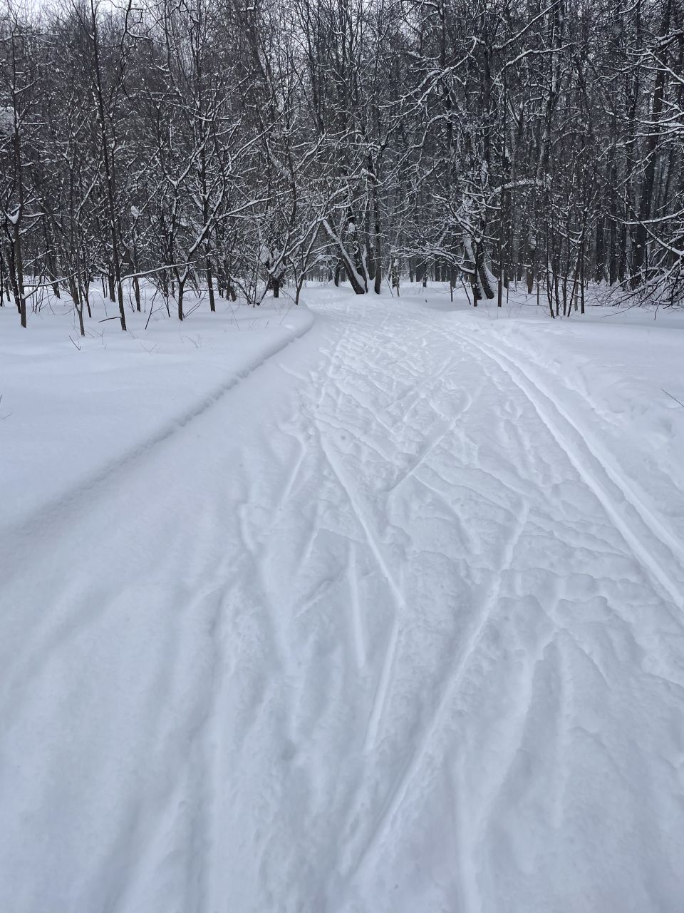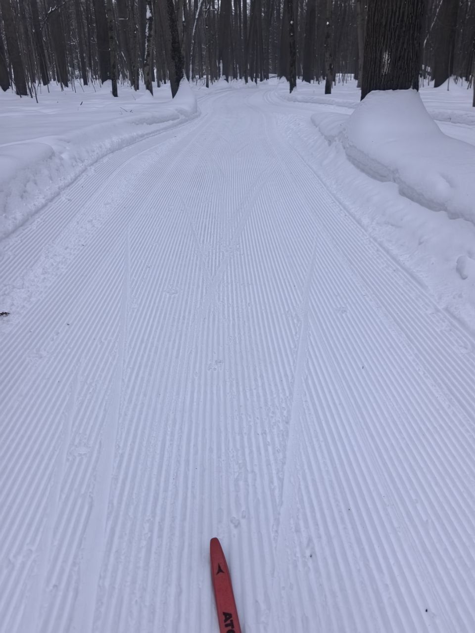 На равнине и на подьемах - везде - заснеженно, под крепления набивается снег, на равнине + укатали гуляющие огромную ложбину, так что ехать нормально невозможно. Трасса не укатана, не готова к тренировкам. Лучше воздержаться от похода в лес, чтобы не портить технику (если она конечно у вас есть), и сэкономить нервы, тк это не катание а издевательство над собой))).