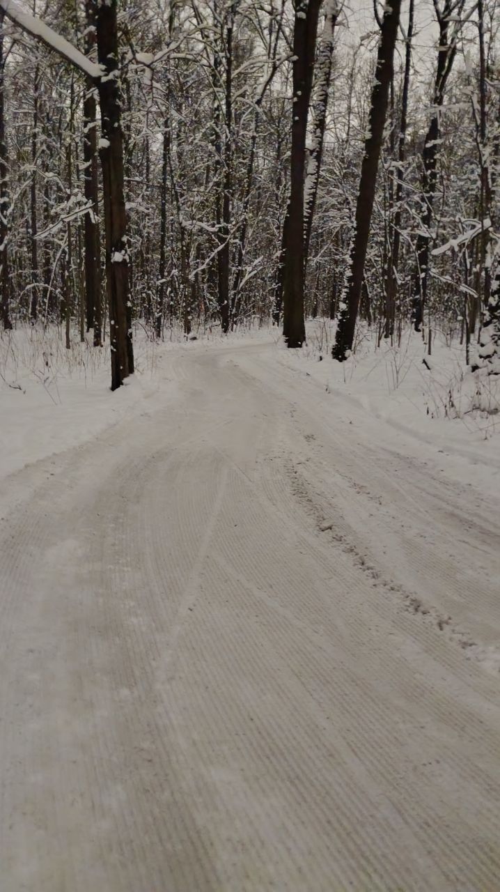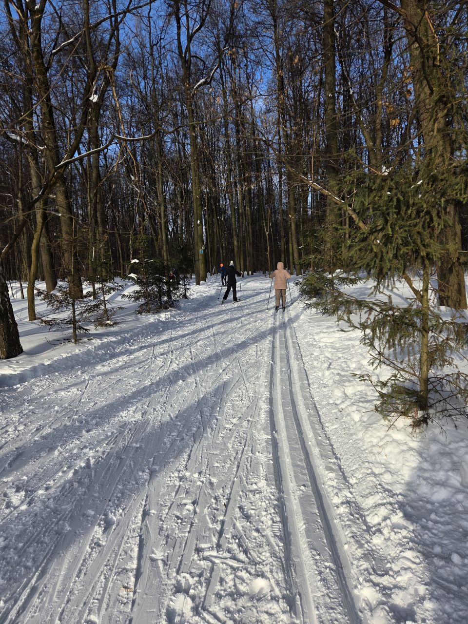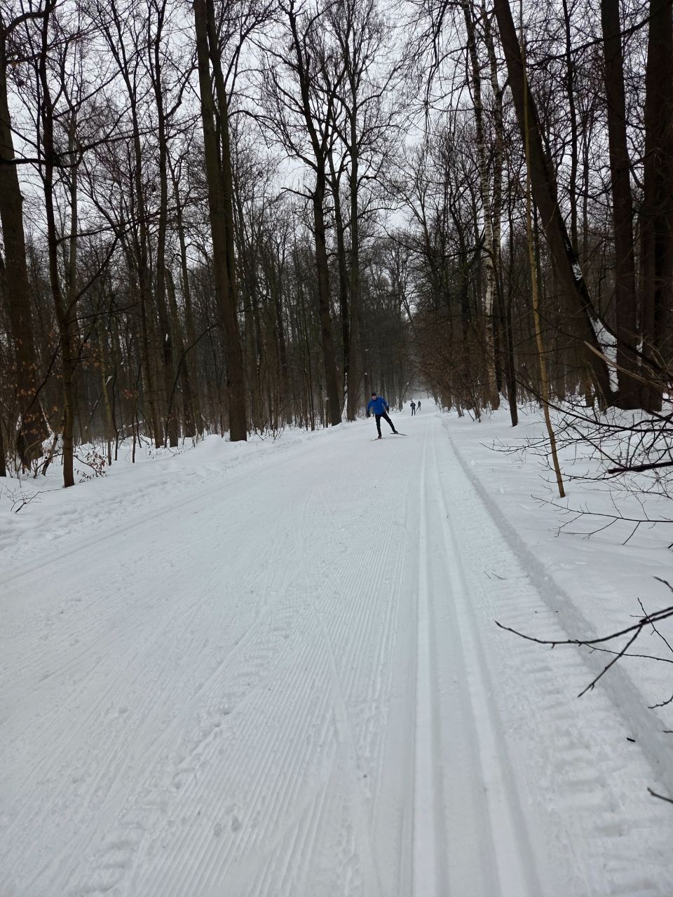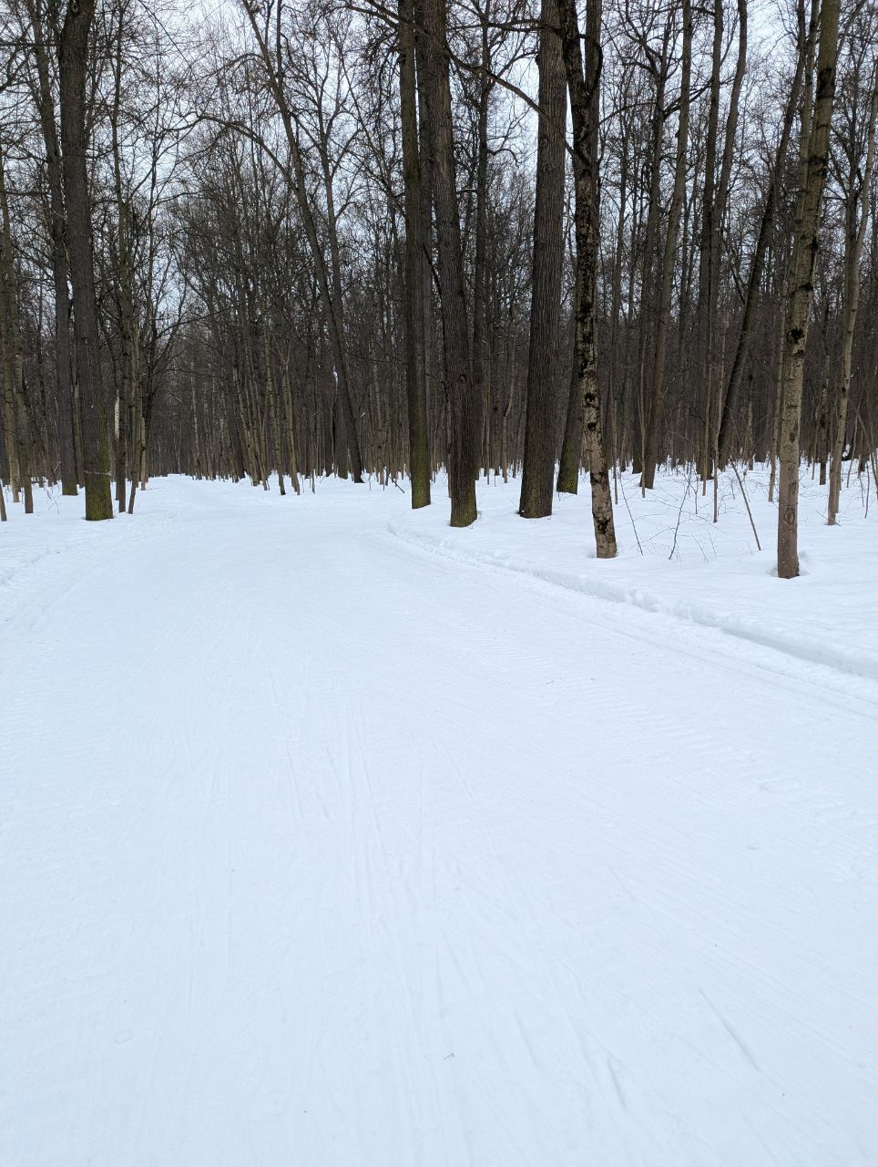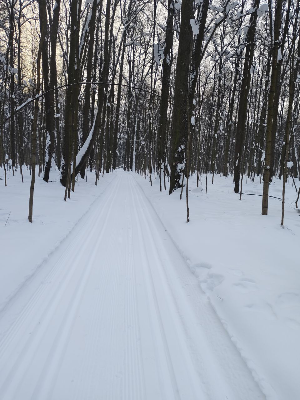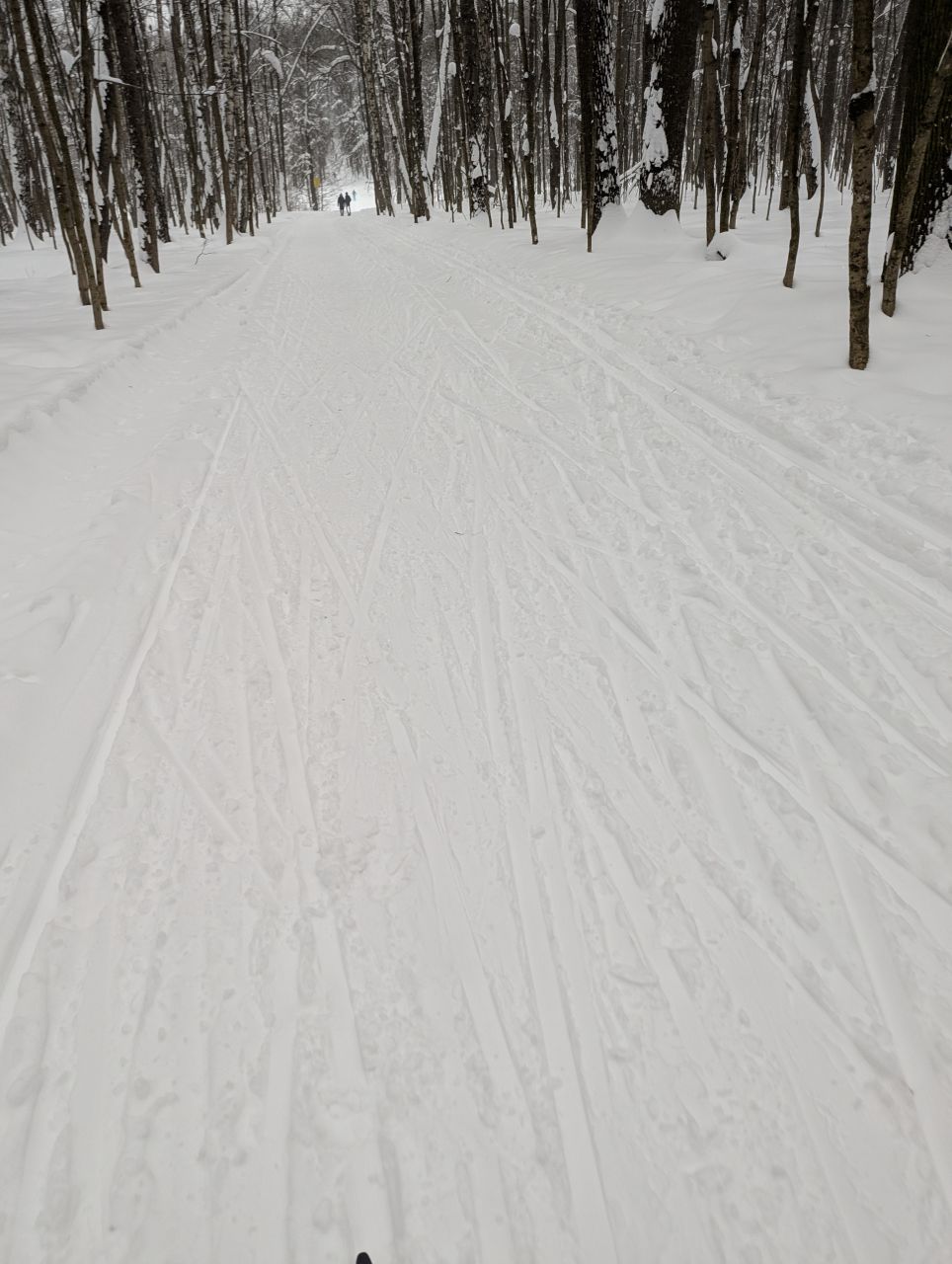 На равнине и на подьемах - везде - заснеженно, под крепления набивается снег, на равнине + укатали гуляющие огромную ложбину, так что ехать нормально невозможно. Трасса не укатана, не готова к тренировкам. Лучше воздержаться от похода в лес, чтобы не портить технику (если она конечно у вас есть), и сэкономить нервы, тк это не катание а издевательство над собой))).