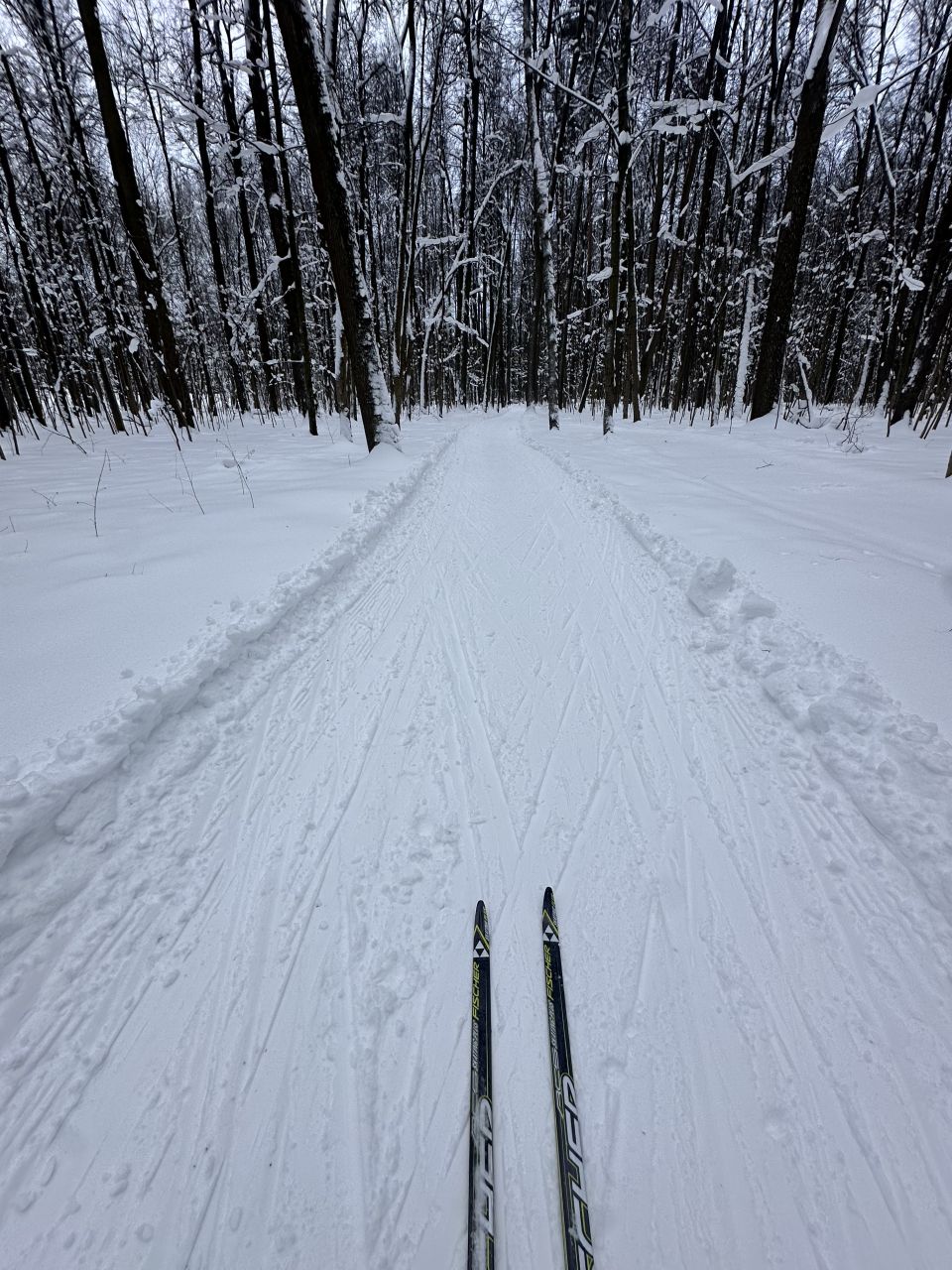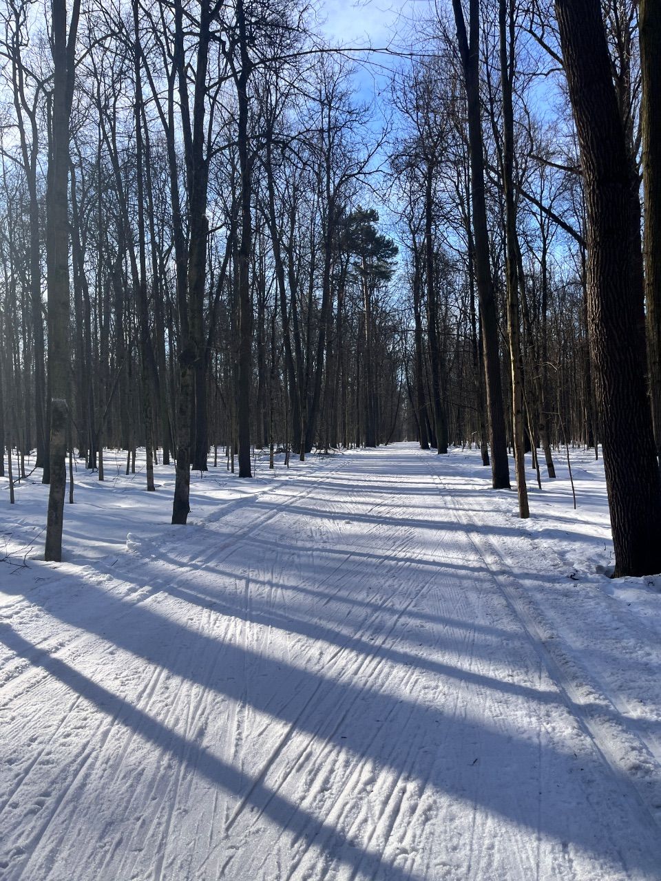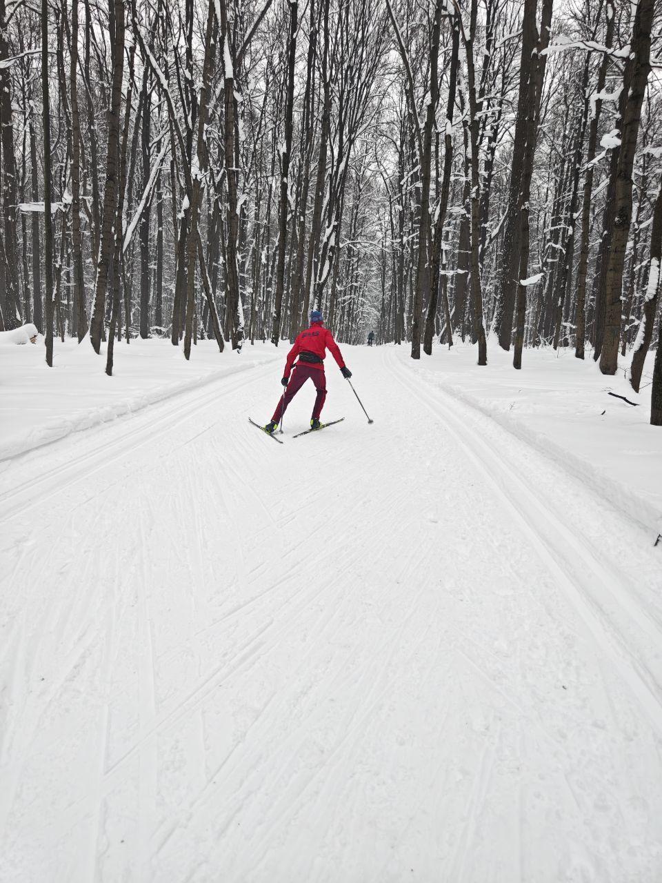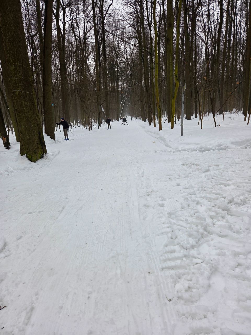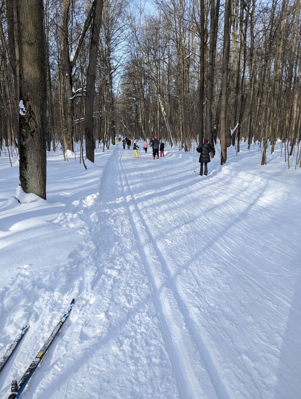 На равнине и на подьемах - везде - заснеженно, под крепления набивается снег, на равнине + укатали гуляющие огромную ложбину, так что ехать нормально невозможно. Трасса не укатана, не готова к тренировкам. Лучше воздержаться от похода в лес, чтобы не портить технику (если она конечно у вас есть), и сэкономить нервы, тк это не катание а издевательство над собой))).