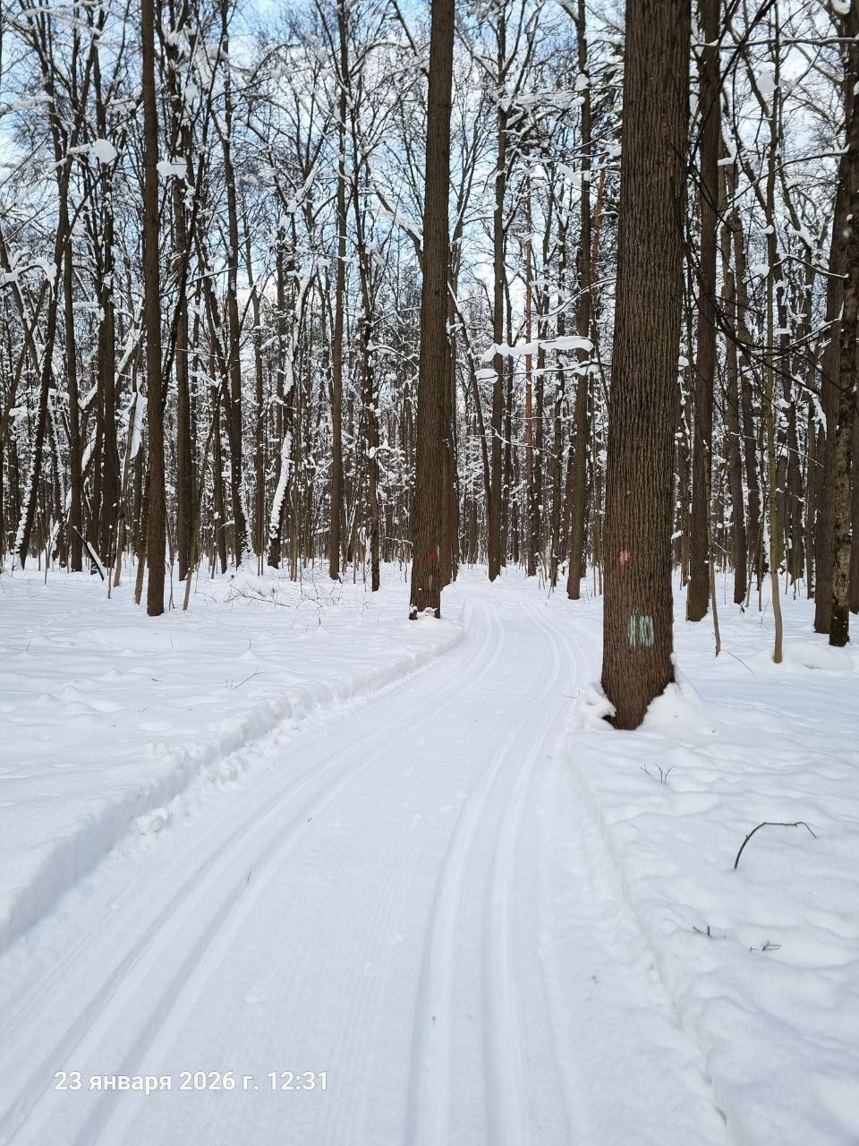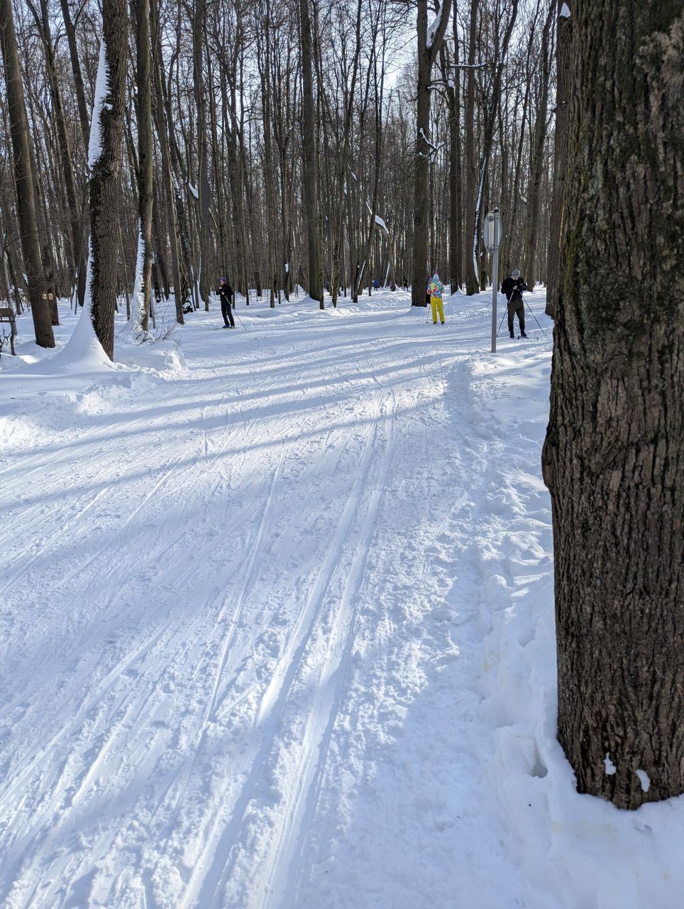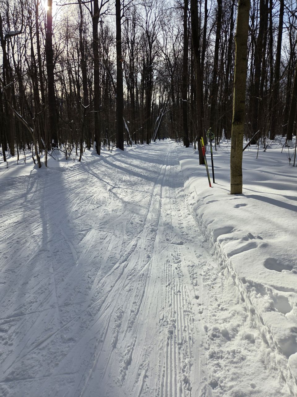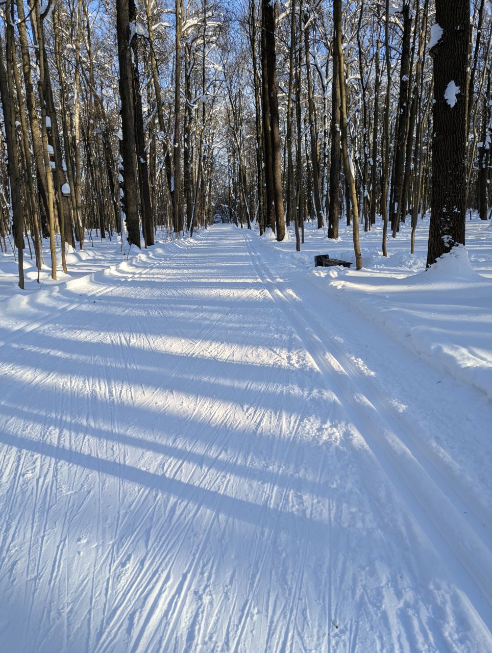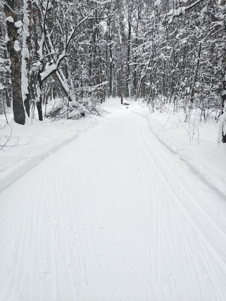 На равнине и на подьемах - везде - заснеженно, под крепления набивается снег, на равнине + укатали гуляющие огромную ложбину, так что ехать нормально невозможно. Трасса не укатана, не готова к тренировкам. Лучше воздержаться от похода в лес, чтобы не портить технику (если она конечно у вас есть), и сэкономить нервы, тк это не катание а издевательство над собой))).