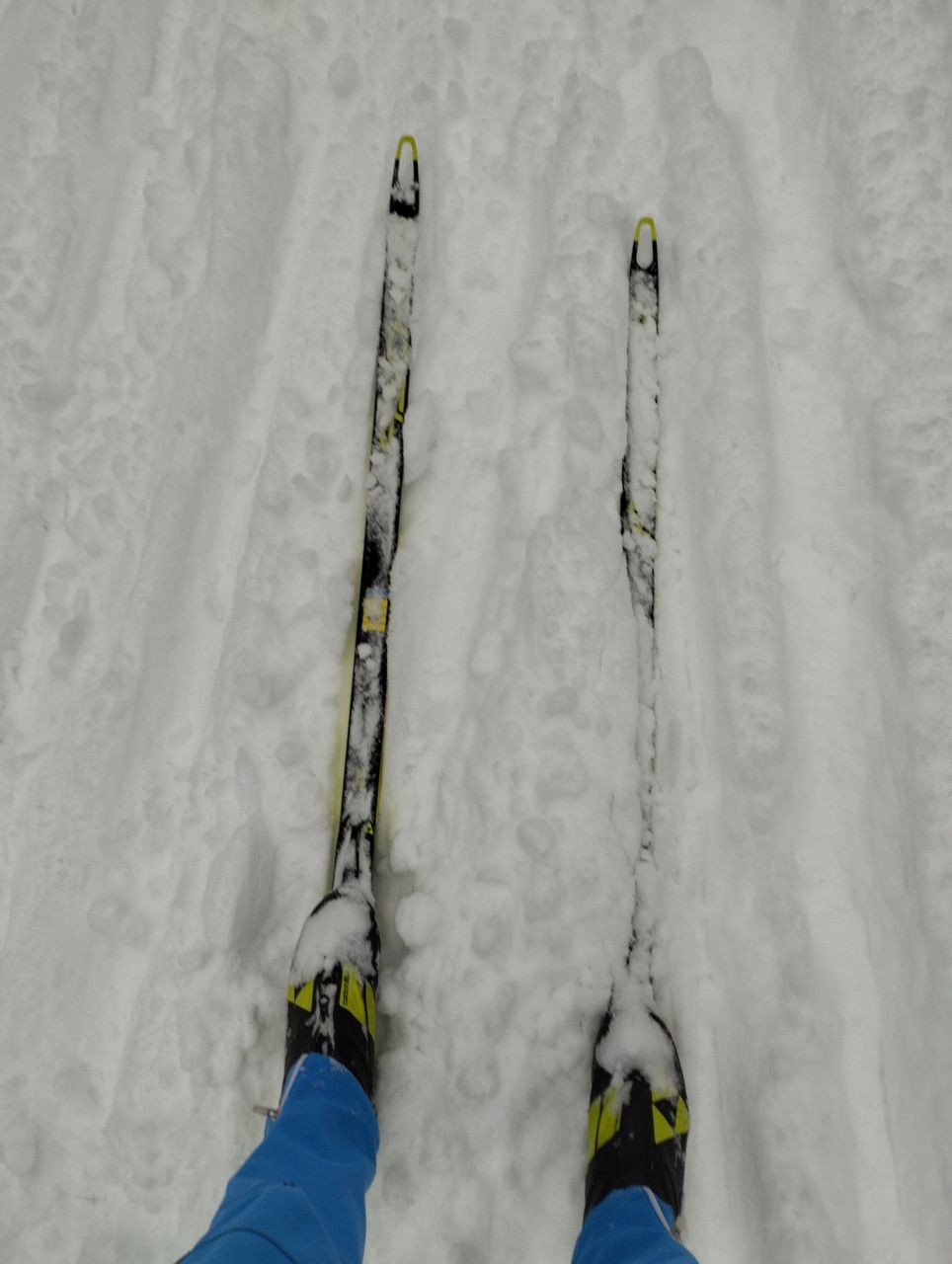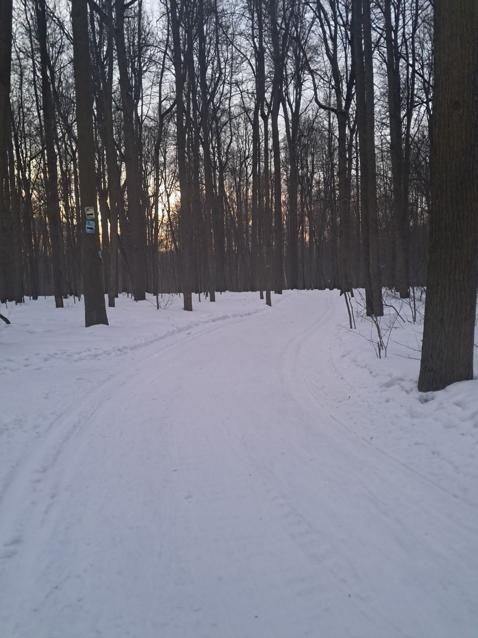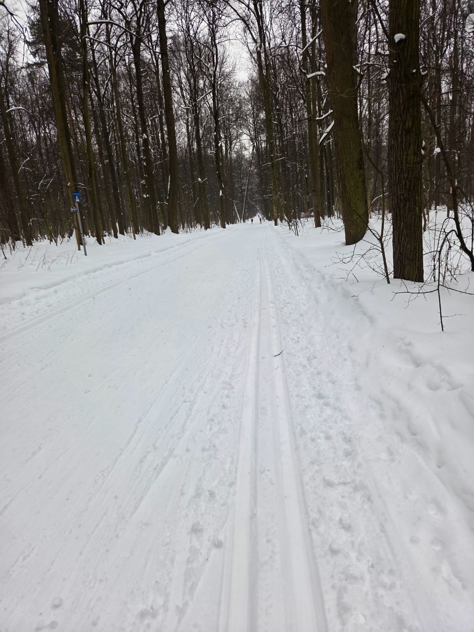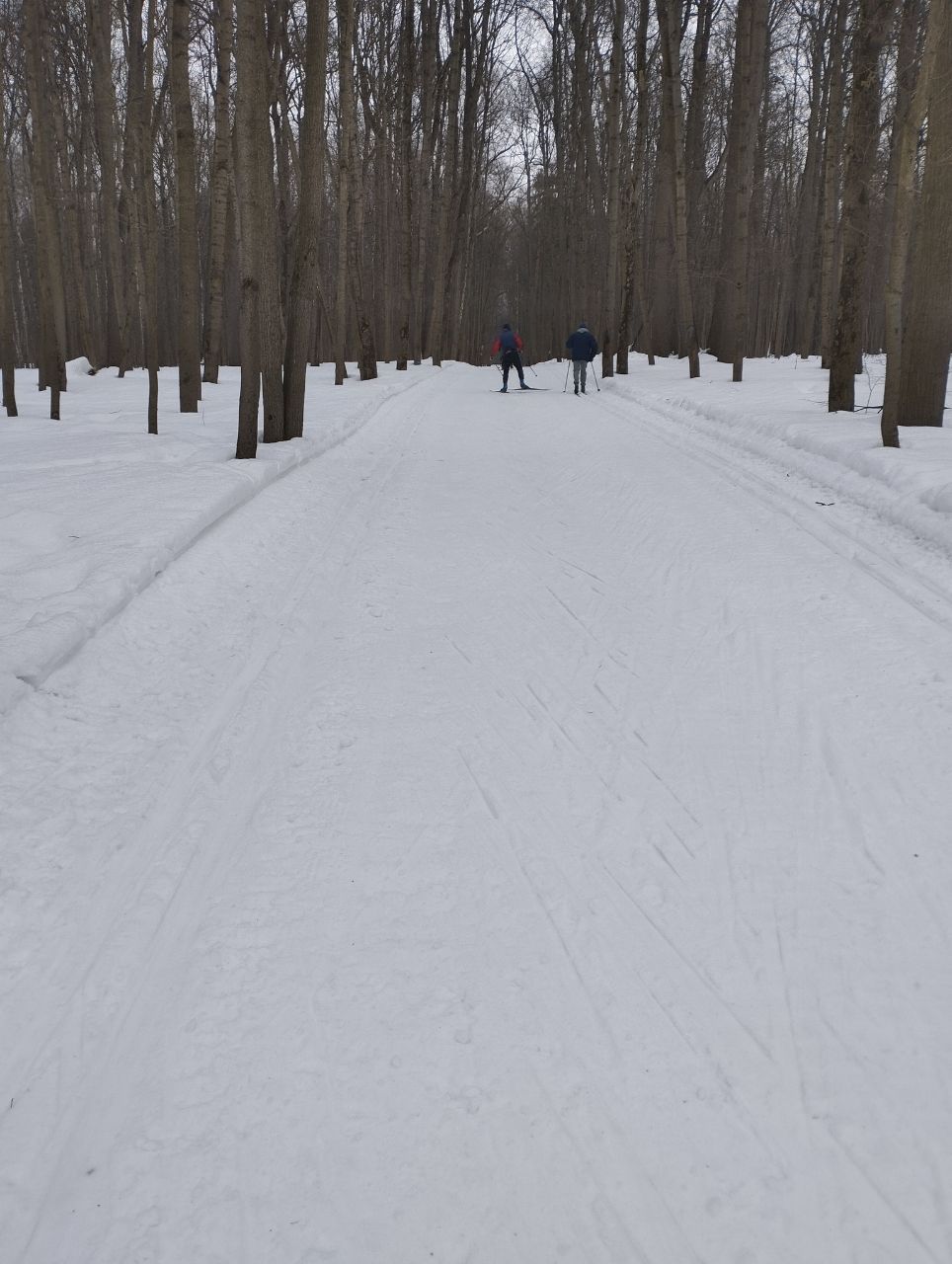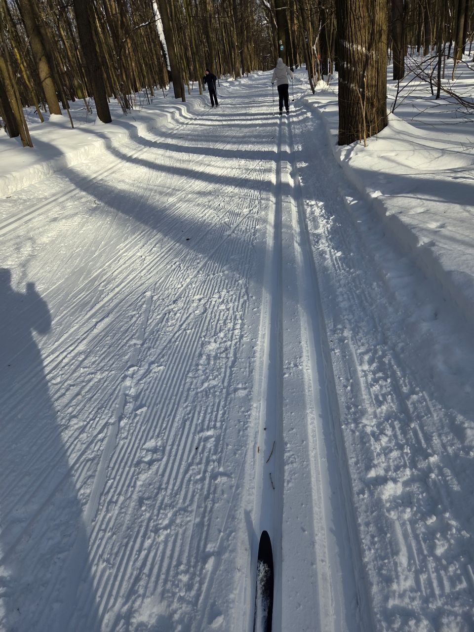 На равнине и на подьемах - везде - заснеженно, под крепления набивается снег, на равнине + укатали гуляющие огромную ложбину, так что ехать нормально невозможно. Трасса не укатана, не готова к тренировкам. Лучше воздержаться от похода в лес, чтобы не портить технику (если она конечно у вас есть), и сэкономить нервы, тк это не катание а издевательство над собой))).
