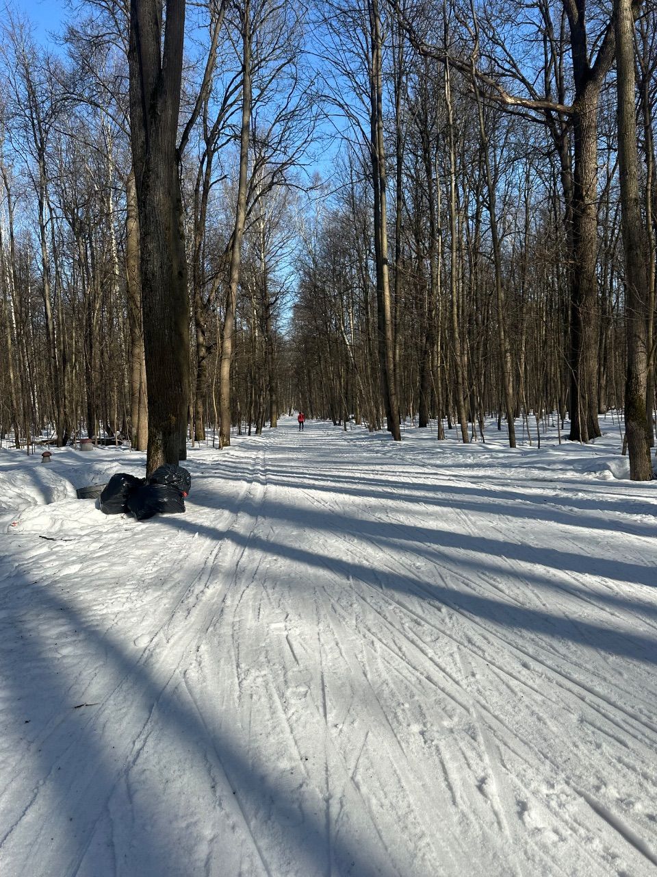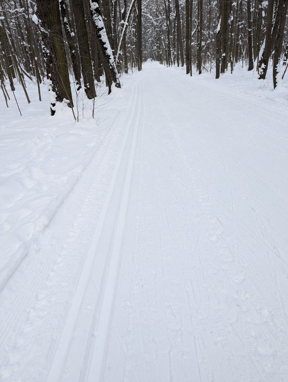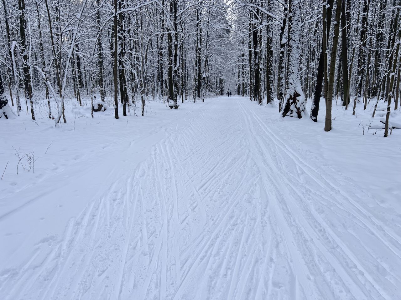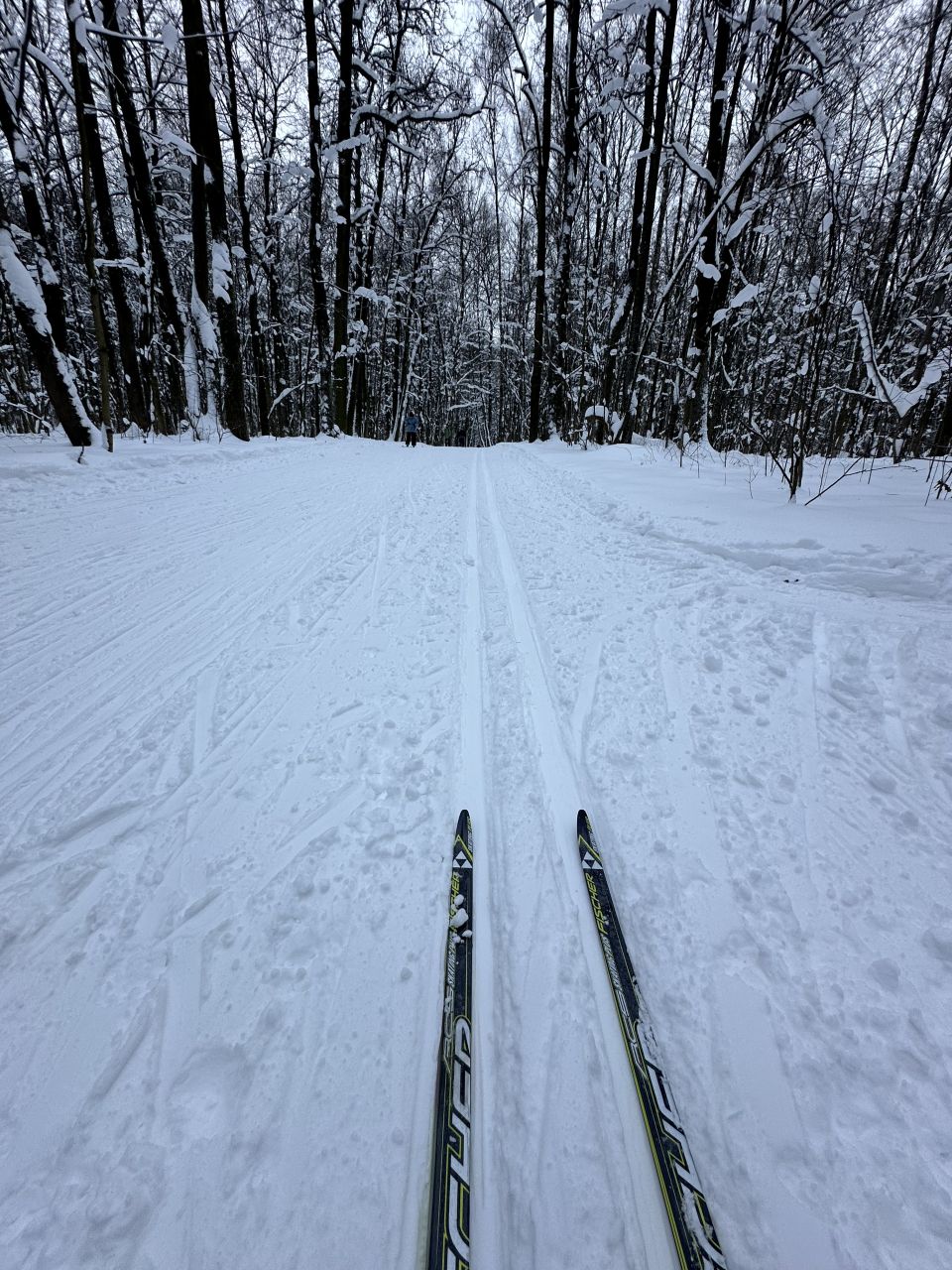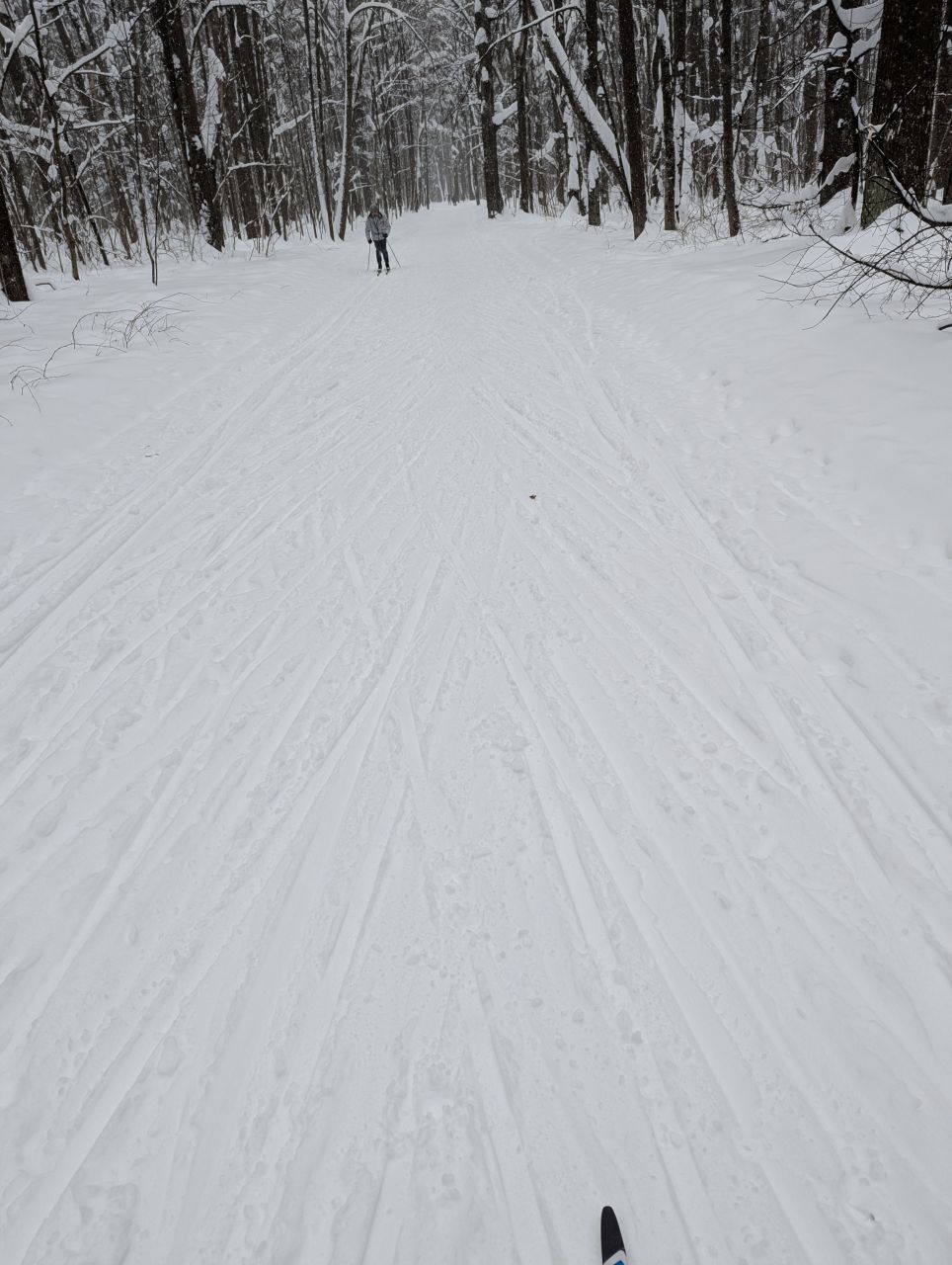 На равнине и на подьемах - везде - заснеженно, под крепления набивается снег, на равнине + укатали гуляющие огромную ложбину, так что ехать нормально невозможно. Трасса не укатана, не готова к тренировкам. Лучше воздержаться от похода в лес, чтобы не портить технику (если она конечно у вас есть), и сэкономить нервы, тк это не катание а издевательство над собой))).