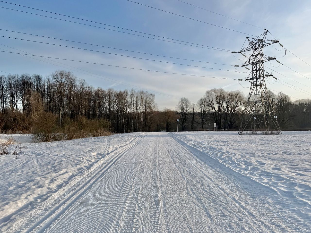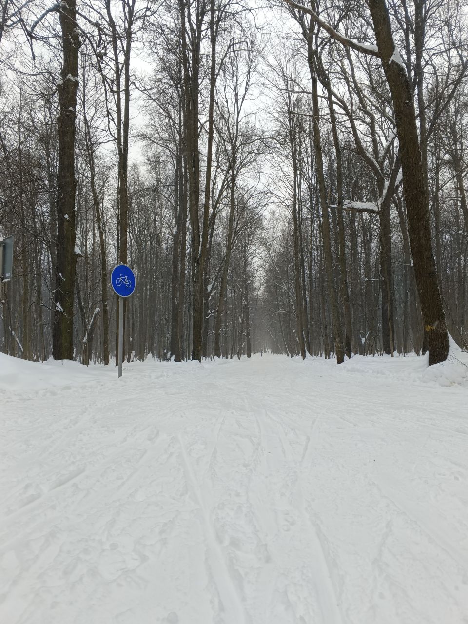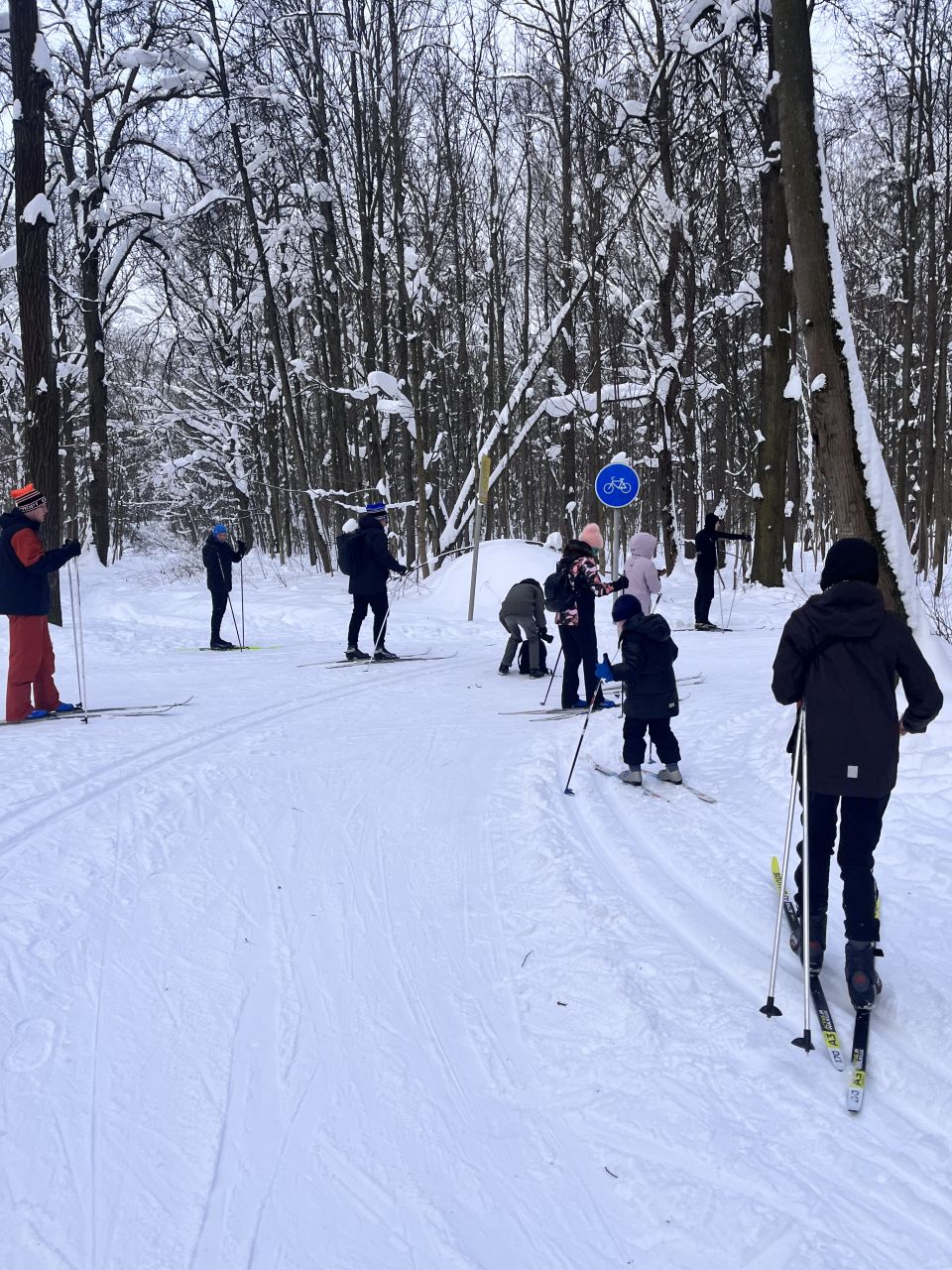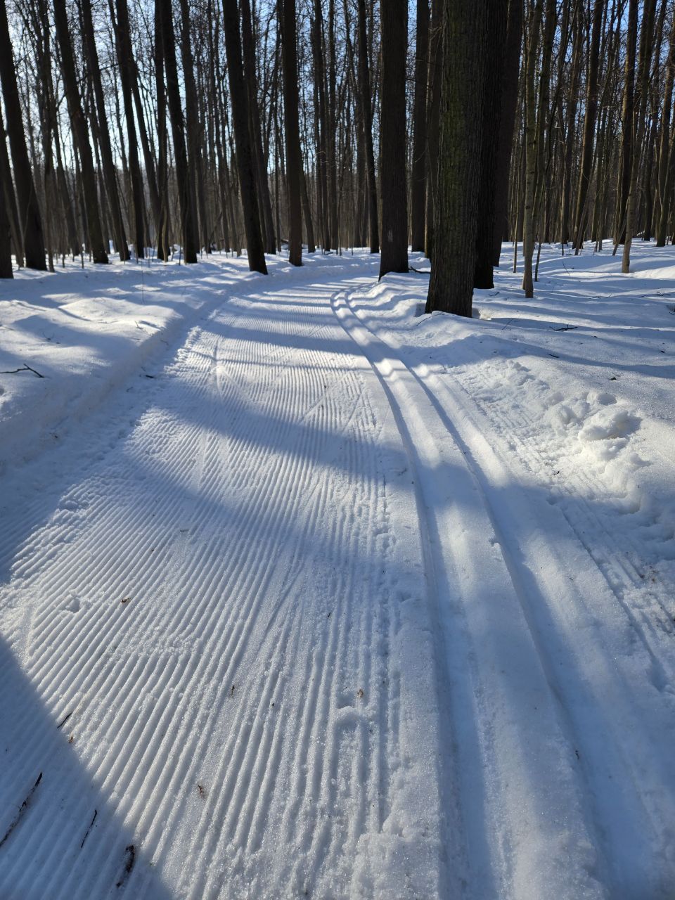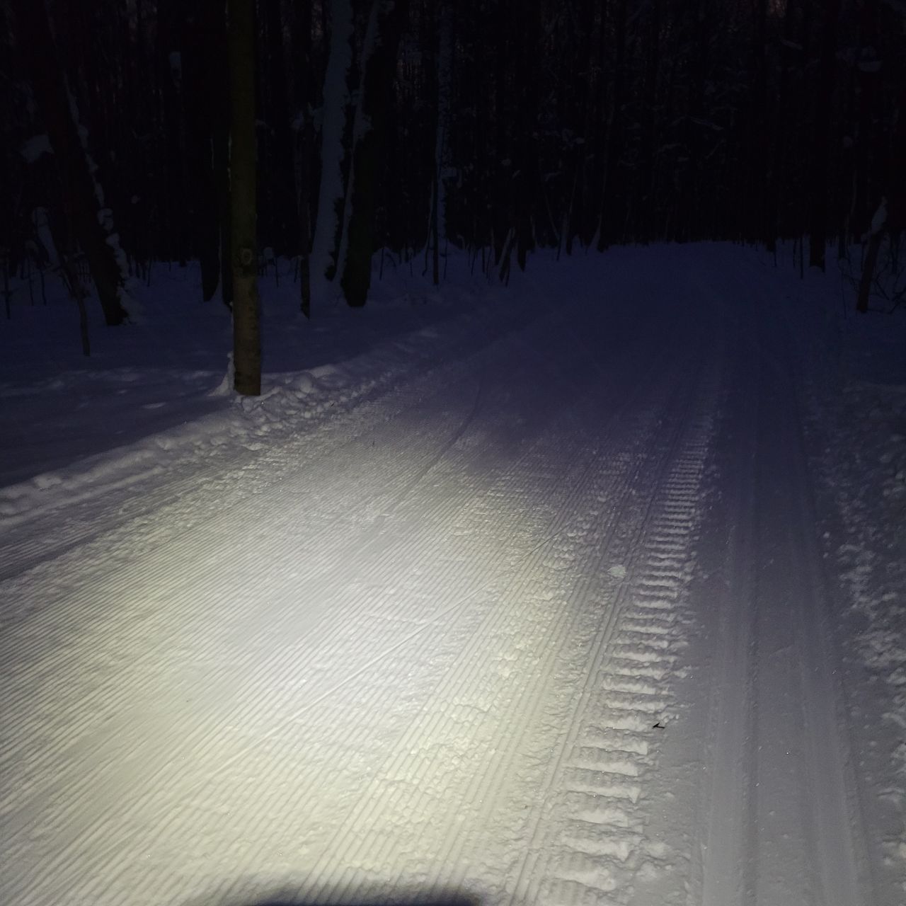 На равнине и на подьемах - везде - заснеженно, под крепления набивается снег, на равнине + укатали гуляющие огромную ложбину, так что ехать нормально невозможно. Трасса не укатана, не готова к тренировкам. Лучше воздержаться от похода в лес, чтобы не портить технику (если она конечно у вас есть), и сэкономить нервы, тк это не катание а издевательство над собой))).