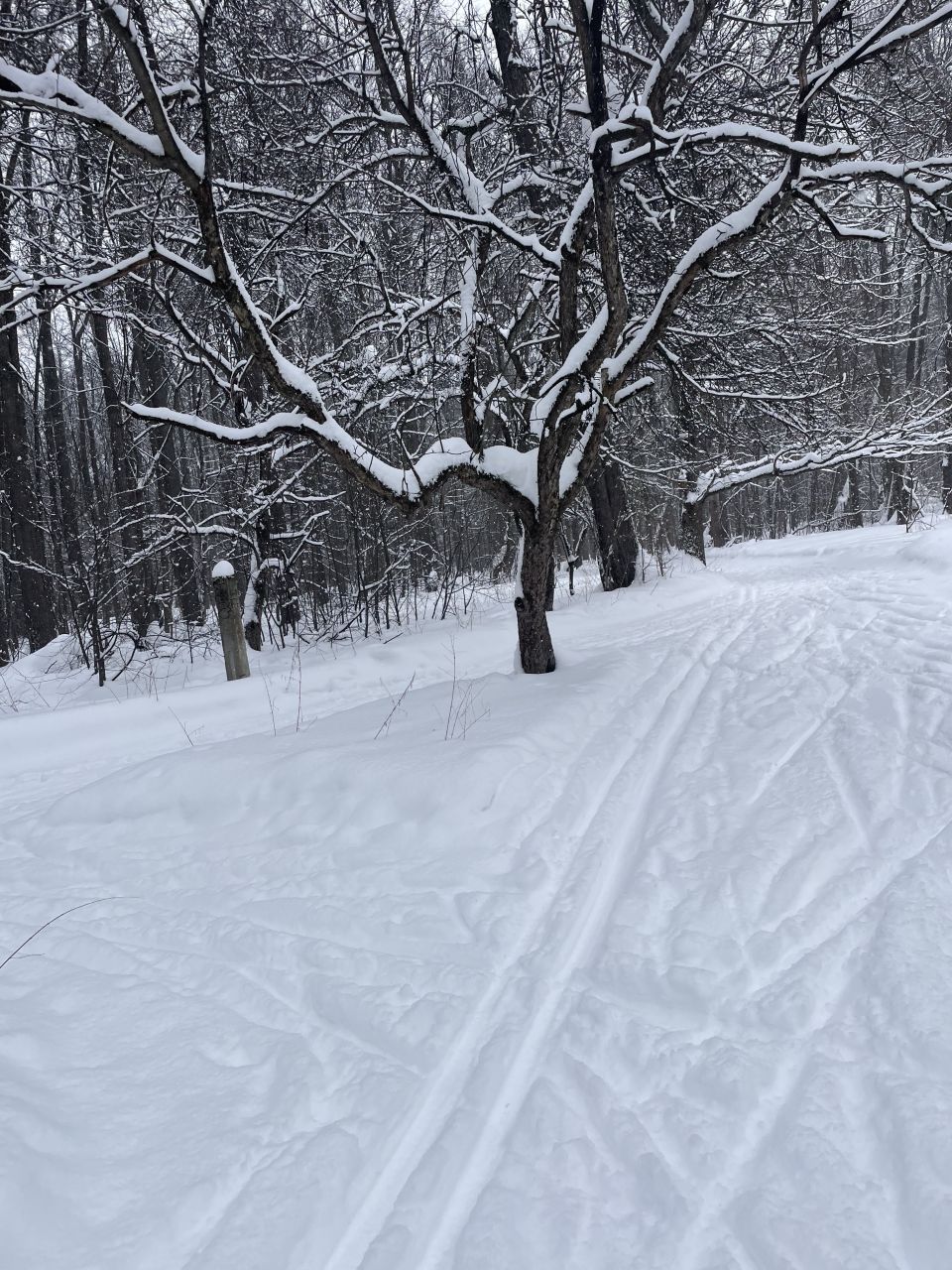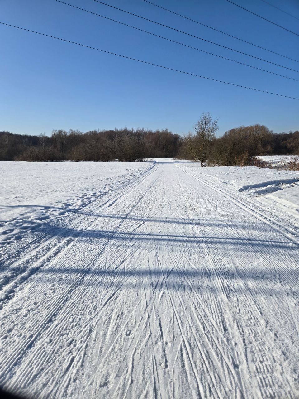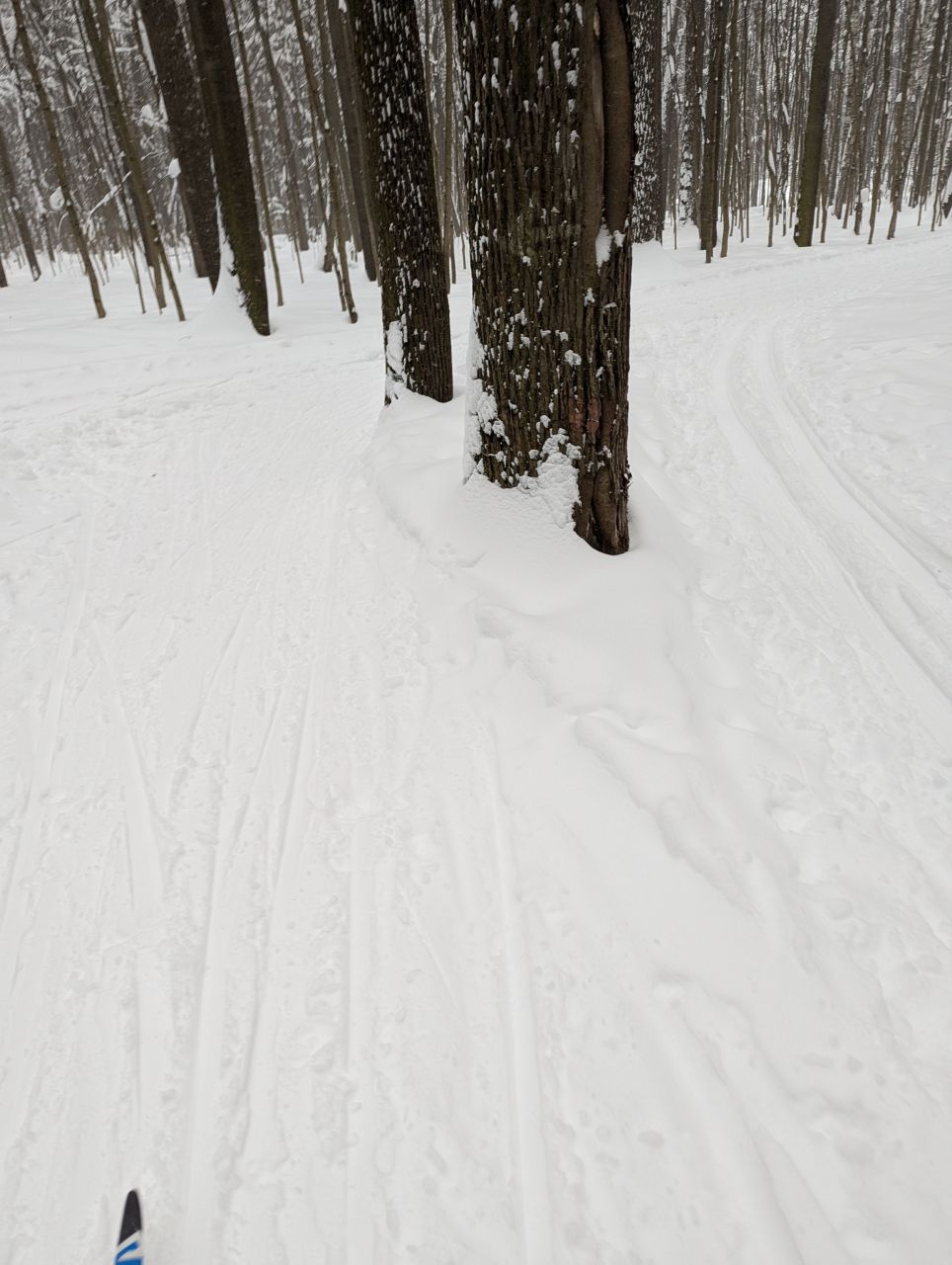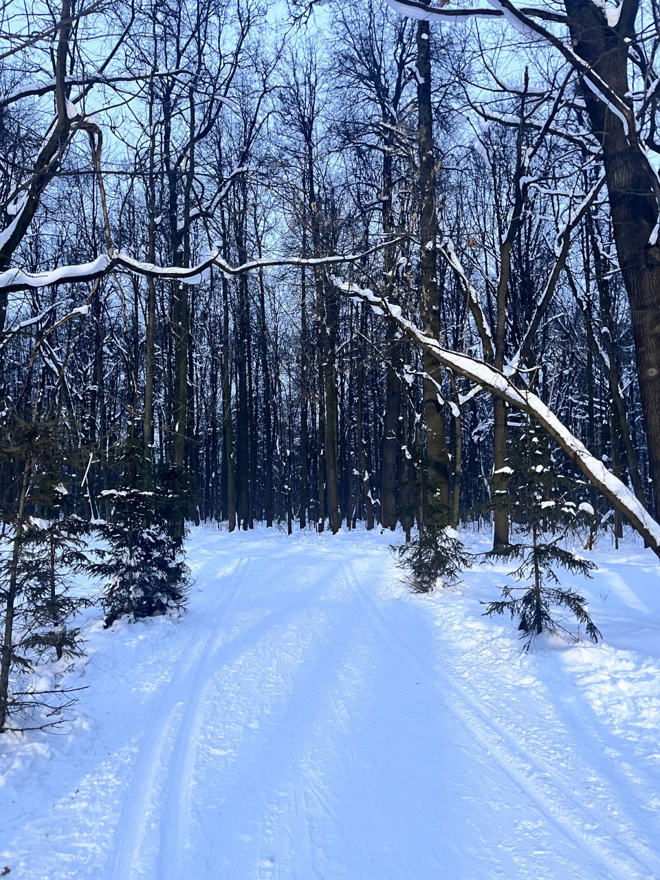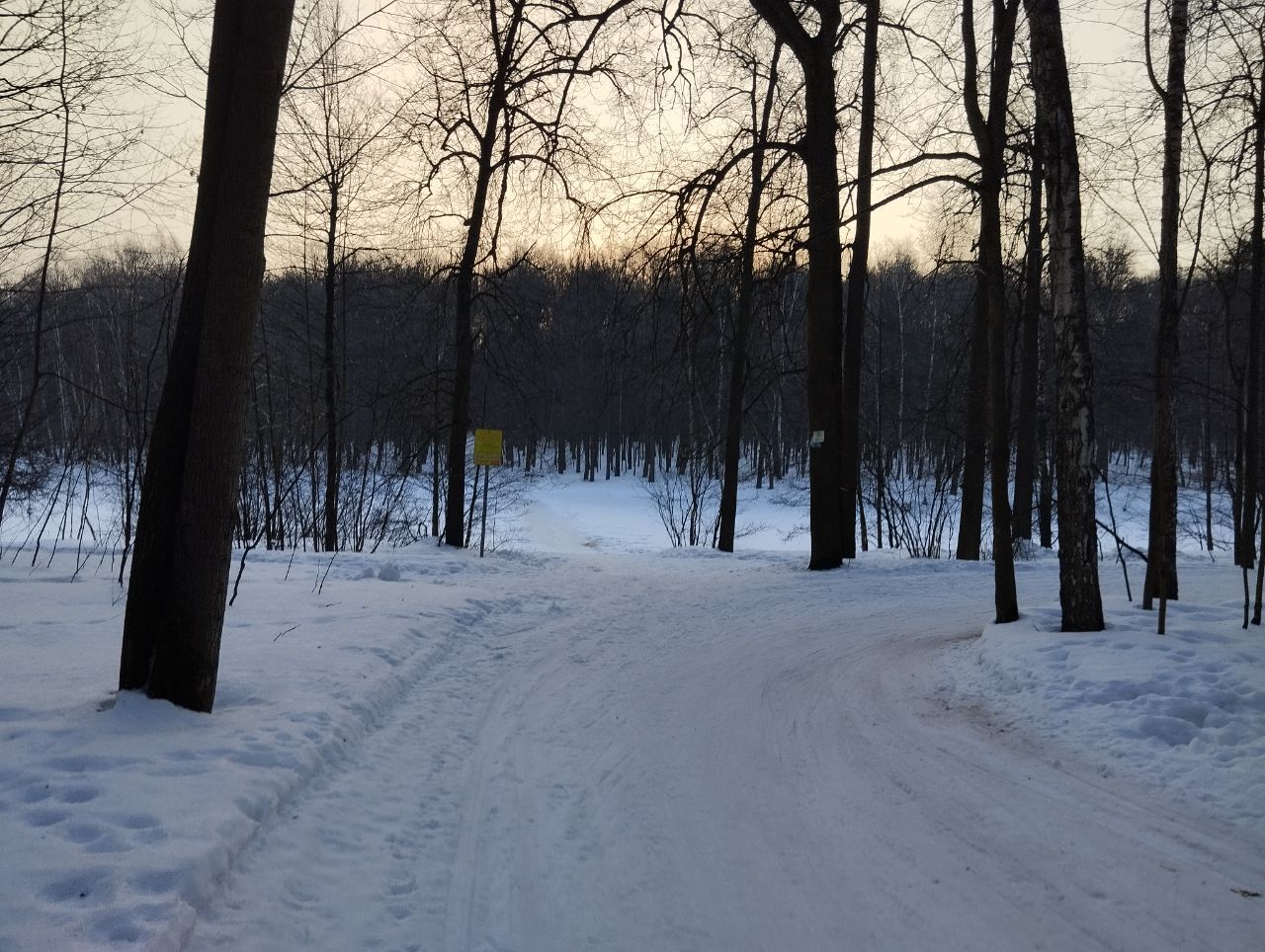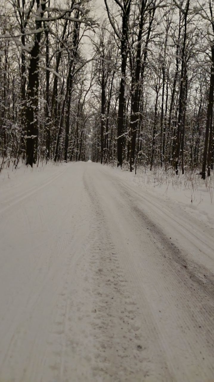 На равнине и на подьемах - везде - заснеженно, под крепления набивается снег, на равнине + укатали гуляющие огромную ложбину, так что ехать нормально невозможно. Трасса не укатана, не готова к тренировкам. Лучше воздержаться от похода в лес, чтобы не портить технику (если она конечно у вас есть), и сэкономить нервы, тк это не катание а издевательство над собой))).