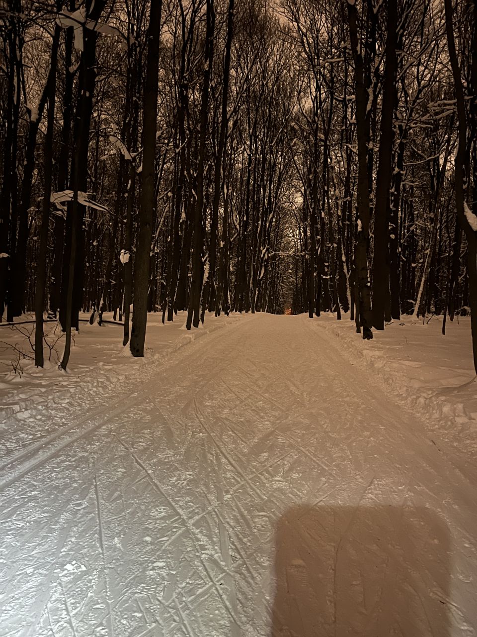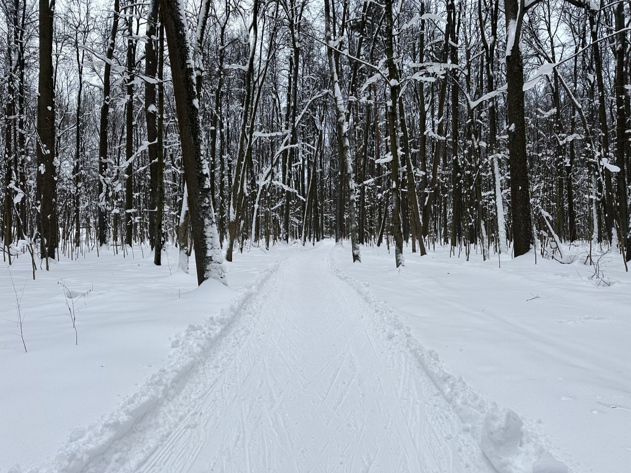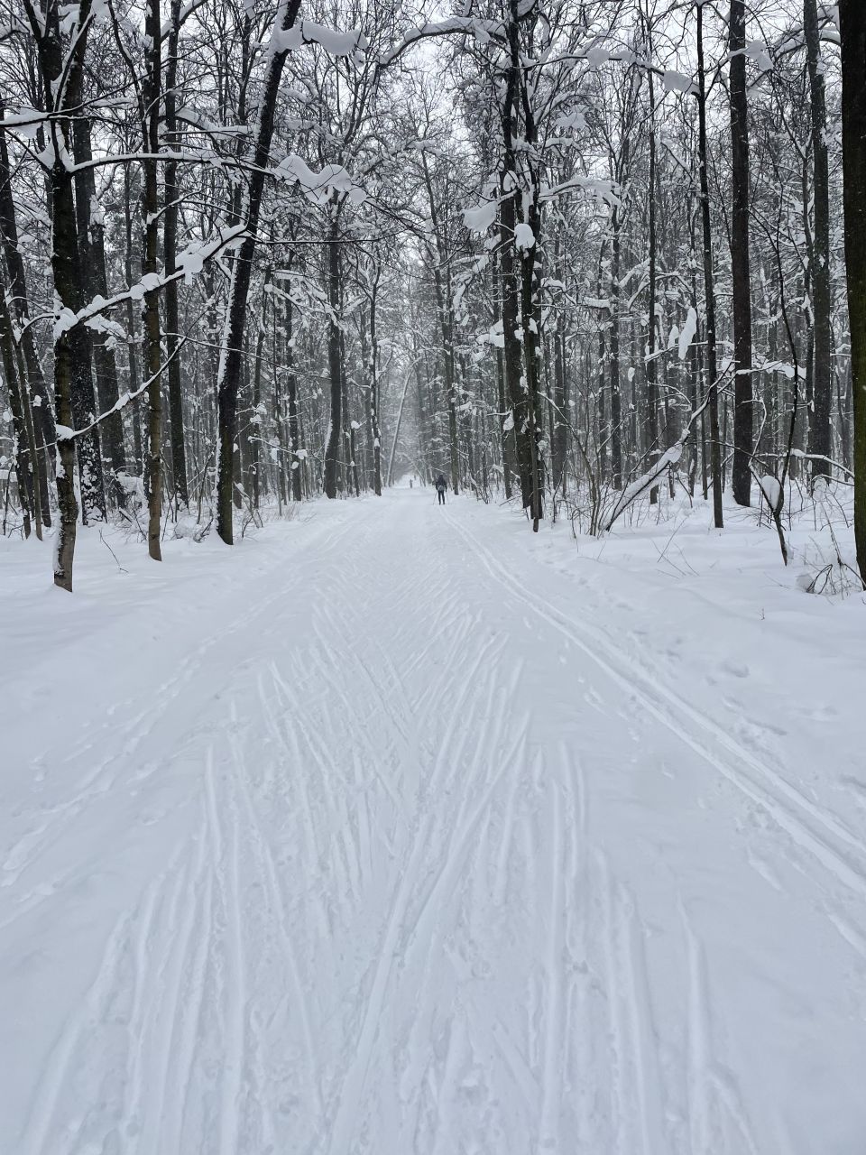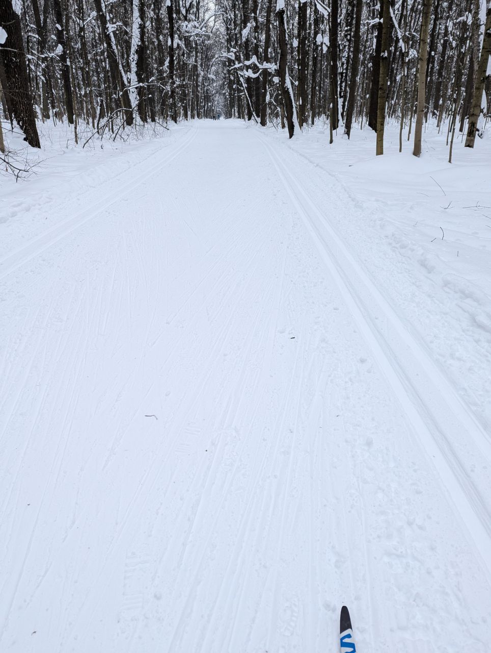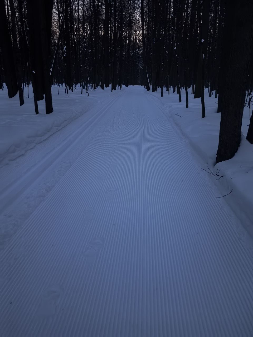 На равнине и на подьемах - везде - заснеженно, под крепления набивается снег, на равнине + укатали гуляющие огромную ложбину, так что ехать нормально невозможно. Трасса не укатана, не готова к тренировкам. Лучше воздержаться от похода в лес, чтобы не портить технику (если она конечно у вас есть), и сэкономить нервы, тк это не катание а издевательство над собой))).