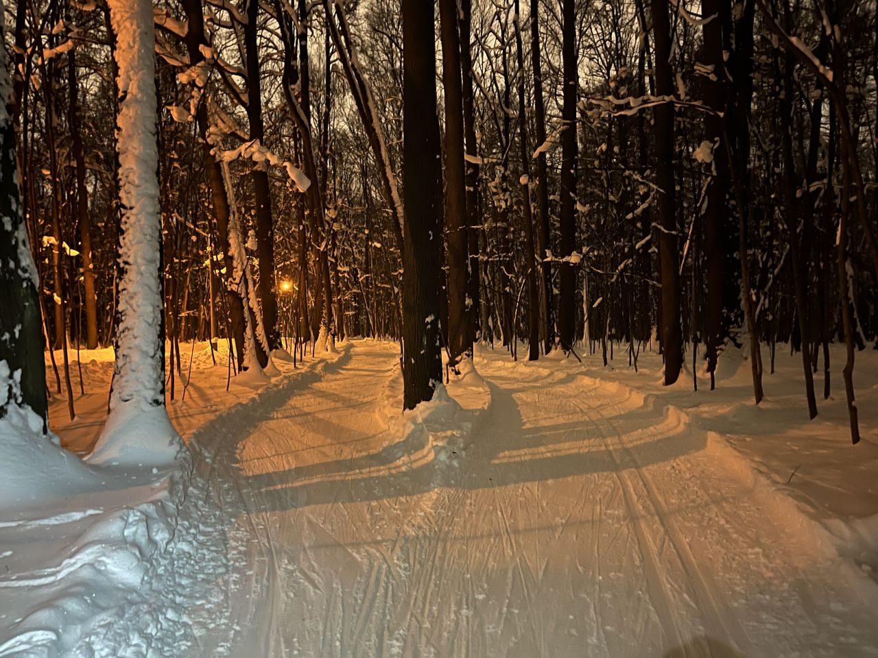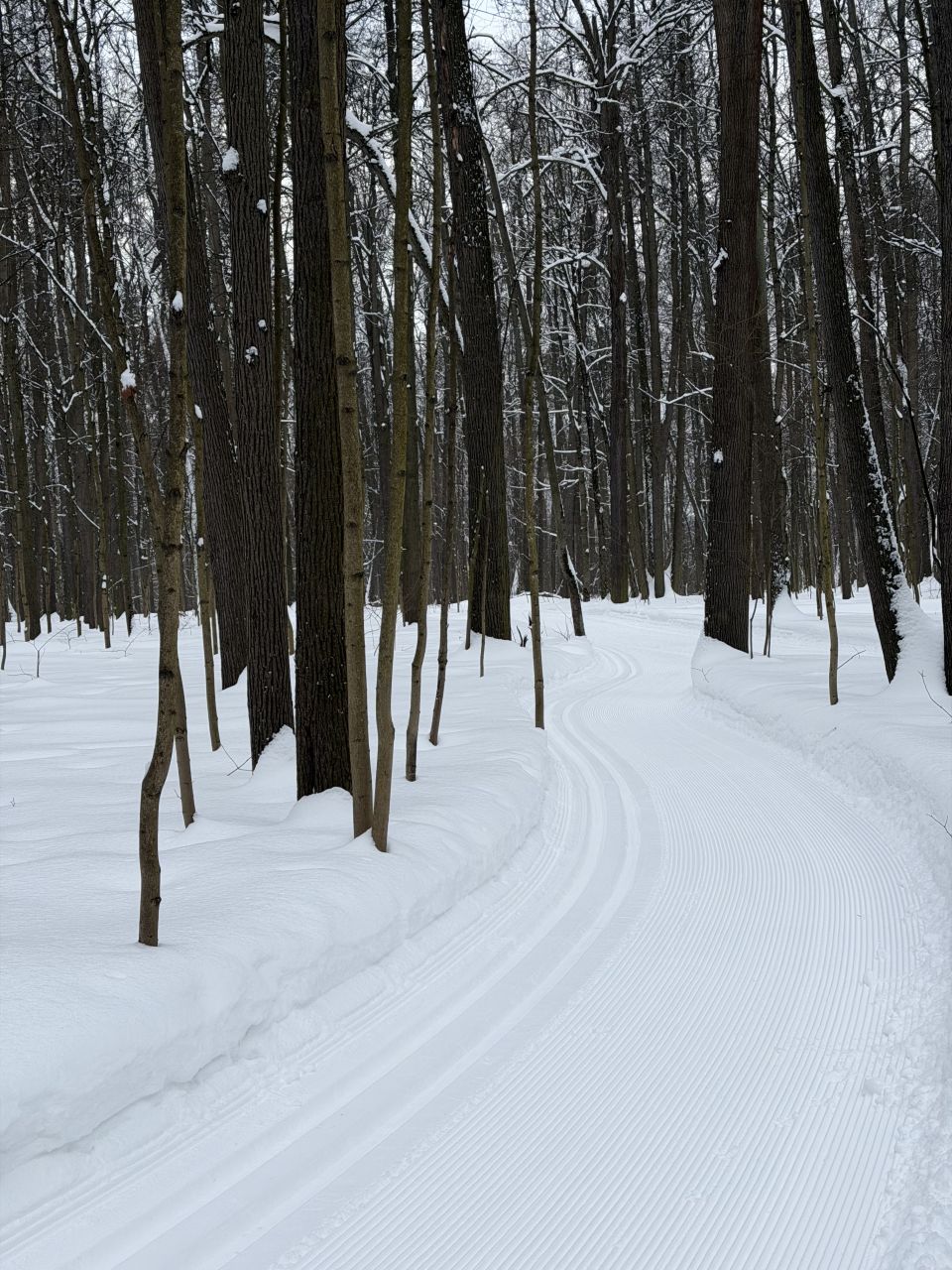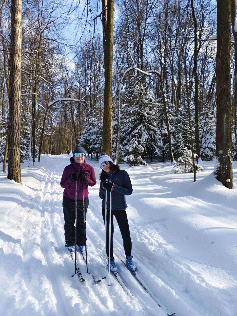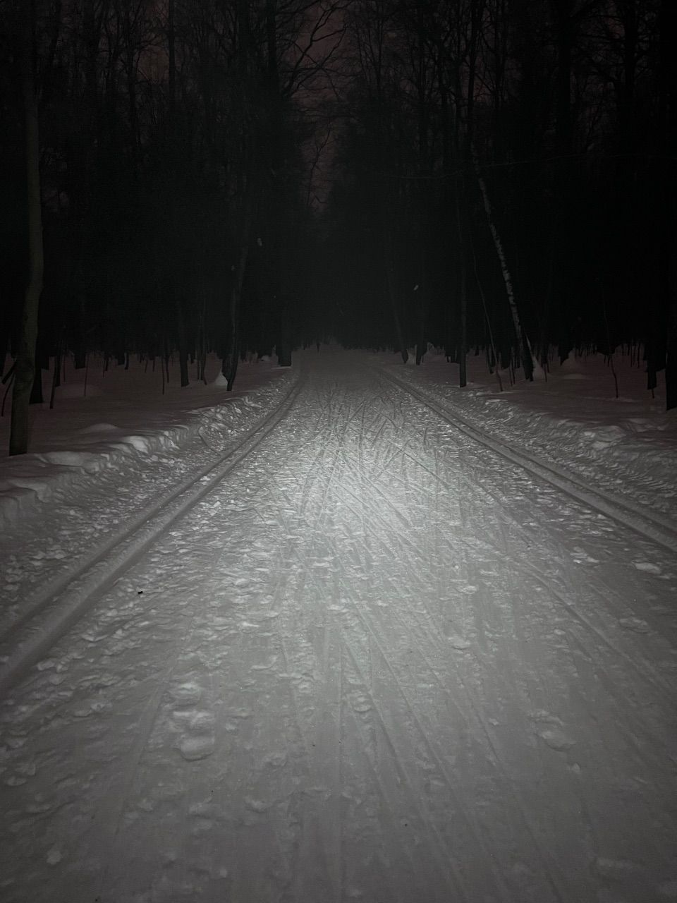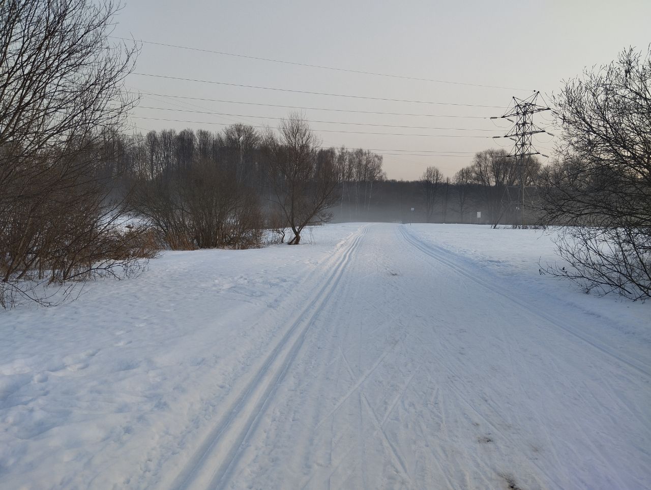 На равнине и на подьемах - везде - заснеженно, под крепления набивается снег, на равнине + укатали гуляющие огромную ложбину, так что ехать нормально невозможно. Трасса не укатана, не готова к тренировкам. Лучше воздержаться от похода в лес, чтобы не портить технику (если она конечно у вас есть), и сэкономить нервы, тк это не катание а издевательство над собой))).