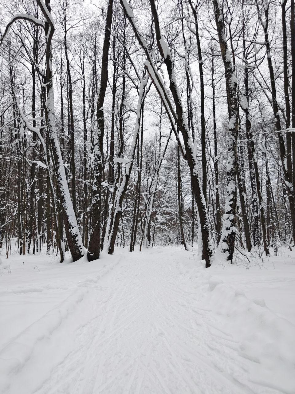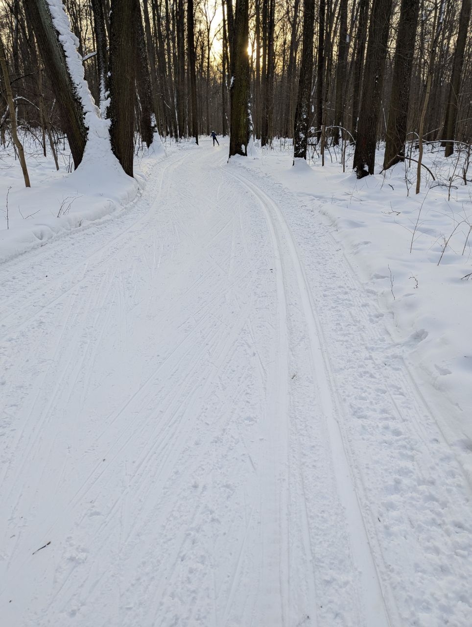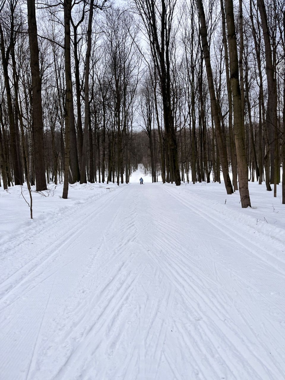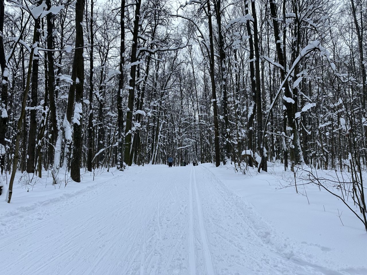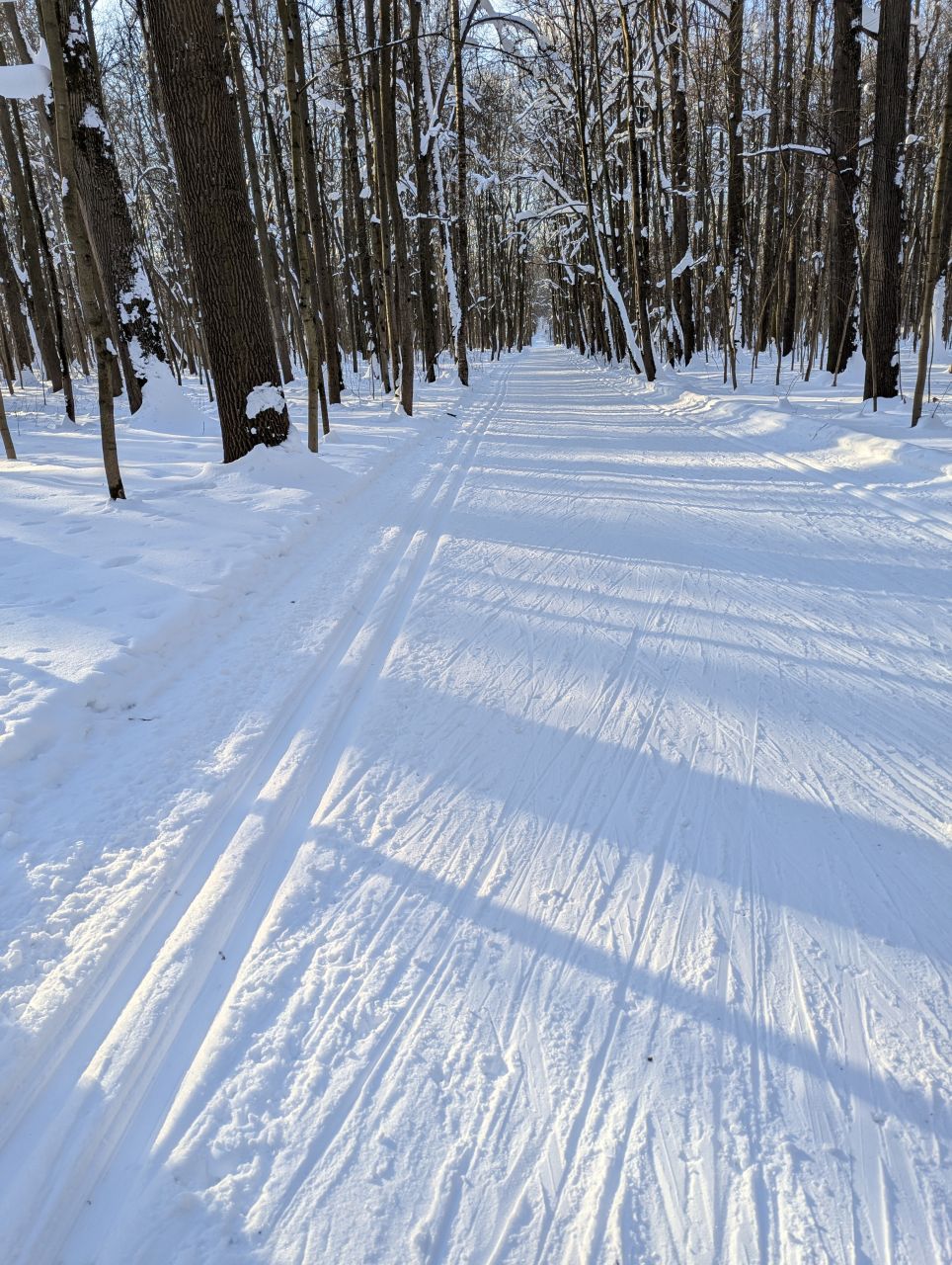 На равнине и на подьемах - везде - заснеженно, под крепления набивается снег, на равнине + укатали гуляющие огромную ложбину, так что ехать нормально невозможно. Трасса не укатана, не готова к тренировкам. Лучше воздержаться от похода в лес, чтобы не портить технику (если она конечно у вас есть), и сэкономить нервы, тк это не катание а издевательство над собой))).