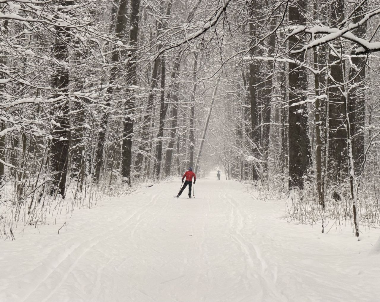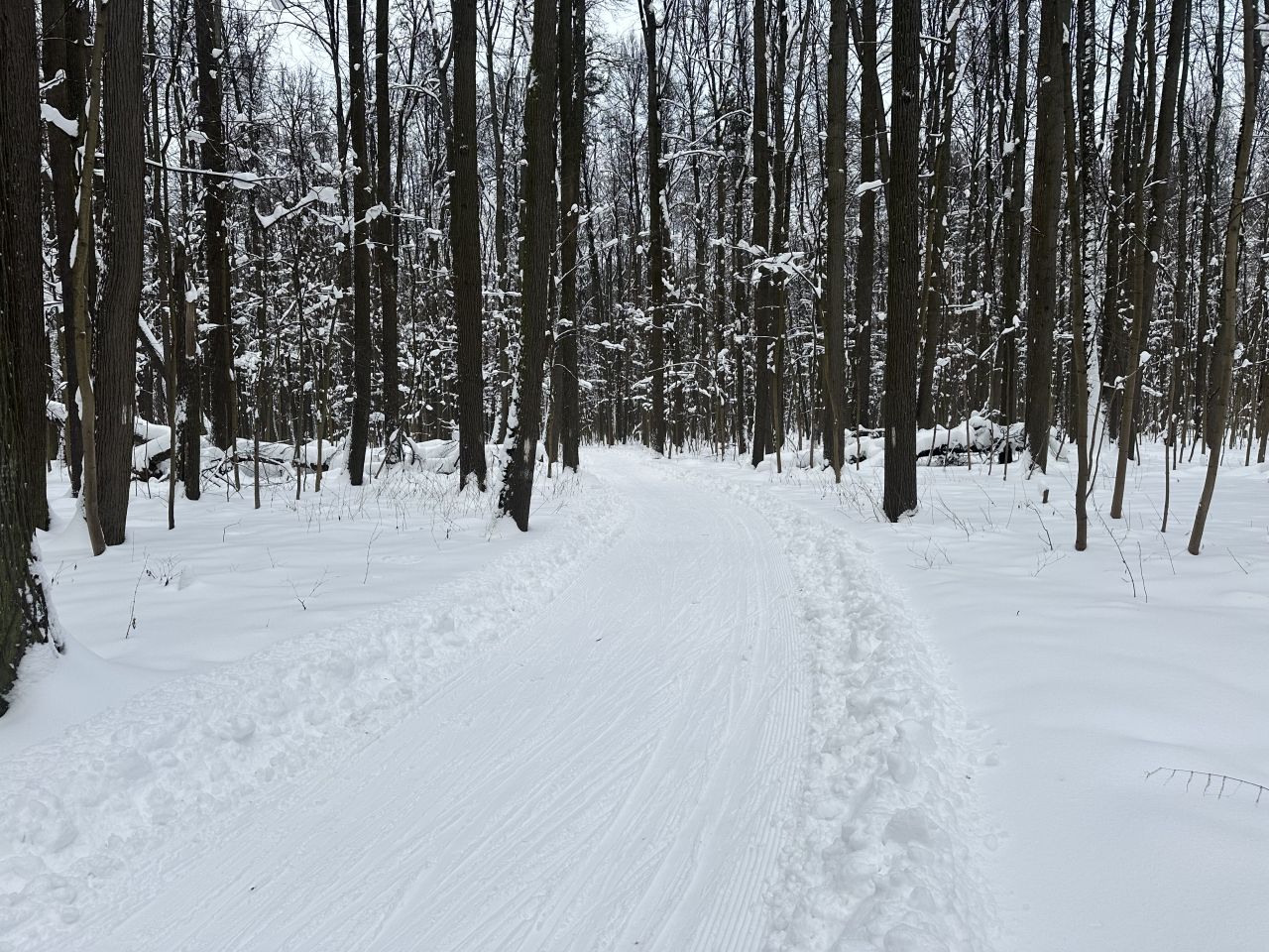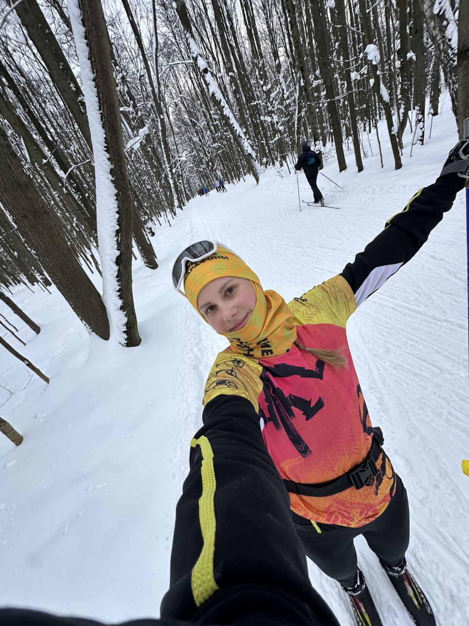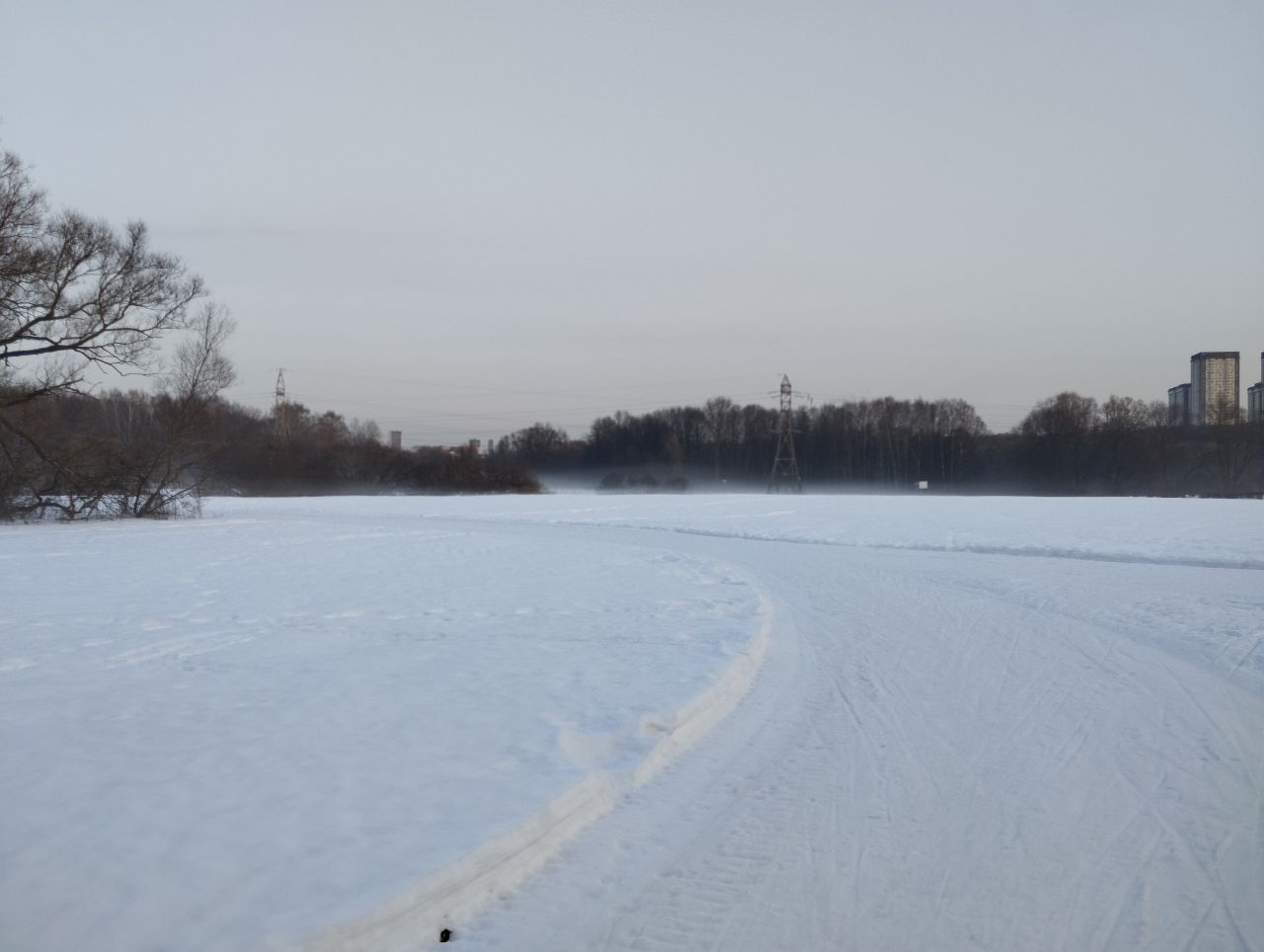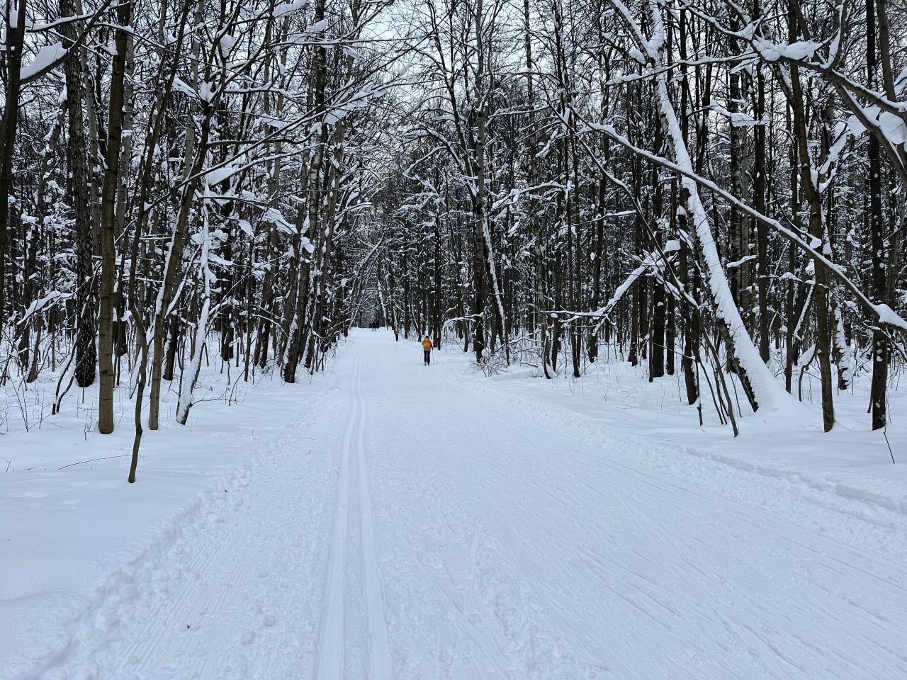 На равнине и на подьемах - везде - заснеженно, под крепления набивается снег, на равнине + укатали гуляющие огромную ложбину, так что ехать нормально невозможно. Трасса не укатана, не готова к тренировкам. Лучше воздержаться от похода в лес, чтобы не портить технику (если она конечно у вас есть), и сэкономить нервы, тк это не катание а издевательство над собой))).
