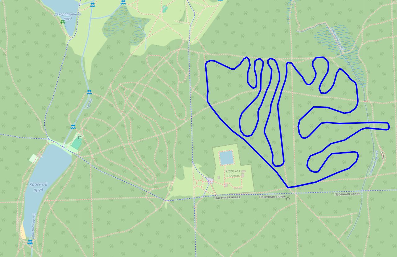 Для любителей классики в Измайлово подготовили за пасекой петли в параллель. Заезжал о пасечного забора на спуск к Совиному ручью. Спуски к ручью три и четыре довольно экстремальны, с разворотами. Немного зацепили землю. Палки пока проваливаться. Другая часть - внутри пасечного круга вполне комфортна. Лыжи больше 2 метров не рекомендую. Обзорная экскурсия заняла 30 минут. Выехал у к пасечному забору же.