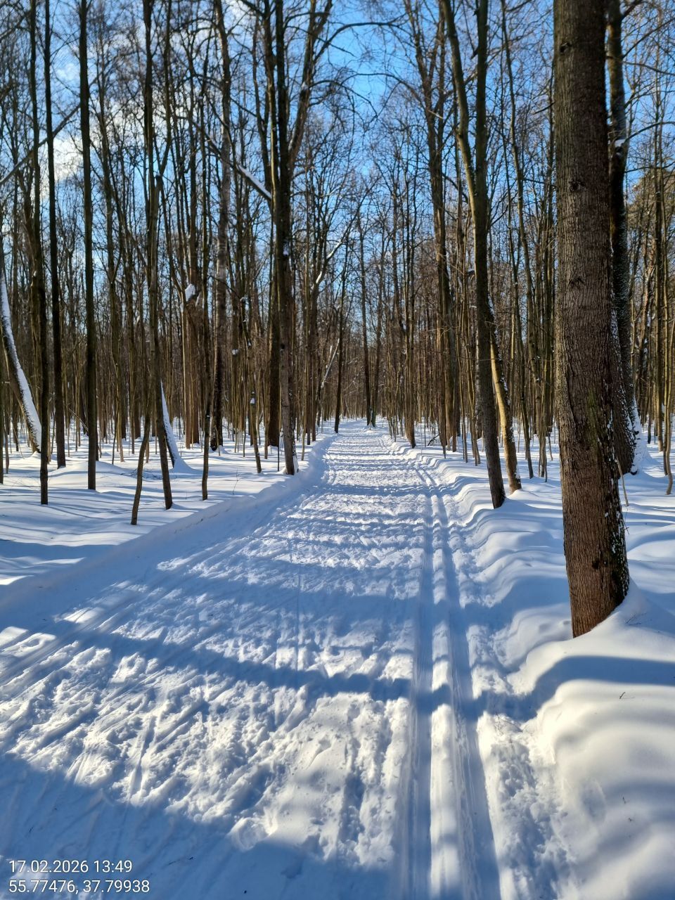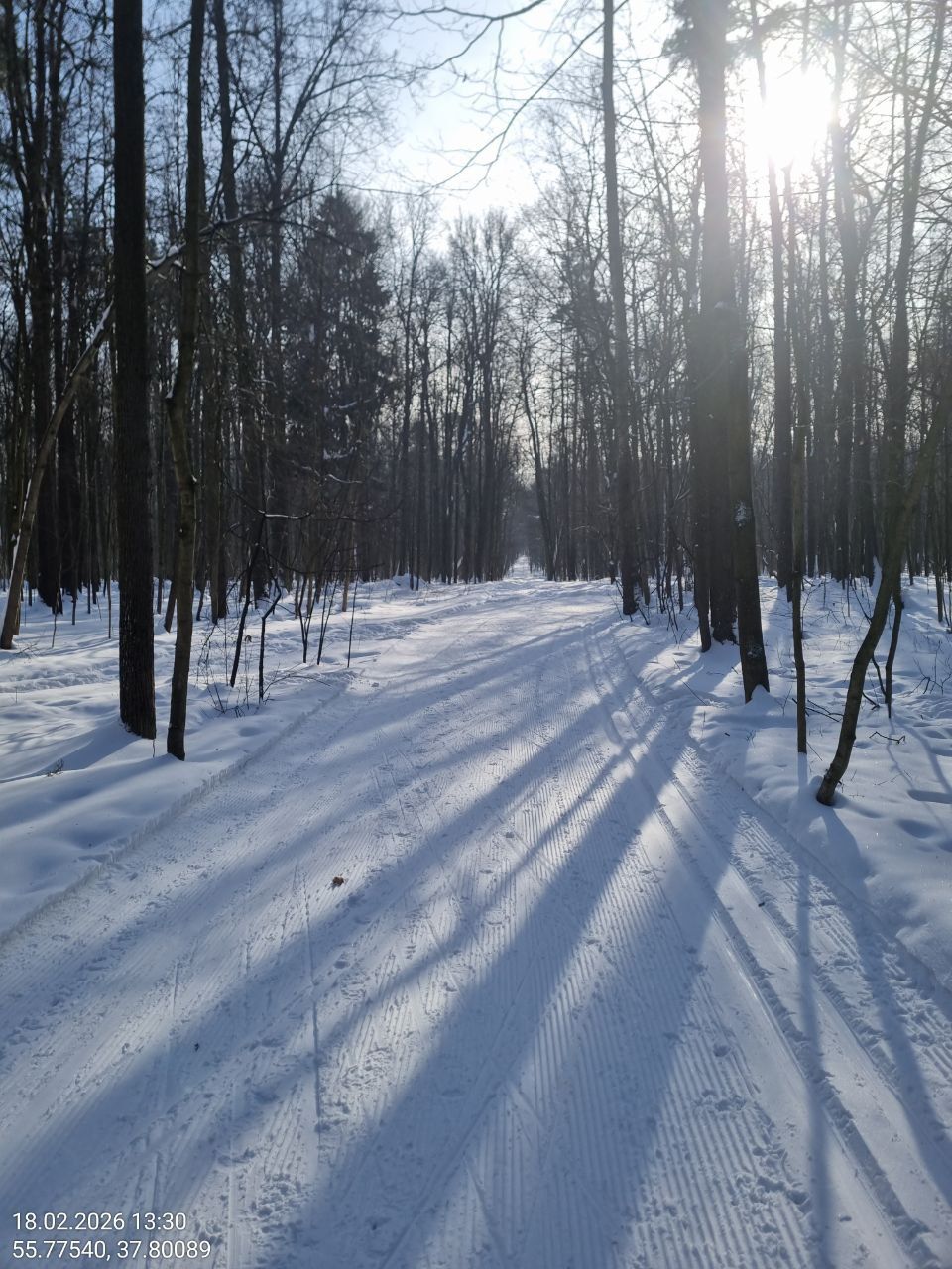 Отличная подготовка трассы. Плотно, ровно, лыжня присутствует. Морозно, но катит на такой трассе отлично. Следует быть аккуратнее и поберечь лыжи в тех местах, где трасса пересекает почищенные пешеходные дорожки, т.к. там грязно, присутствуют мелкие камешки.