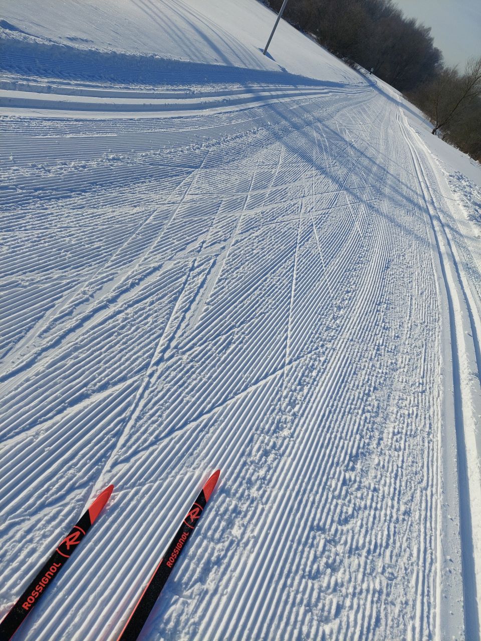 Трасса шикарная. Сегодня ехал только по трёхкилометровому отрезку. Ратрака, похоже, ещё пока не было. Но трасса укатана и катится великолепно – лыжники постарались:)
