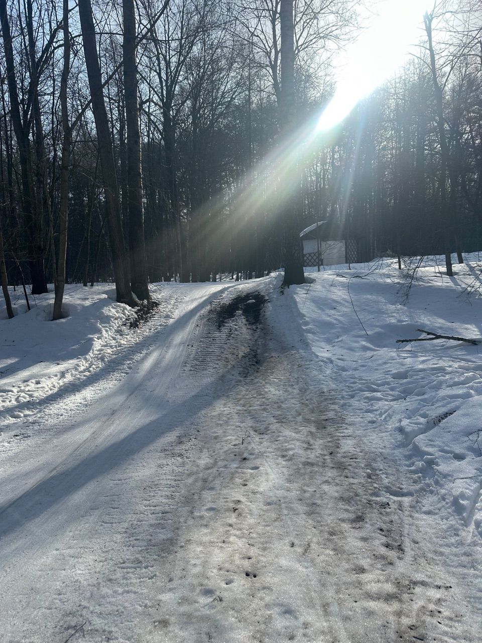 Единственный проблемный участок - спуск за беседкой подтаял (на фото). Переезды аллей везде подсыпаны, лыжи снимать не надо.