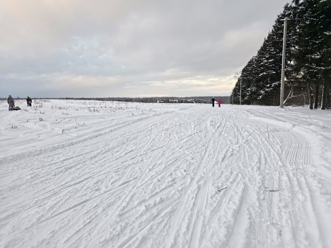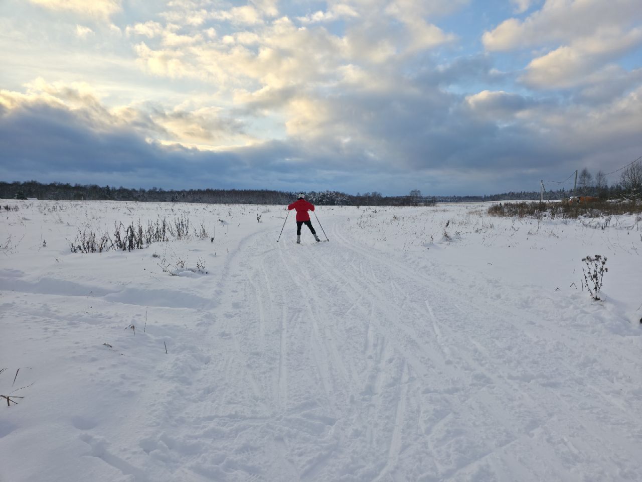 Трасса преимущественно равнинная, проходит по полям. Есть прокат, он расположен у садового центра. Координаты проката: [55.709005, 36.677714], тел. +7 (965) 308-73-00.