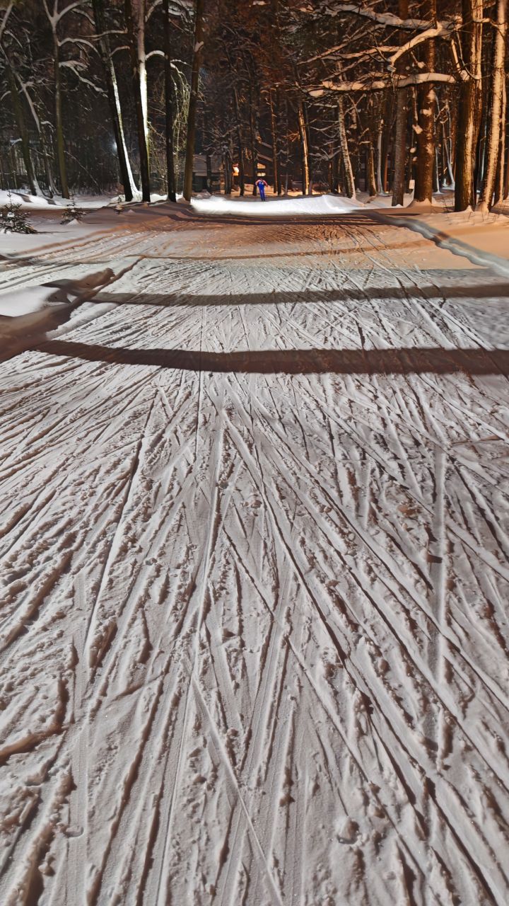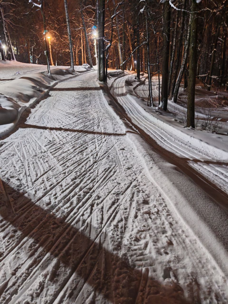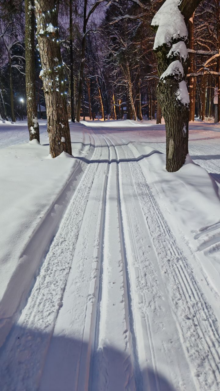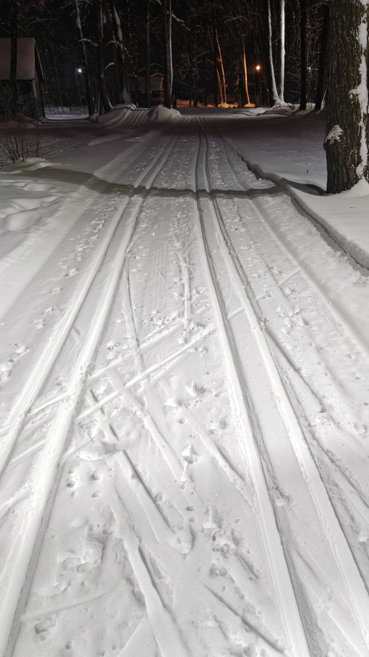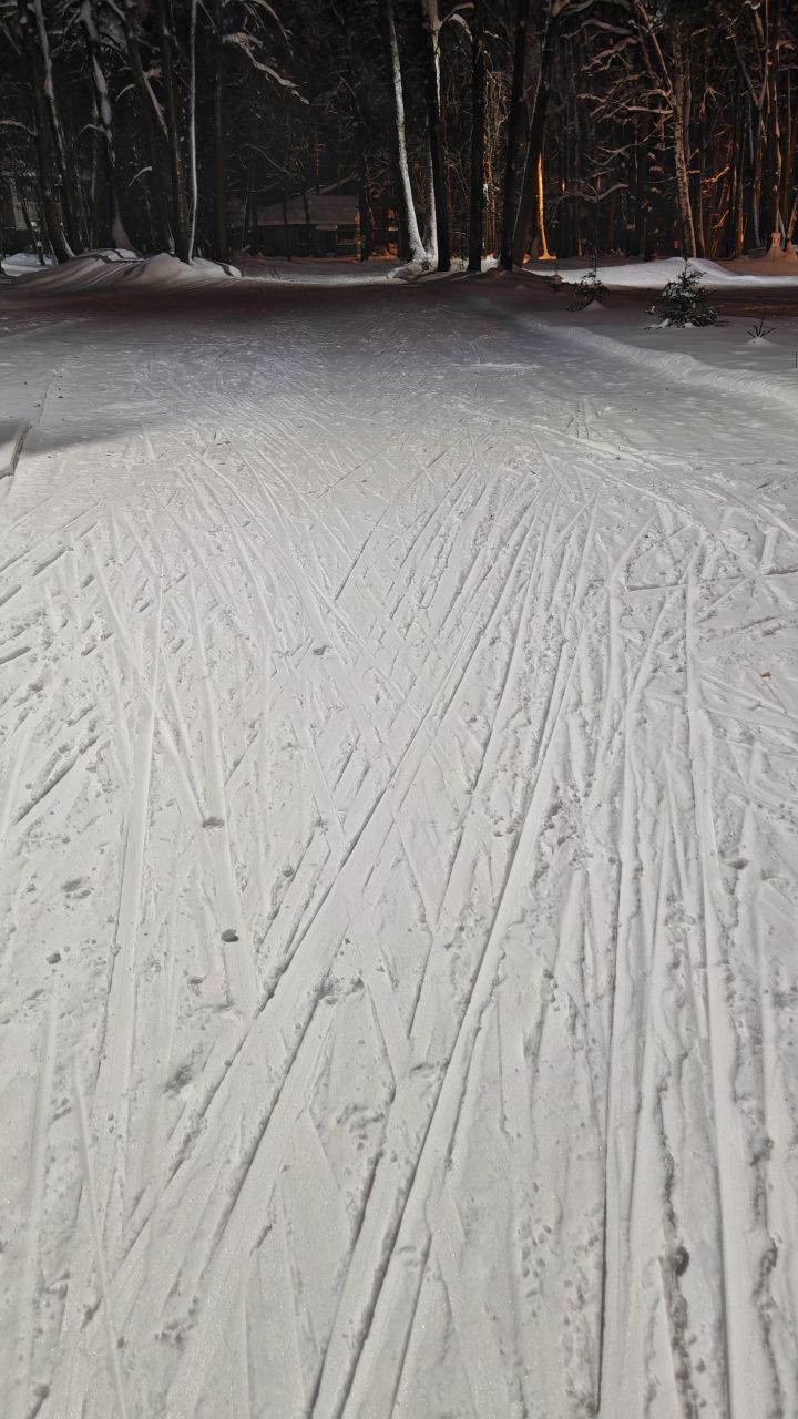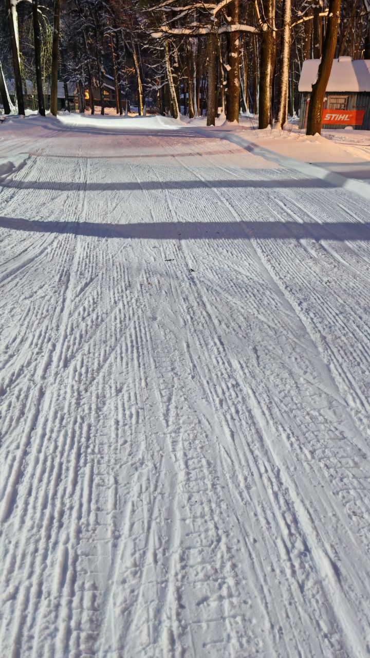 Вечером закатали свежий снег. Трасса подготовлена. И конёк, и классика. Трасса мягковата, но не критически, палки не проваливаются, лыжи не зарываются.