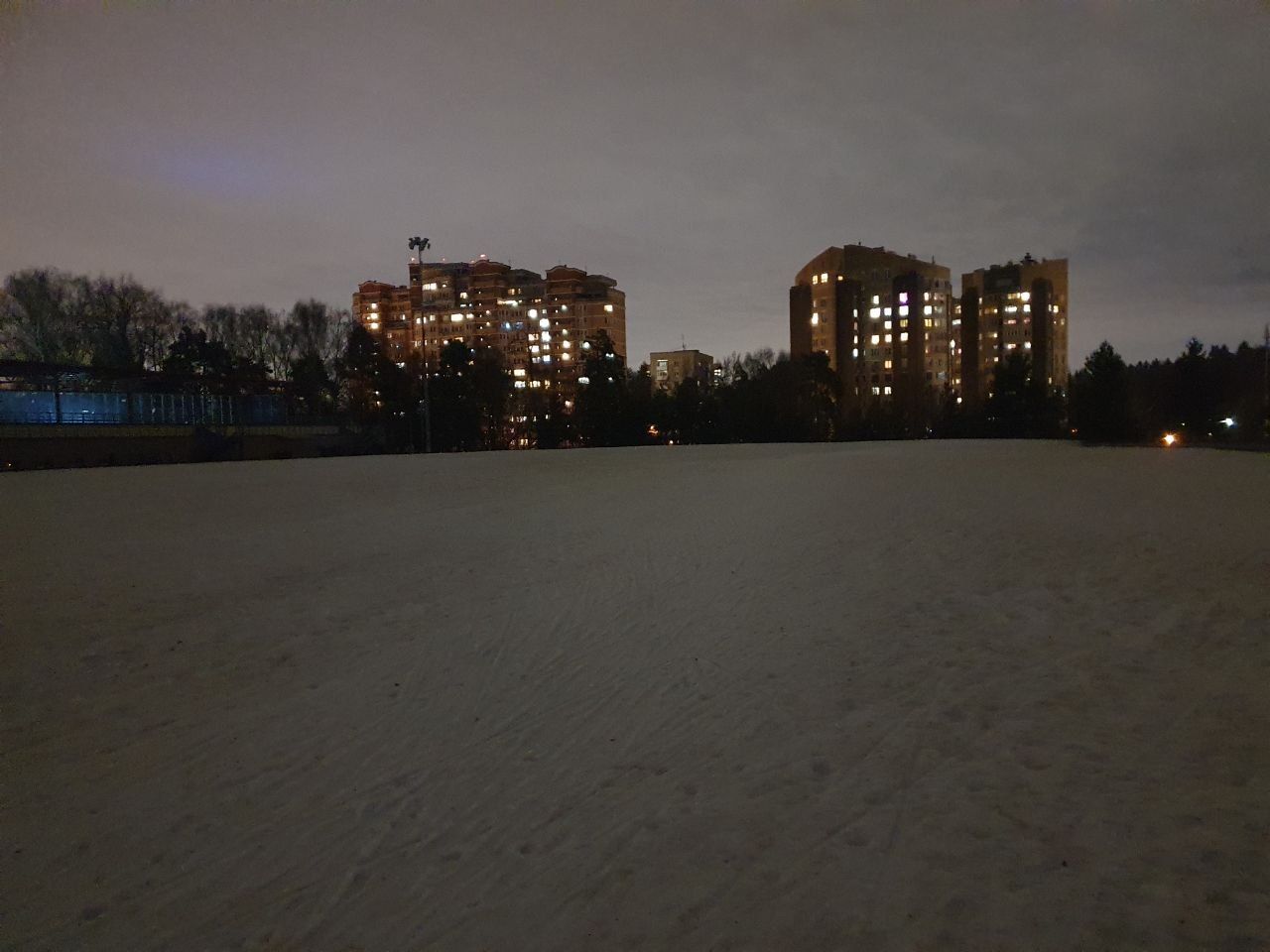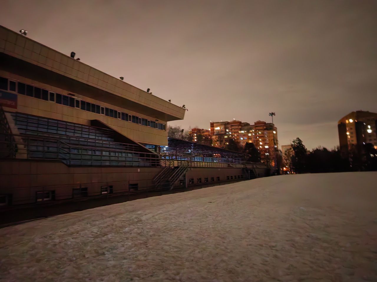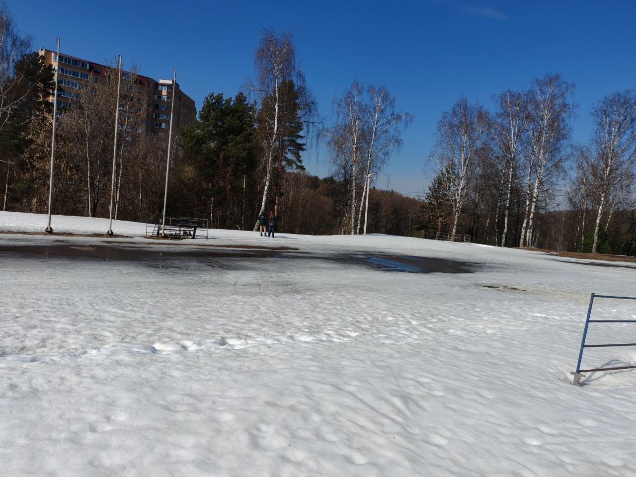 Снег стал чуть грязнее, нижний стадион весь с промокшими участками. Через пару дней на нижнем стадионе разворачиваться придётся раньше (посередине).