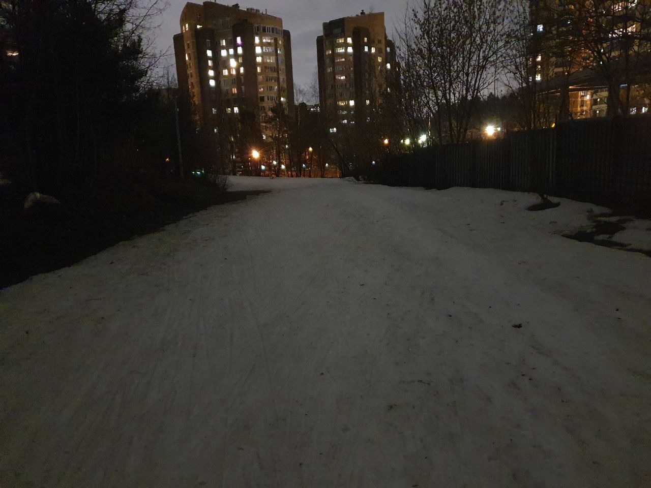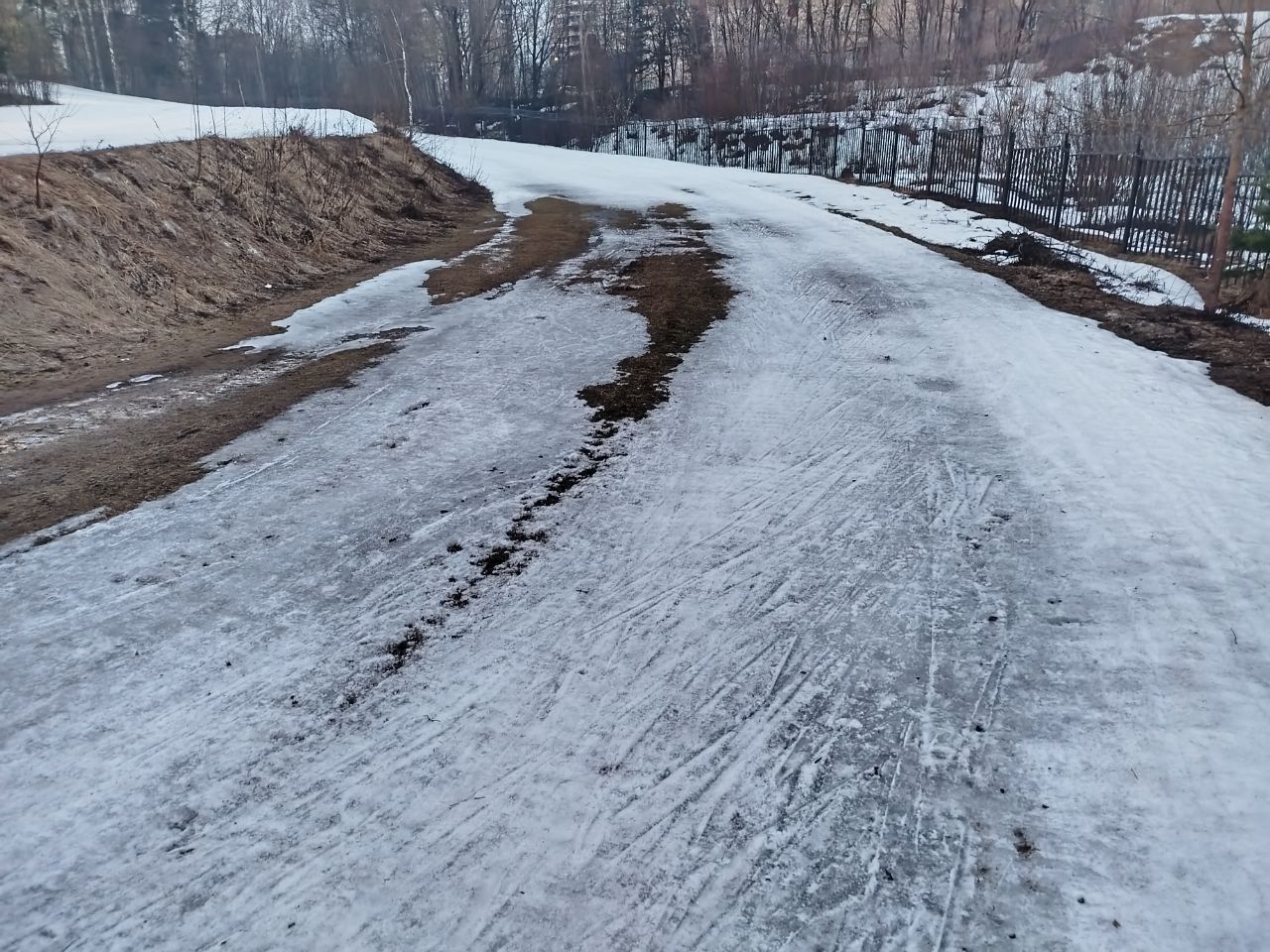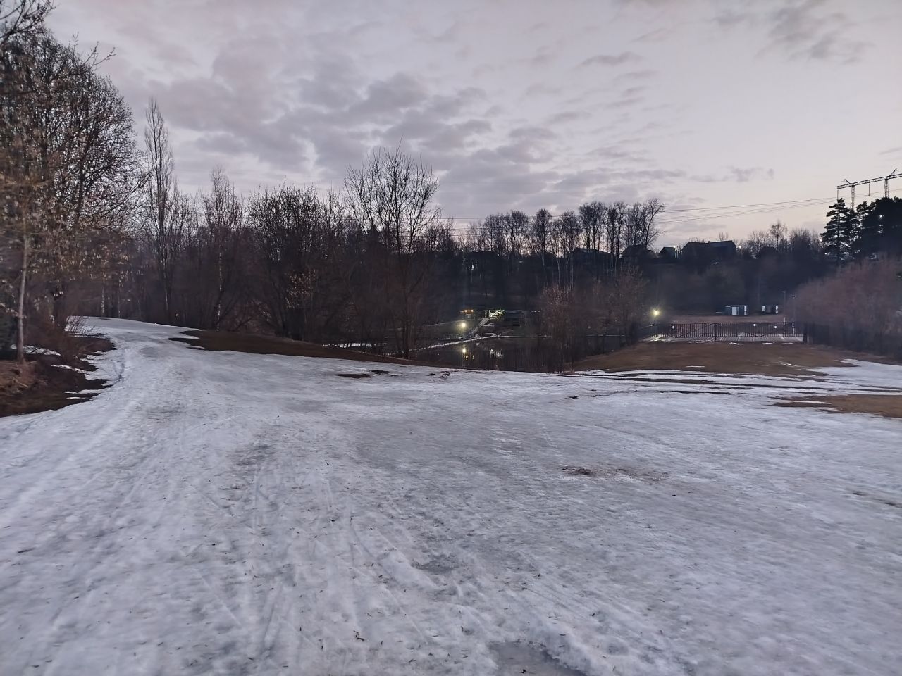На трассе появилось много разрывов. Наверху кататься невозможно из-за каких-то больших масляных цветных пятен на снегу, которые останавливают лыжи. В итоге покатался в гору/с горы на северном склоне со стороны плотины. И это закрытие сезона. На лыжном стадионе больше делать нечего!