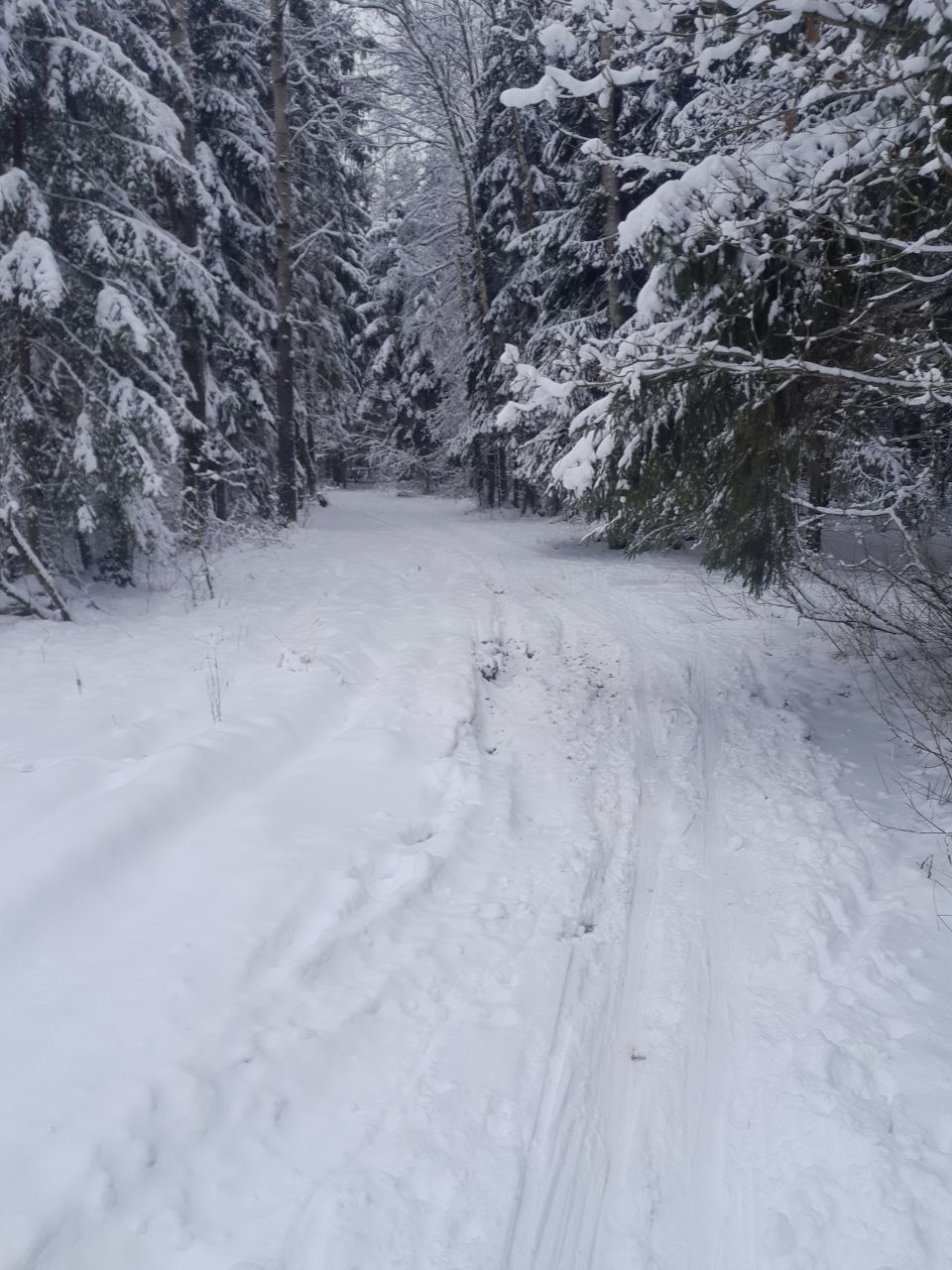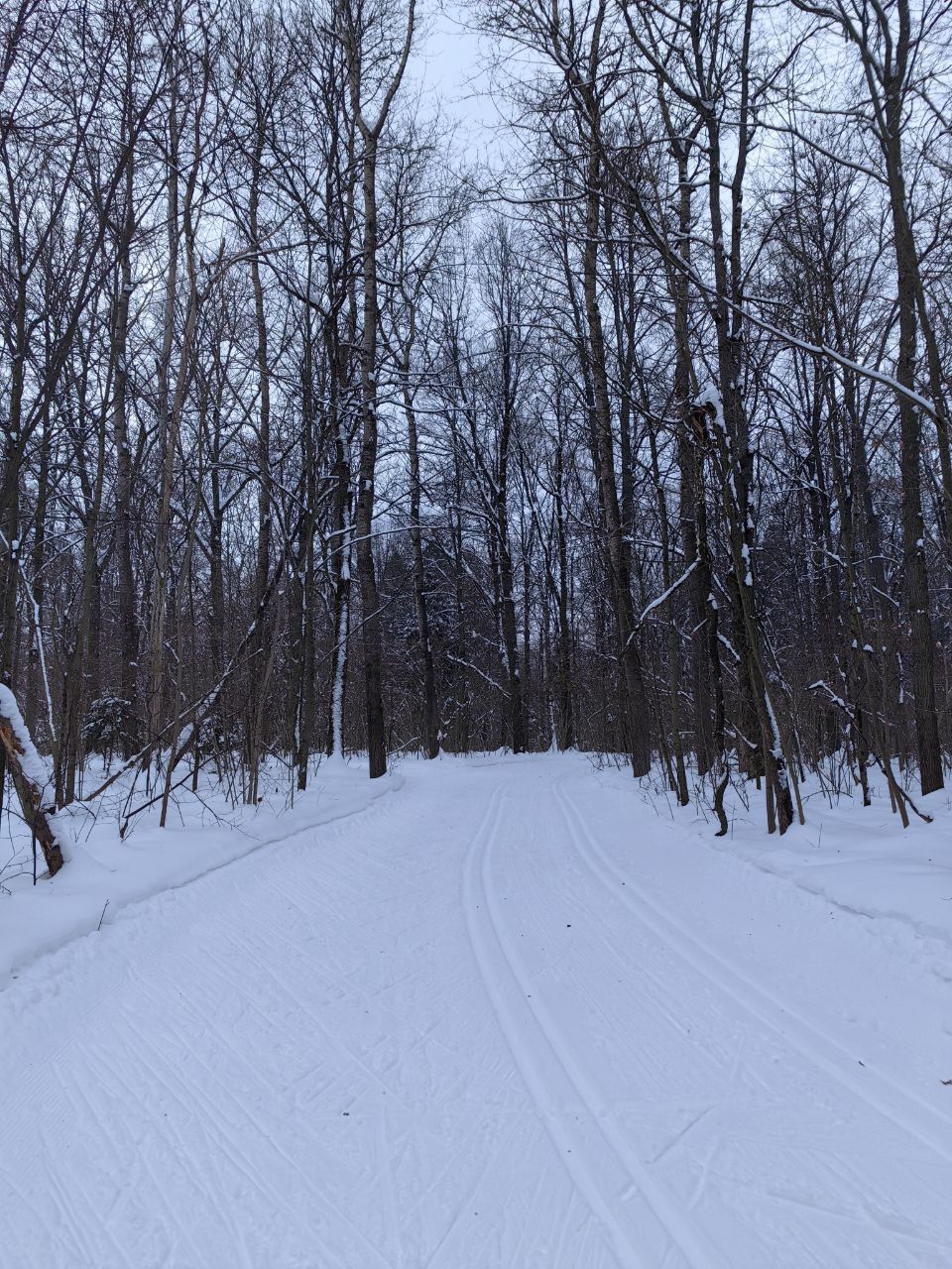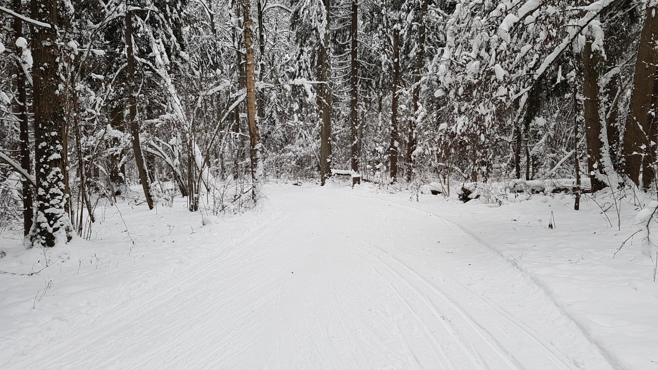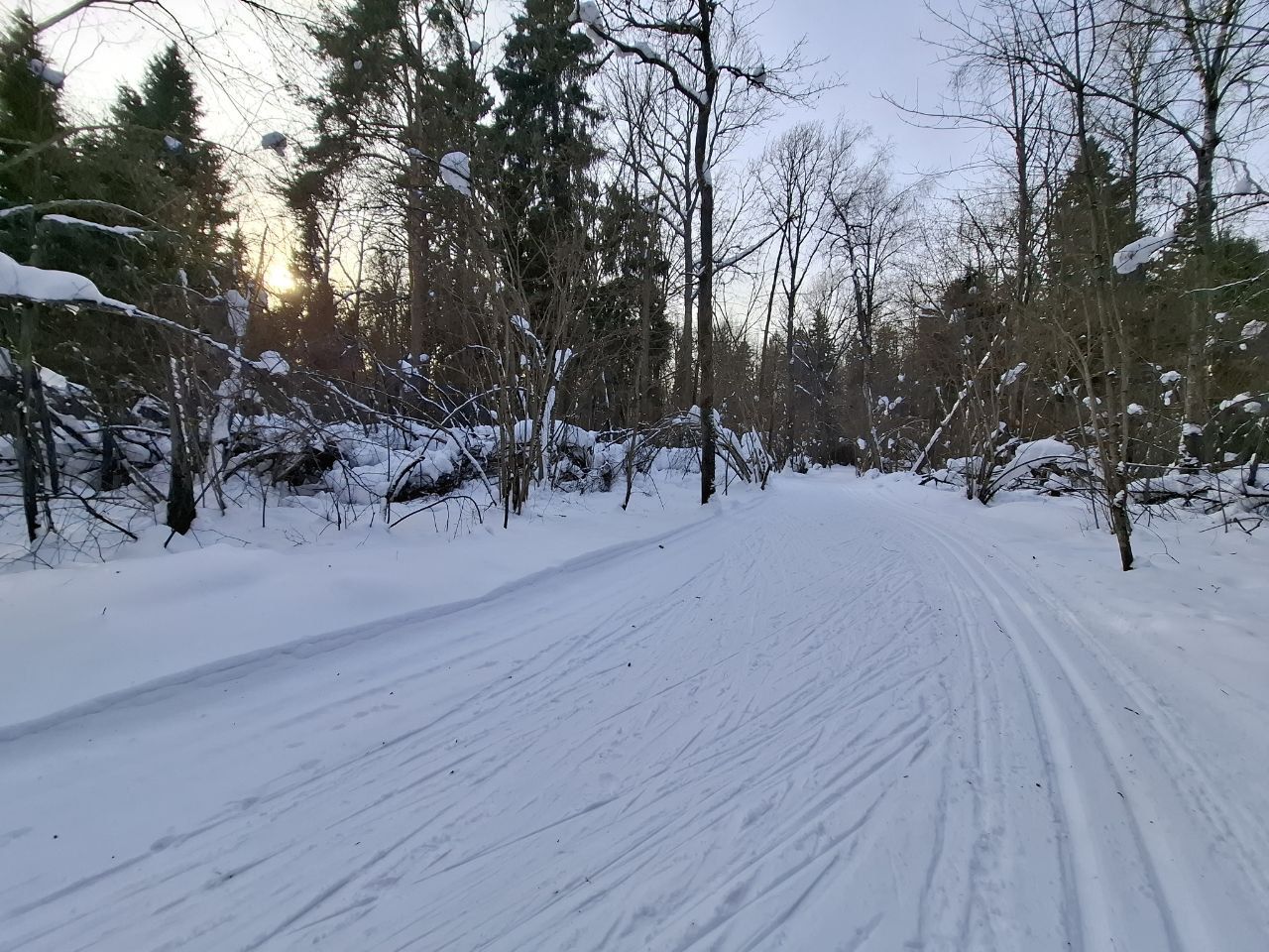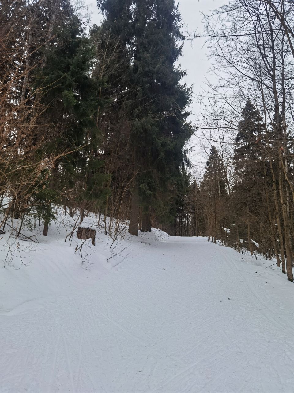 Пришел проехал 100м и ушел на стадион. В лесу к сожалению пока нормально не покатать. Я ещё хорошие лыжи взял, но и на посредственных тоже не стал бы, зная маршрут. Сам предпочитаю кататься в лесу, а не на стадионе, но снега пока маловато, проглядывают кочки, ветки, лужи проваливаются. Видно что прокатали снегоходом, немного уплотнили. Но нужно подождать чтобы ещё подсыпало снежку и будет норм.