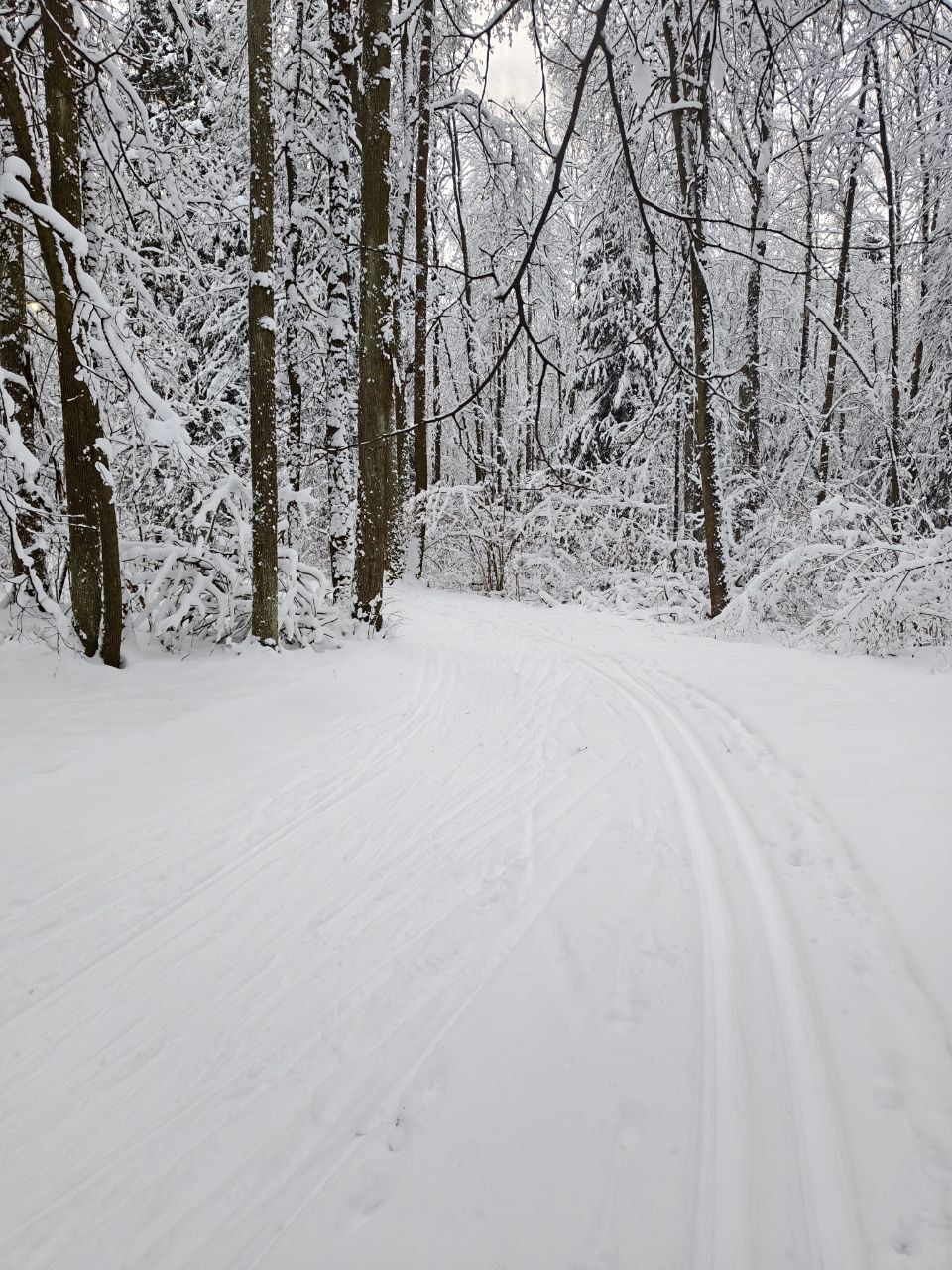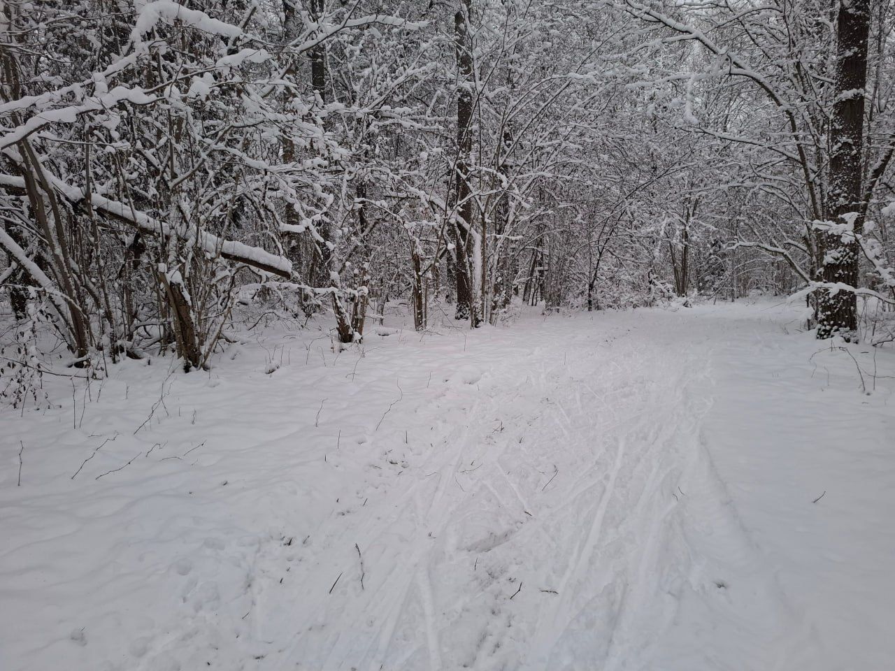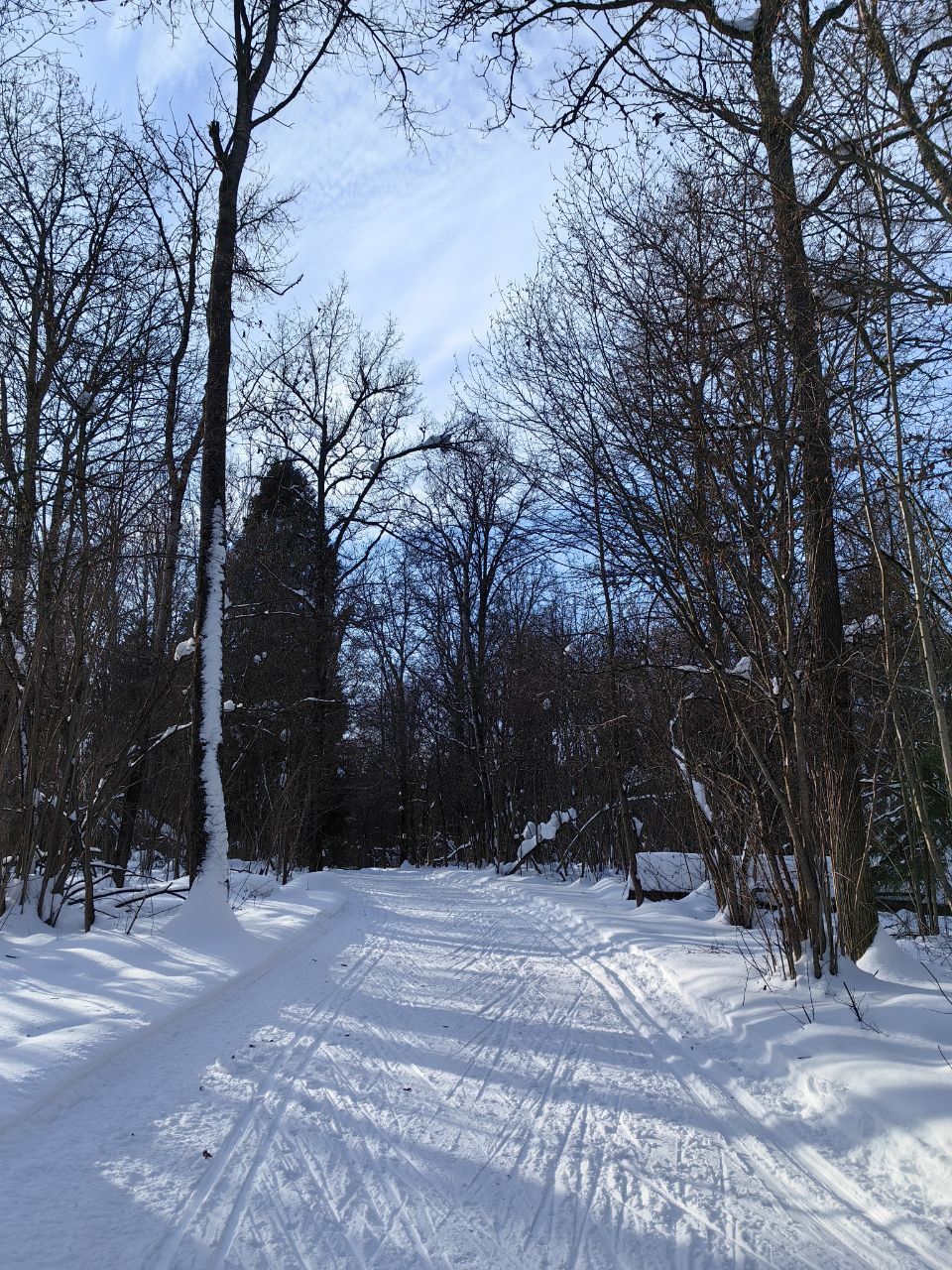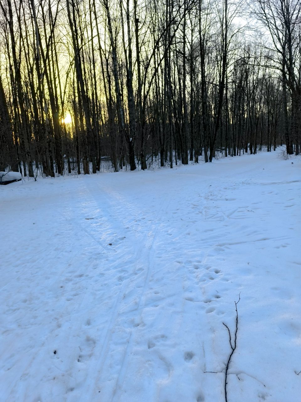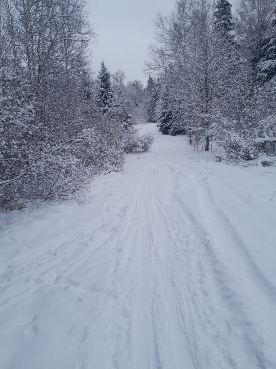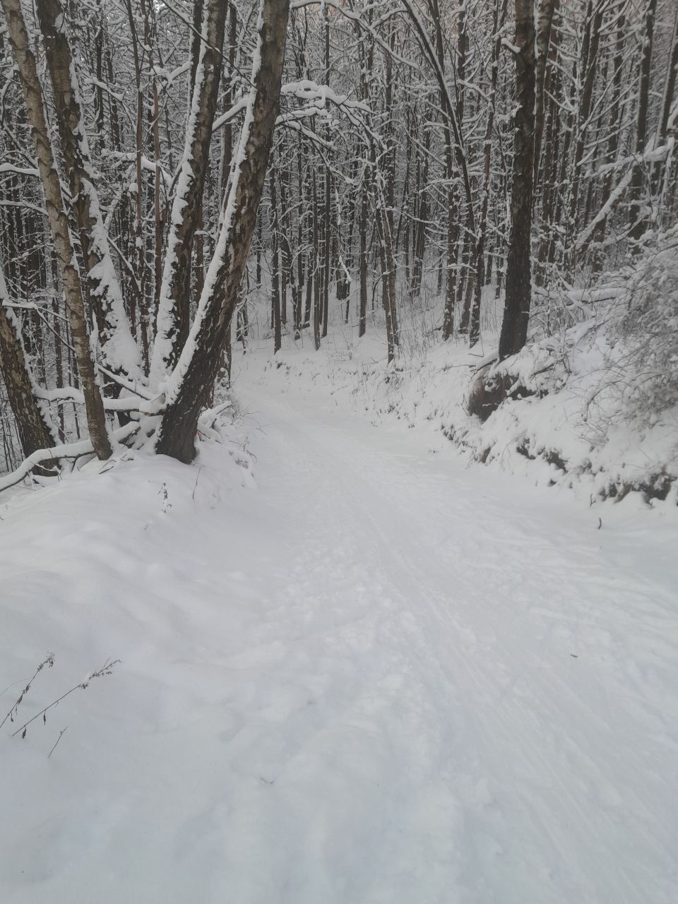 Пришел проехал 100м и ушел на стадион. В лесу к сожалению пока нормально не покатать. Я ещё хорошие лыжи взял, но и на посредственных тоже не стал бы, зная маршрут. Сам предпочитаю кататься в лесу, а не на стадионе, но снега пока маловато, проглядывают кочки, ветки, лужи проваливаются. Видно что прокатали снегоходом, немного уплотнили. Но нужно подождать чтобы ещё подсыпало снежку и будет норм.