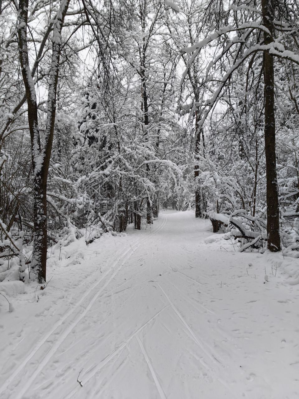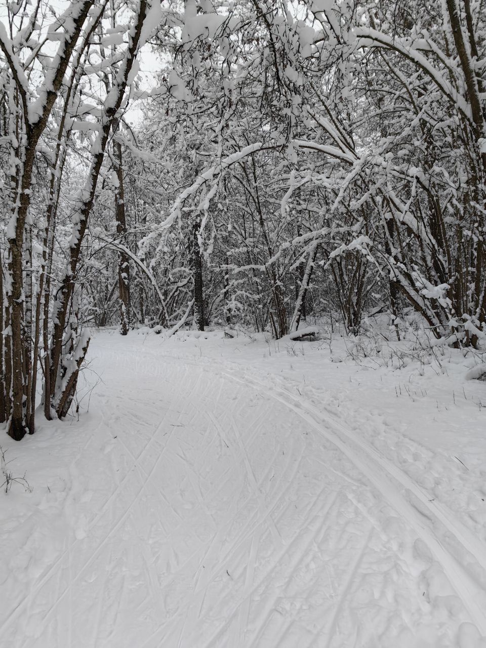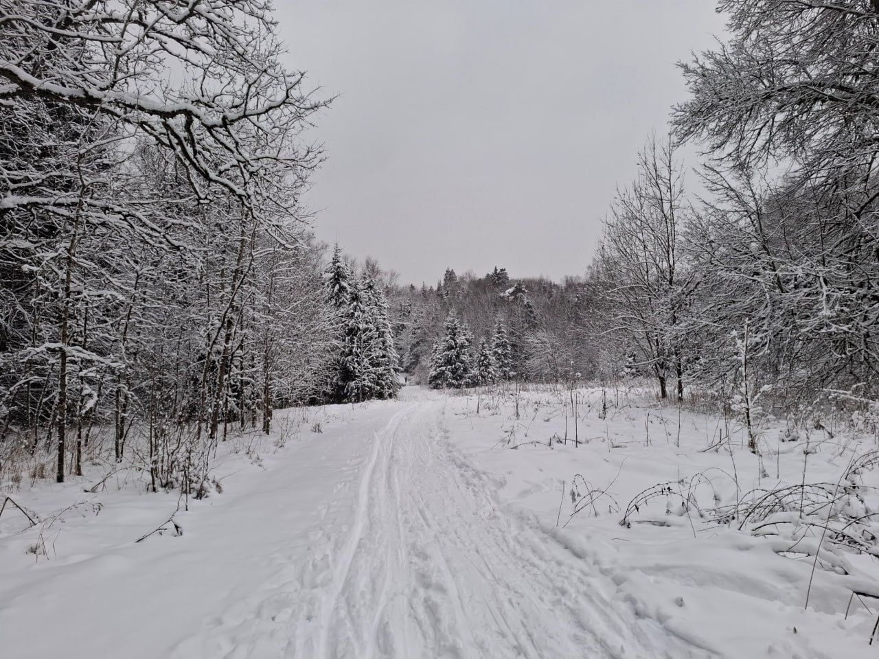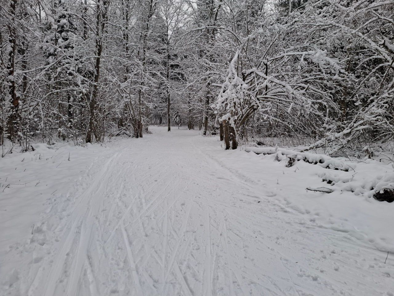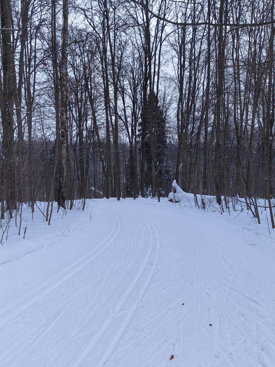 Пришел проехал 100м и ушел на стадион. В лесу к сожалению пока нормально не покатать. Я ещё хорошие лыжи взял, но и на посредственных тоже не стал бы, зная маршрут. Сам предпочитаю кататься в лесу, а не на стадионе, но снега пока маловато, проглядывают кочки, ветки, лужи проваливаются. Видно что прокатали снегоходом, немного уплотнили. Но нужно подождать чтобы ещё подсыпало снежку и будет норм.