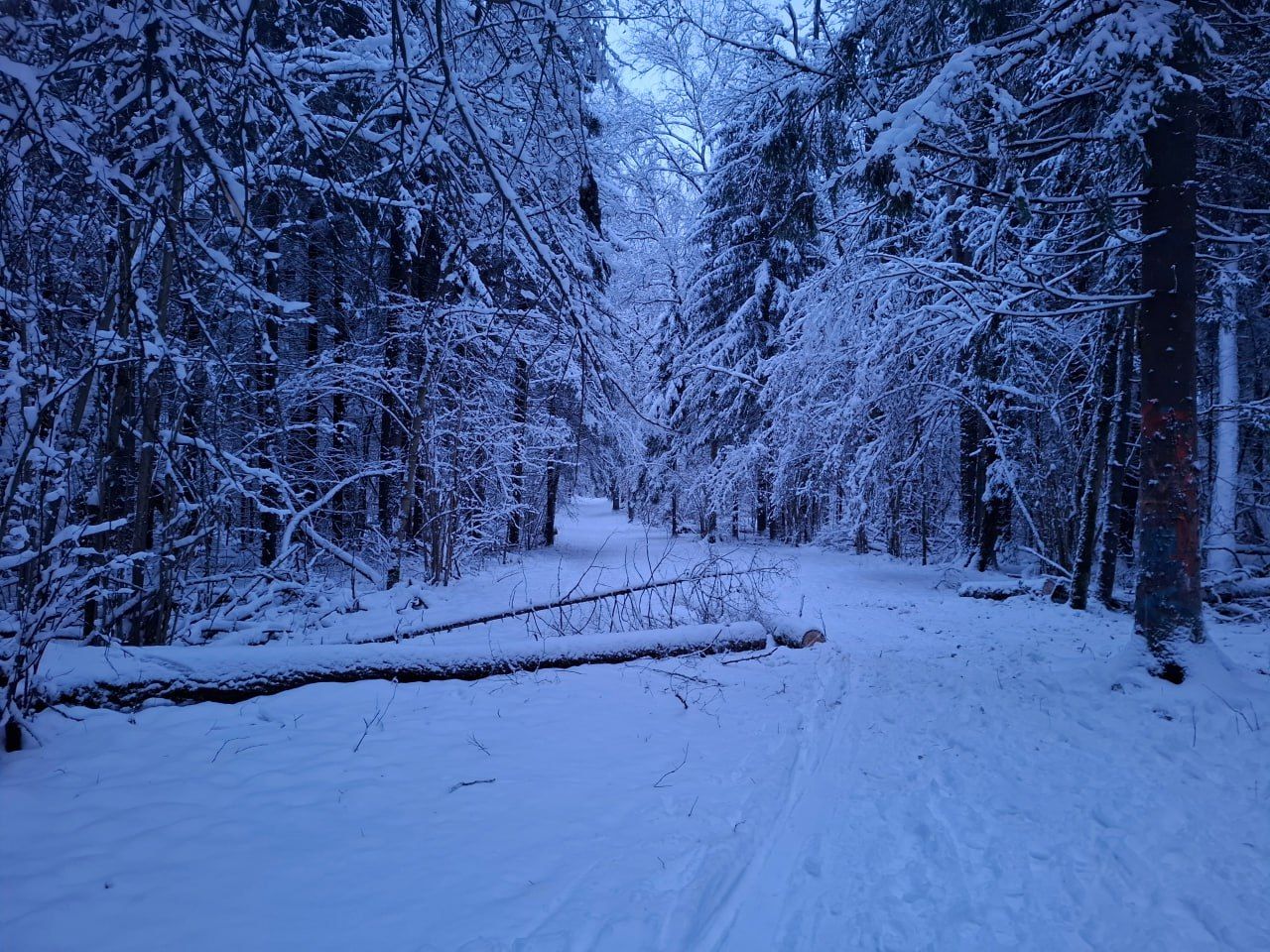 Мне тоже понравилось. Земли не видел, а вот веток и довольно крупных нападало довольно много. С деревьев снег падает. Мне два раза по голове попало большими комьями (шёл с краю по лыжне).
