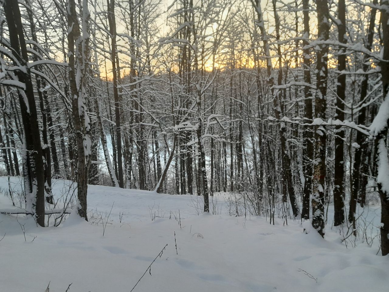 В лесу подсыпает снежок, становится мягко. Плюс с деревьев осыпается. Есть петли в лесу, где сегодня похоже никто не был. Снег морозный, катучий.