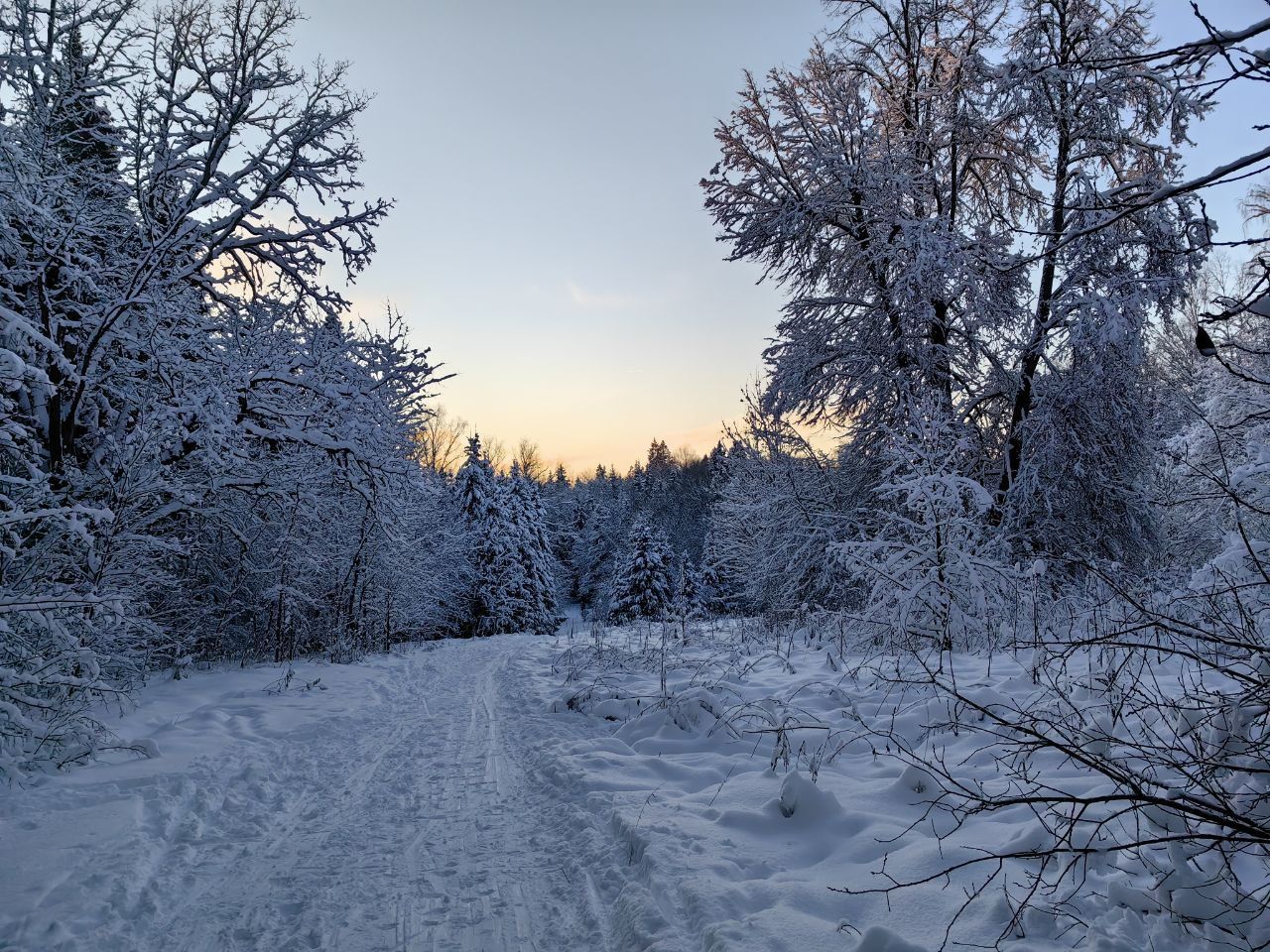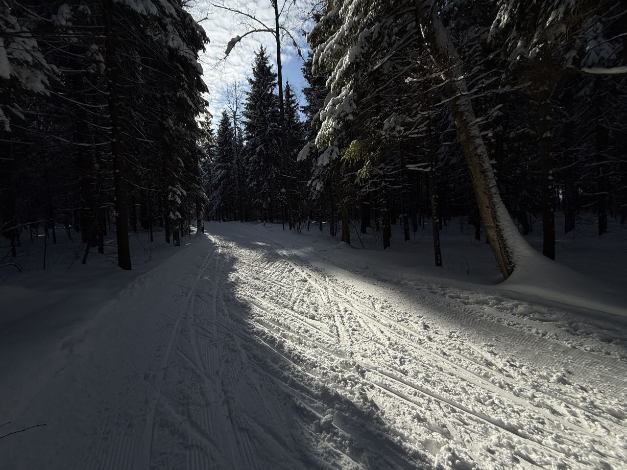 Мы прокатились по лесу с большим удовольствием! Для лишь третьего снежного дня в этом сезоне - в лесу сегодня кататься было прям в кайф! Снежок катучий! Погода шикарная и виды тоже! Никакого дискомфорта от такого катания не было. Равнинная часть трассы уже очень хорошо за выходные укатана лыжниками: где-то чуть лучше и плотнее, где-то помягче, где-то узковато, где-то почти на полную ширину. Сергей Борисович пытался прокатать трассу на днях, но опять сломались снегоходы, что-то успел, что-то нет, снегоходы надо везти в ремонт, но его проделанная работа заметна! Если сегодня за ночь подсыпет еще снежка - будет вообще хорошо!