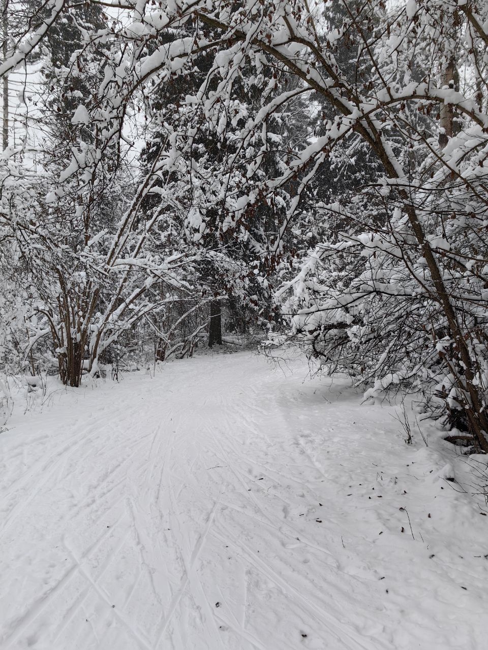 На спартаковском кругу есть классическая лыжня, для конька из-за снегопада больше похоже на самотоп. Отличный, катучий снег на кругу.