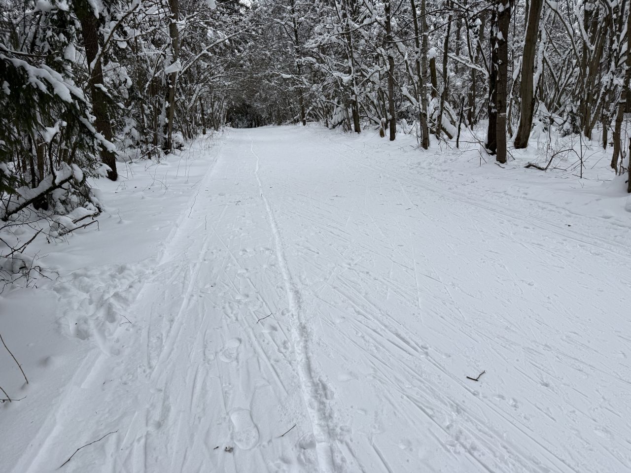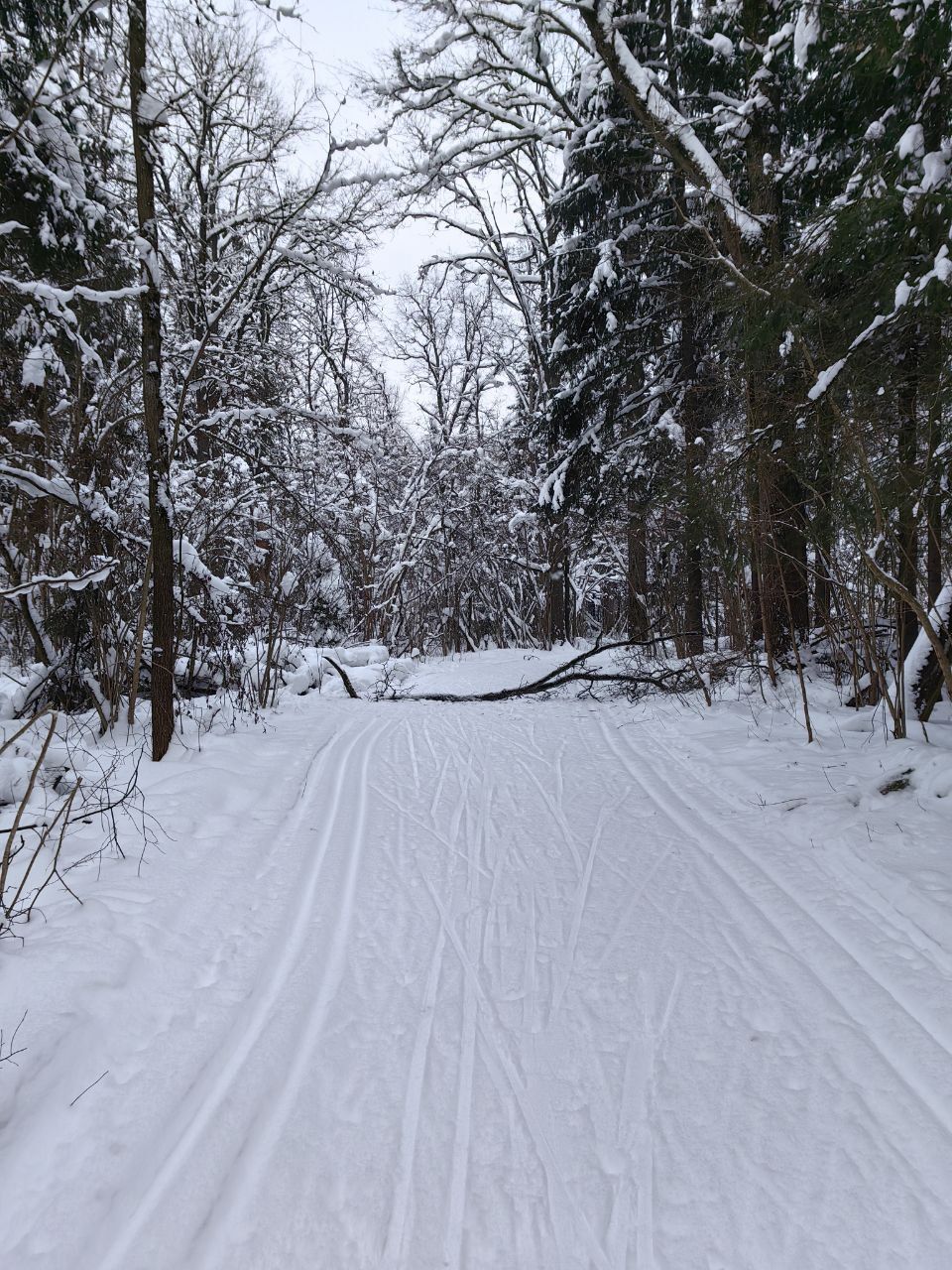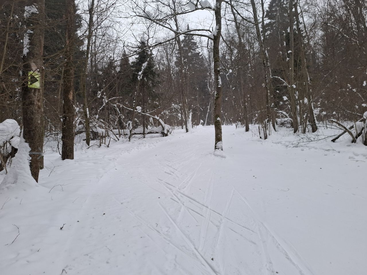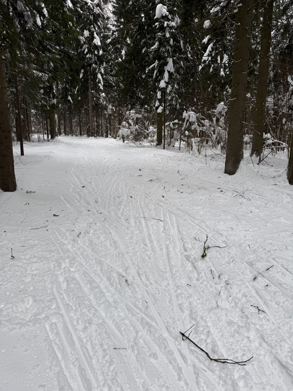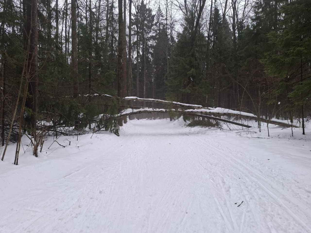 На трассе по моему треку 2 упавших дерева. Одно на спартаковском кругу после подъёма, второе на петле между 3 и 4 подъёмами УК Синички. Коньковая часть со свежим снегом скользит неплохо. Но в классической лыжне пухляк не даёт нормально ехать.