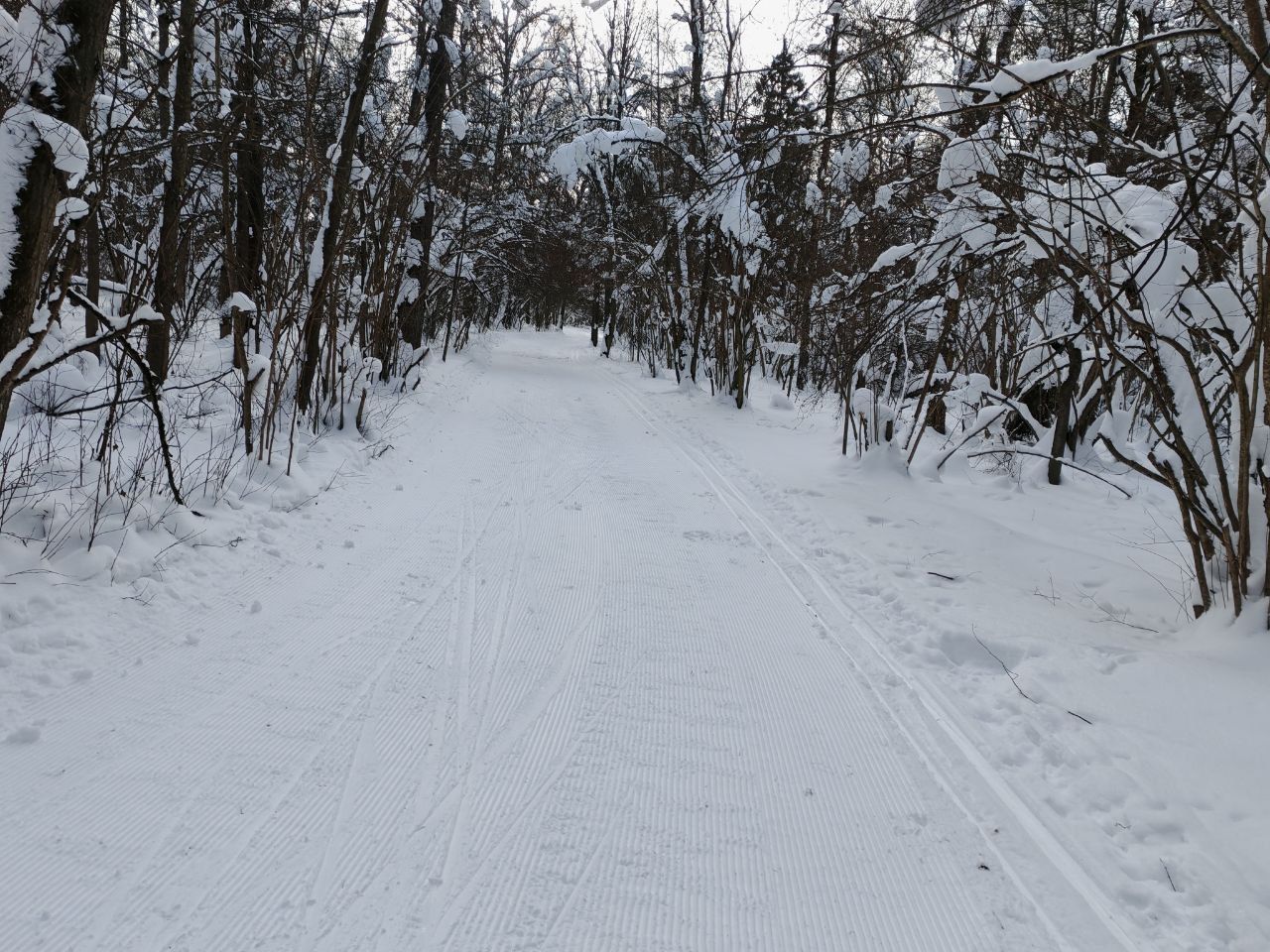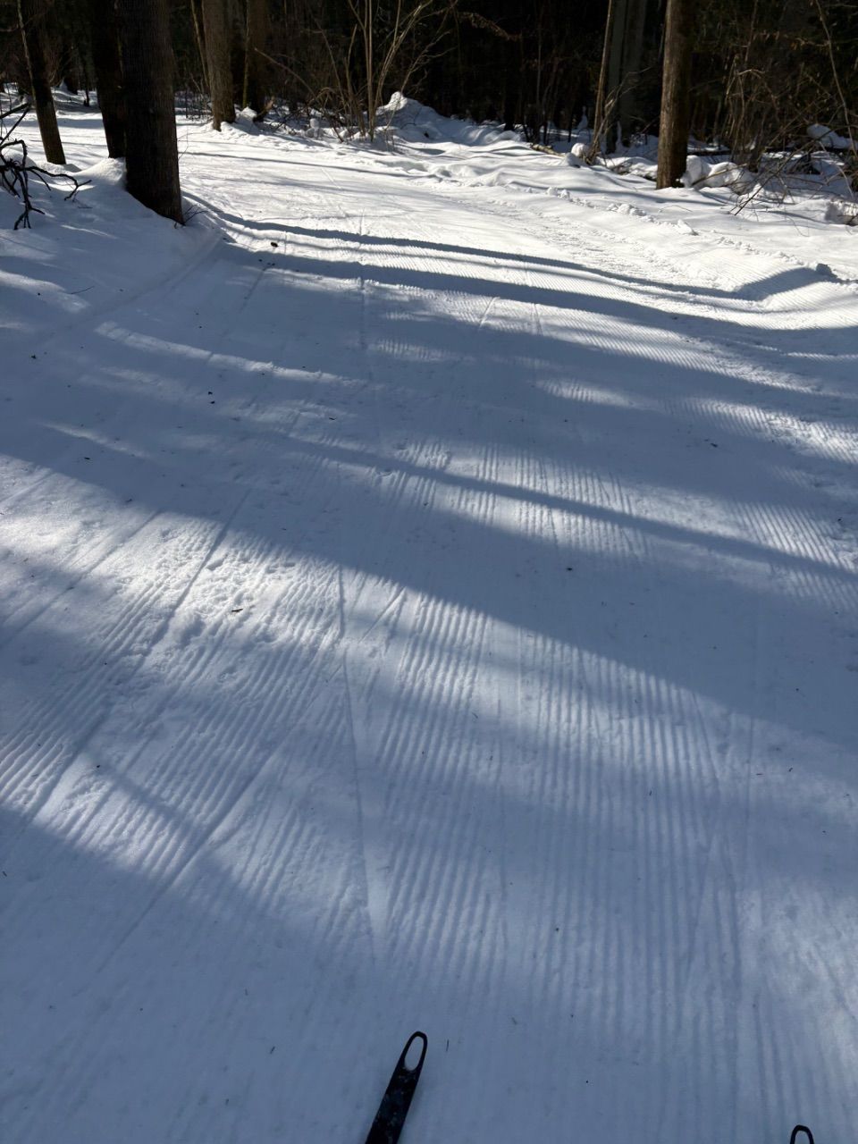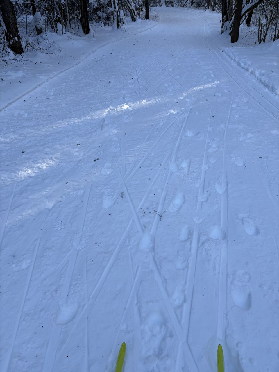 В целом в лесу почти везде много замёрзших следов лыж, ног, лап и других неровностей на полотне трассы, они немного мешают, также веточки листики и мелкий мусор с деревьев практически везде, где-то меньше , где то больше.