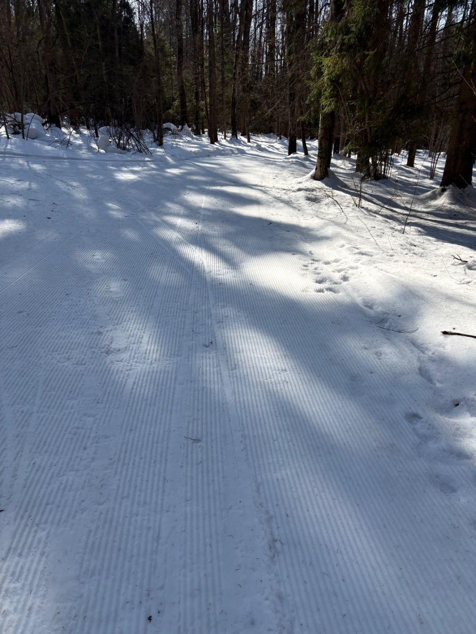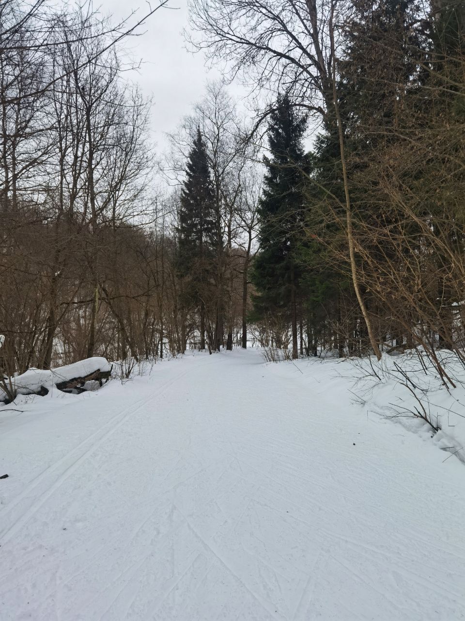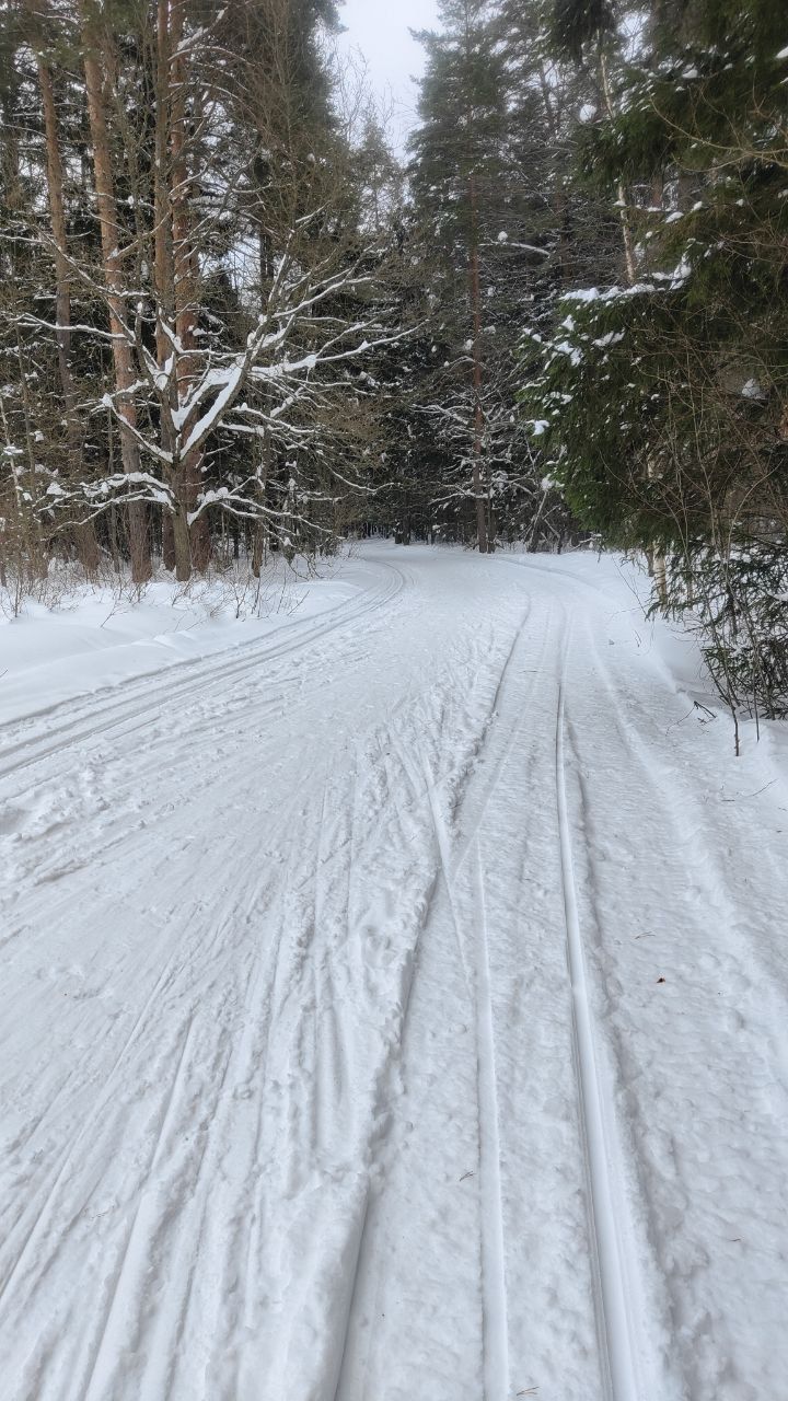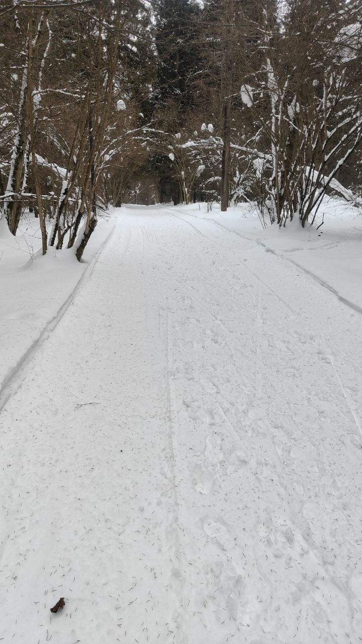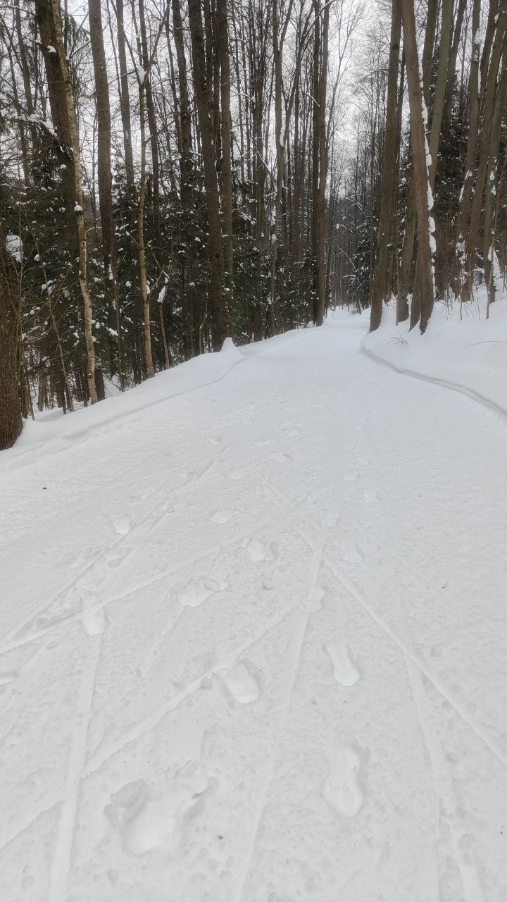 Думала, что будет значительно хуже. Да, местами есть горб, местами грязно и копытинг есть знатный (не стала это все фоткать), но не так пока еще критично. Есть прямо ровные хорошие места, особенно финишная прямая к дачам, как и написали. Кое-где снег подморожен с наледью, особо не расслабиться, но в основном подтаявший снег комфортный, еще днем чуть присыпало местами. Но основное - проваливаются палки, даже в центре, хотя, казалось бы, уж там должна быть плотная подушка. Прямо нормально оттолкнуться иногда не выходит, с мыслями-палку бы не сломать. Уходит см на 15-20 по бокам еще мягче. Видимо, снег в этом году утрамбован маловато. В итоге, конечно, катание требует контроля со всех сторон. Но потом попривыкла и решила радоваться и этому, и даже солнышко показывалось. Закажу побольше лапки, может пригодится. В любом случае, эта зима для лыжников хороша, вспомним и забудем предыдущую как страшный сон. П.с у входа от дач наверху так почистили дорогу, что засыпали горой лыжню-дорожку в лес, кто петлял там без лыж-провалился по колено)