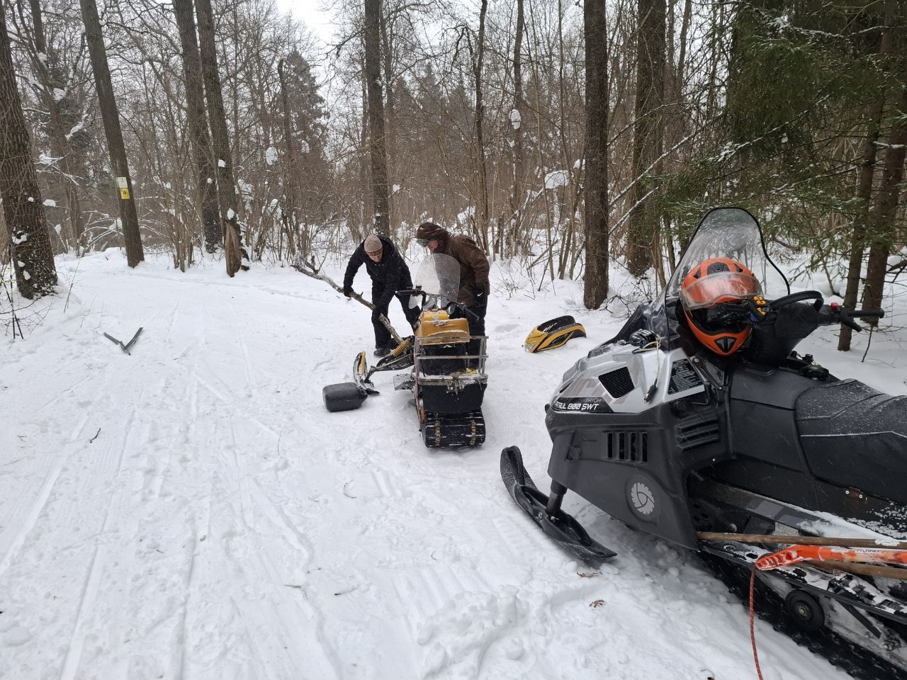 Позавчера поздно вечером, при подготовке трассы на дальних рубежах, у Сергея Борисовича Кондраткова сломался основной снегоход «Тайга Патруль».