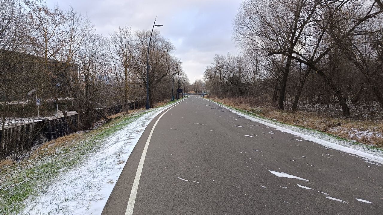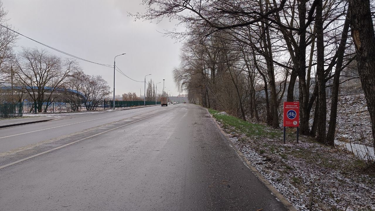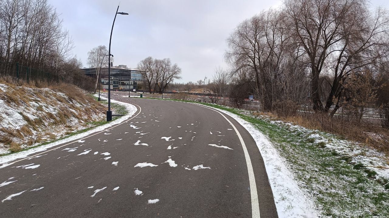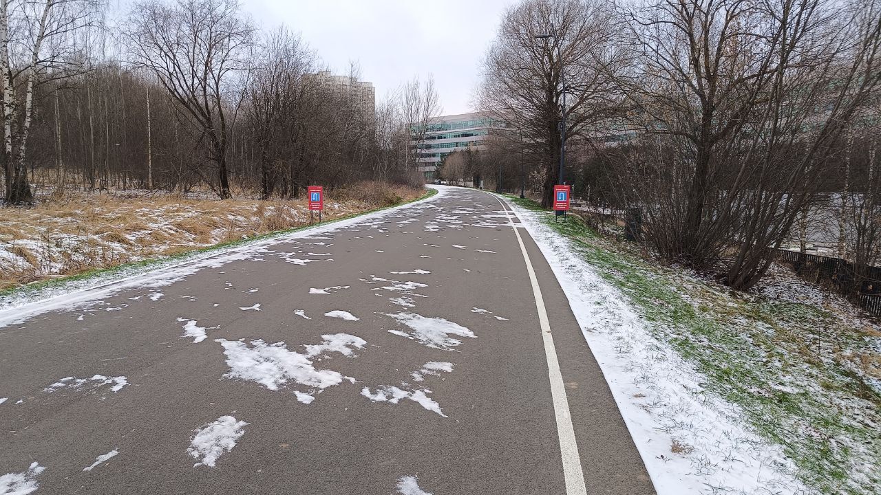 Нижняя часть Большого велокольца, начиная от выезда с МВК (вдоль ул. Крылатская) и до подъёма Молодёжный, полностью пригодна для роллеров. Наверху на МВК и вдоль офисов - наледь и снег.