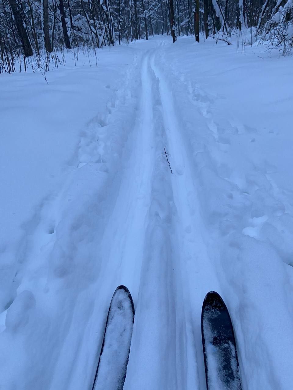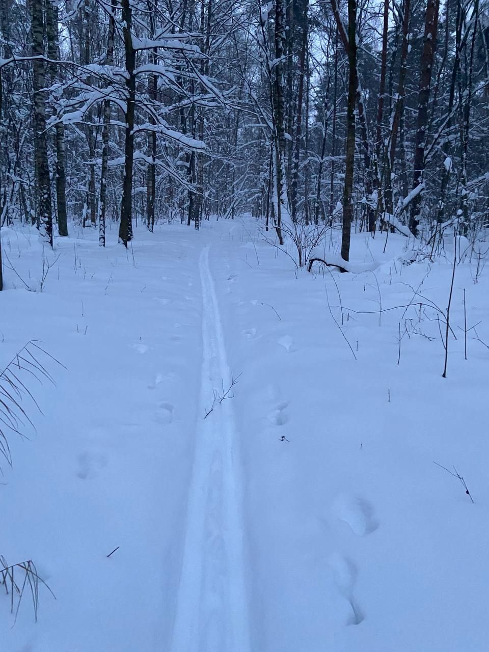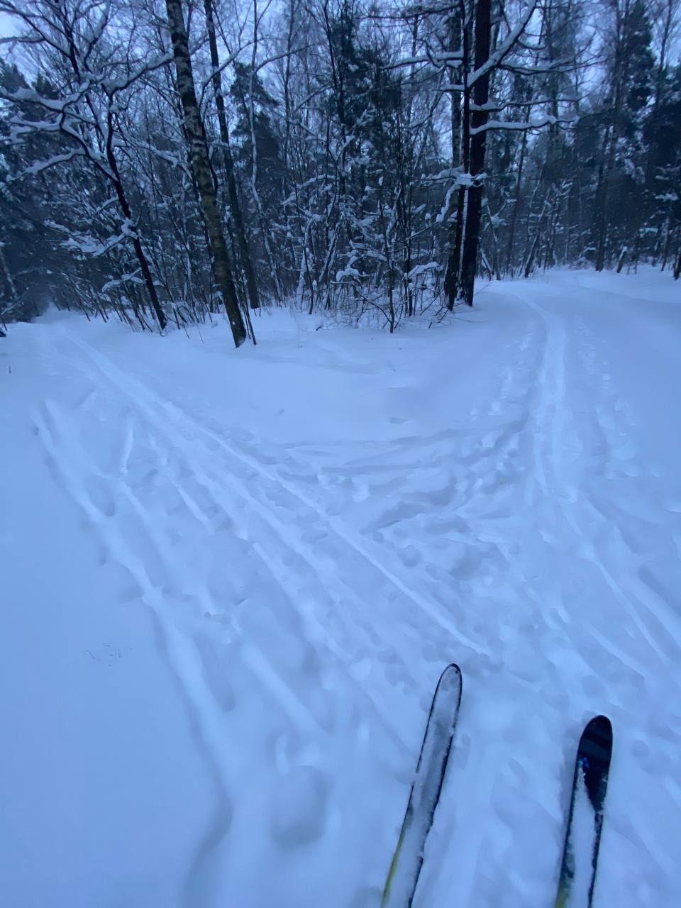 Видимо, нарезали лыжню прямо после снегопадов, пока ровненько. Есть проблема: упала сосна поперёк трассы в 100 метрах от начала круга, "буран" прошёл слева вокруг дерева, не самое хорошее решение, лучше бы сразу распилить это бревно. Есть ещё пару мест, где "буран" нарезал ни совсем логично по тропе, а не рядом с ней, завтра там всё затопчут гуляющие.