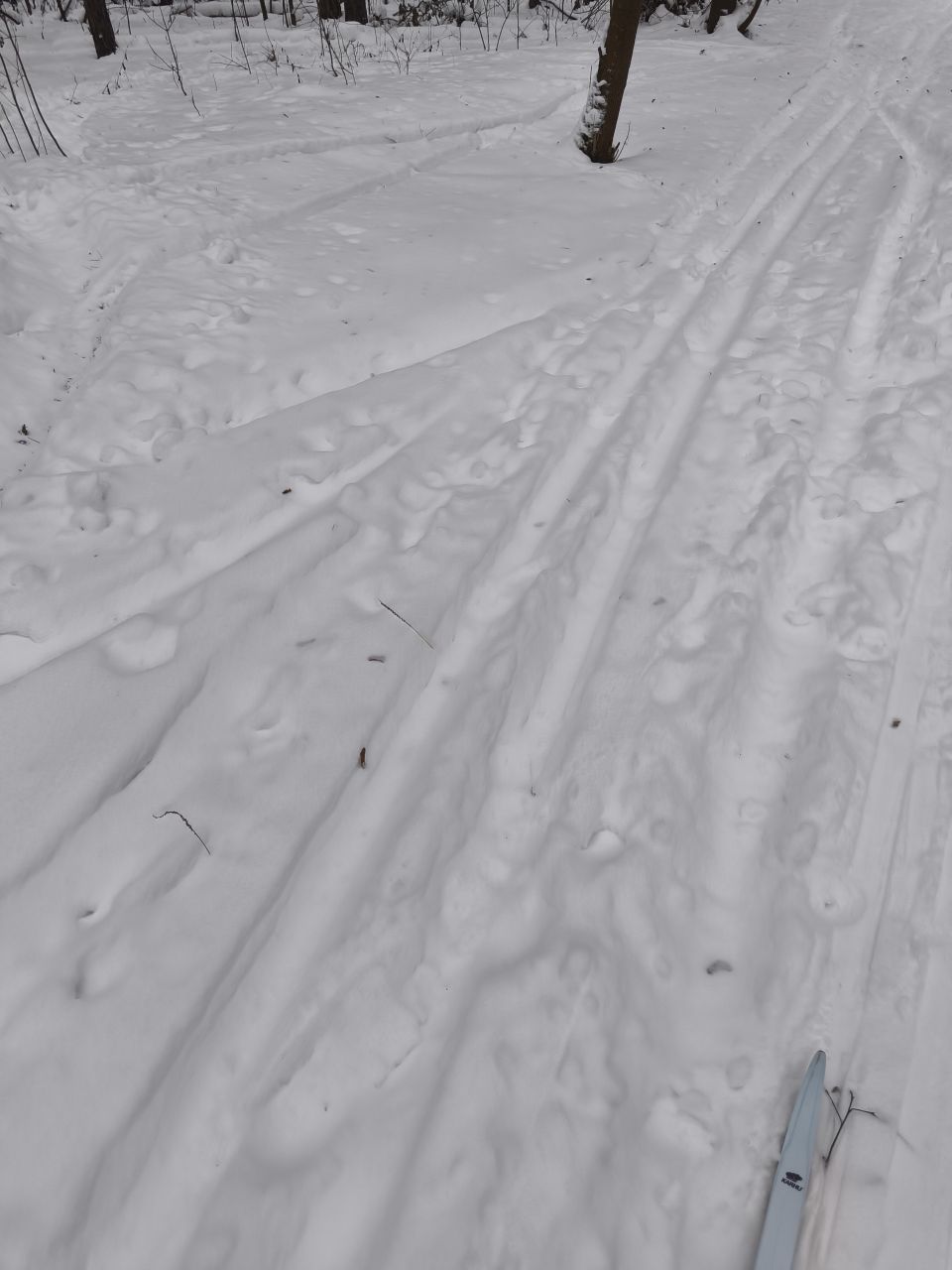Свеженарезанная неразбитая лыжня для классики. Встретили одного лыжника. Очень приятное катание - объединили обе трассы. Правильное направление против часовой стрелки, но это неважно.
