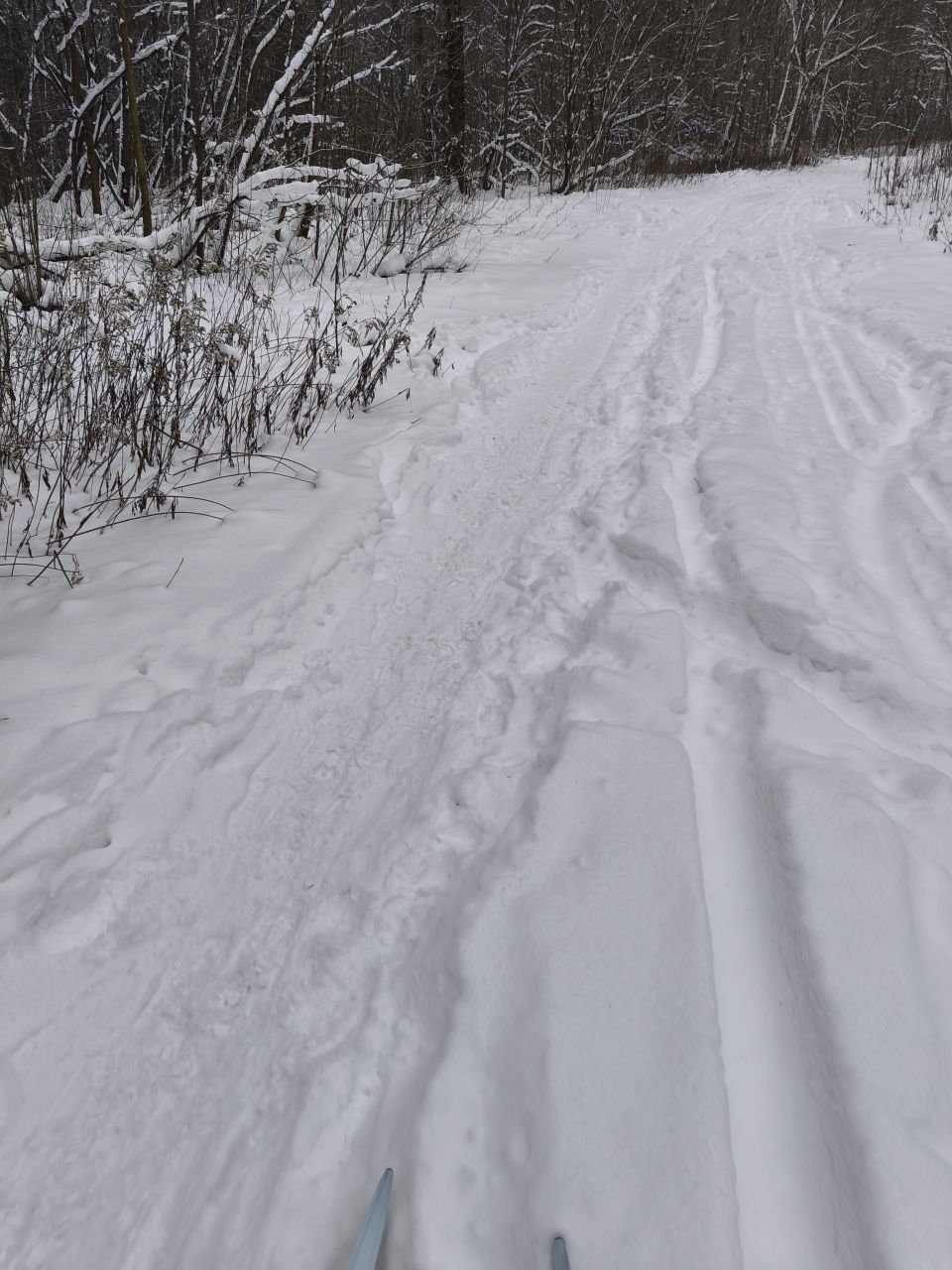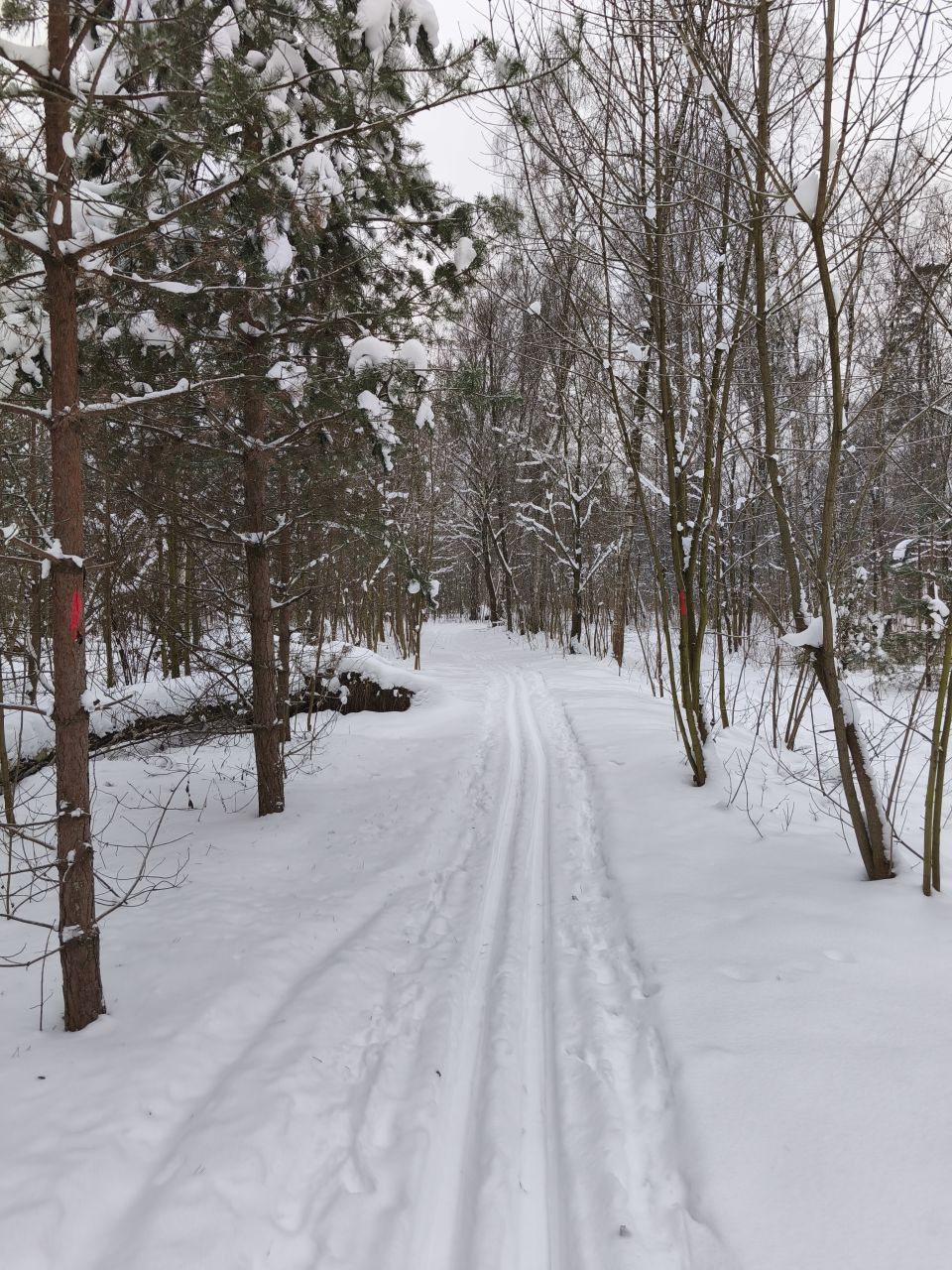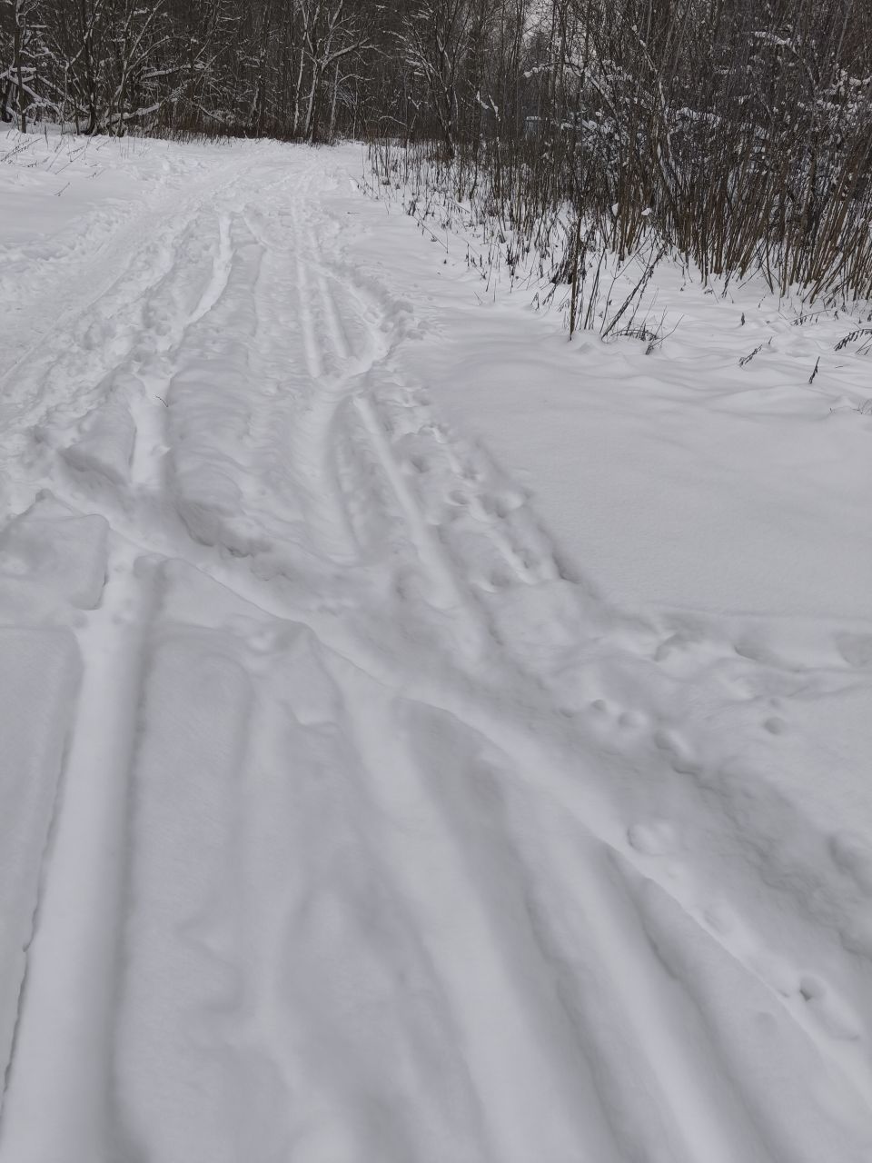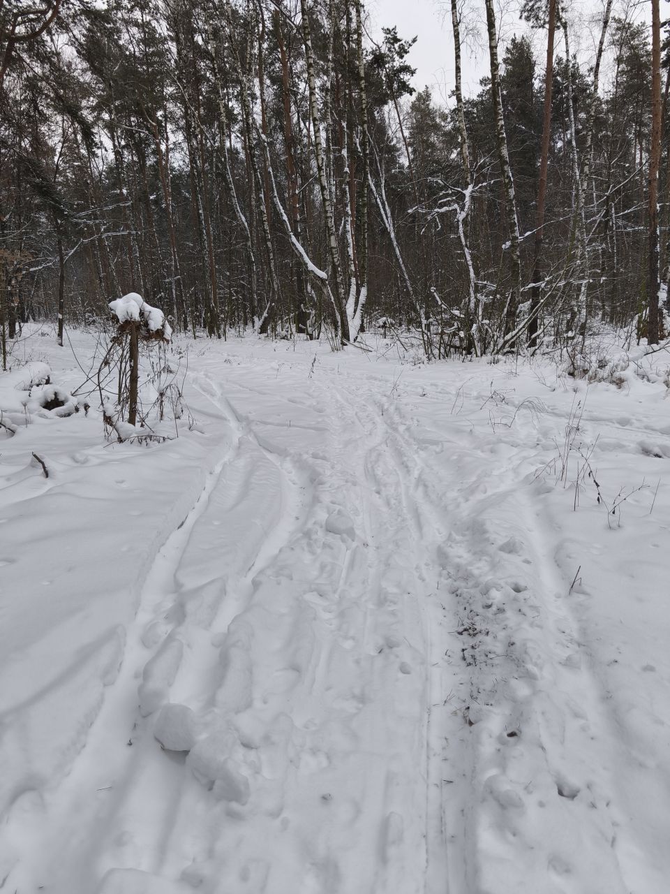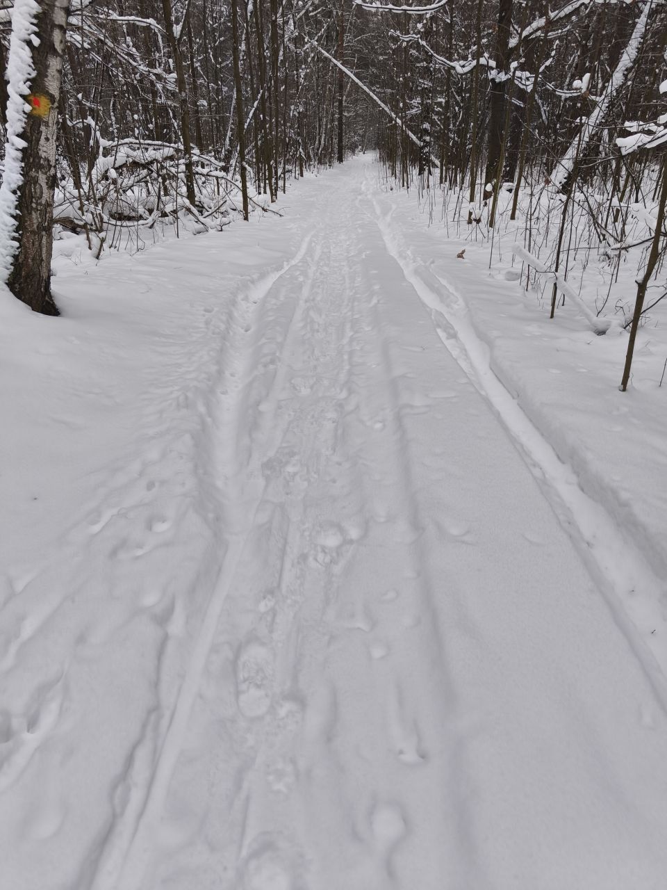 Падал свежий снег, может к завтрашнему дню подзасыпать, но лыжня все равно будет легко угадываться. Местами есть небольшие бугры и ямки.