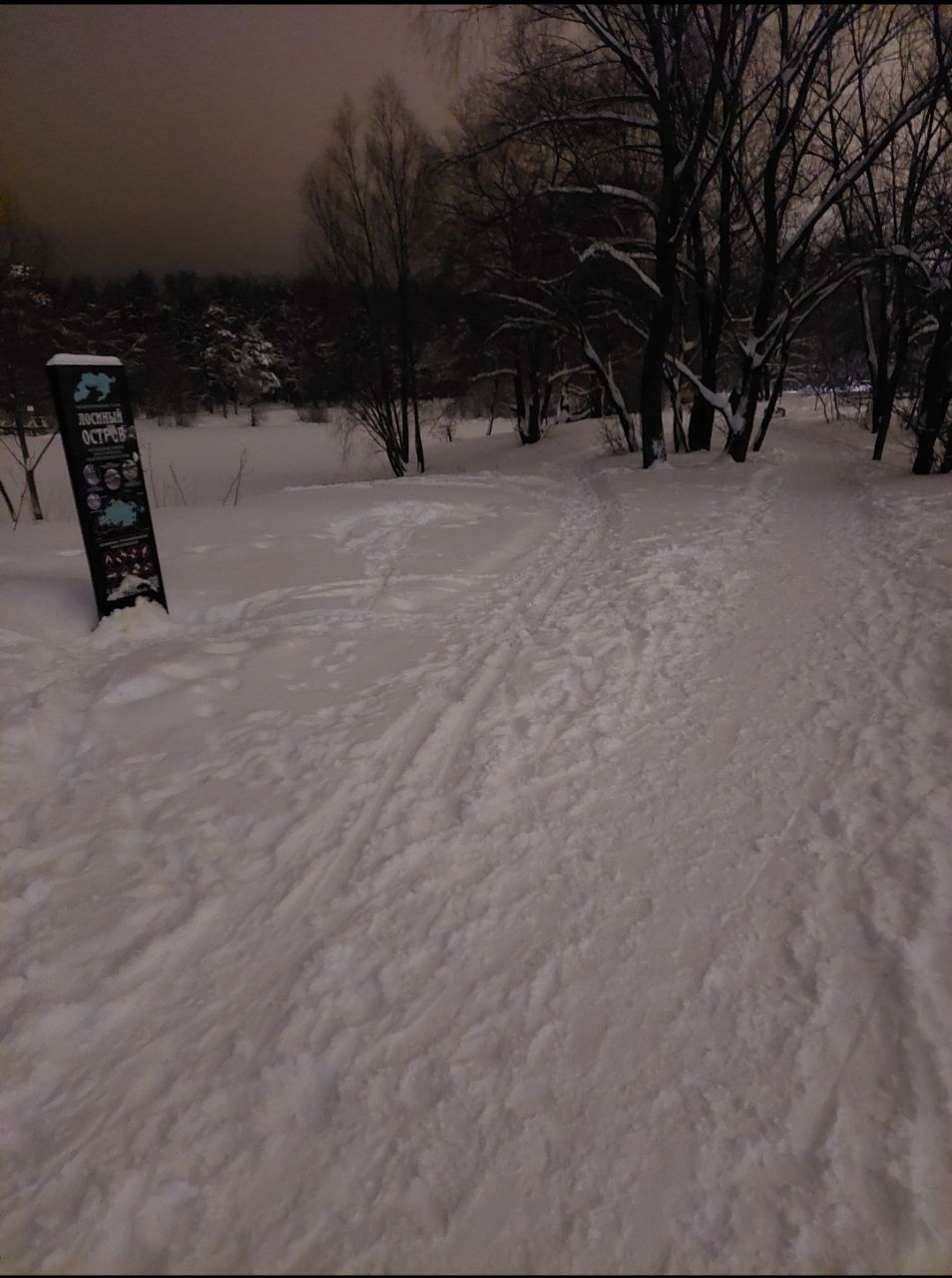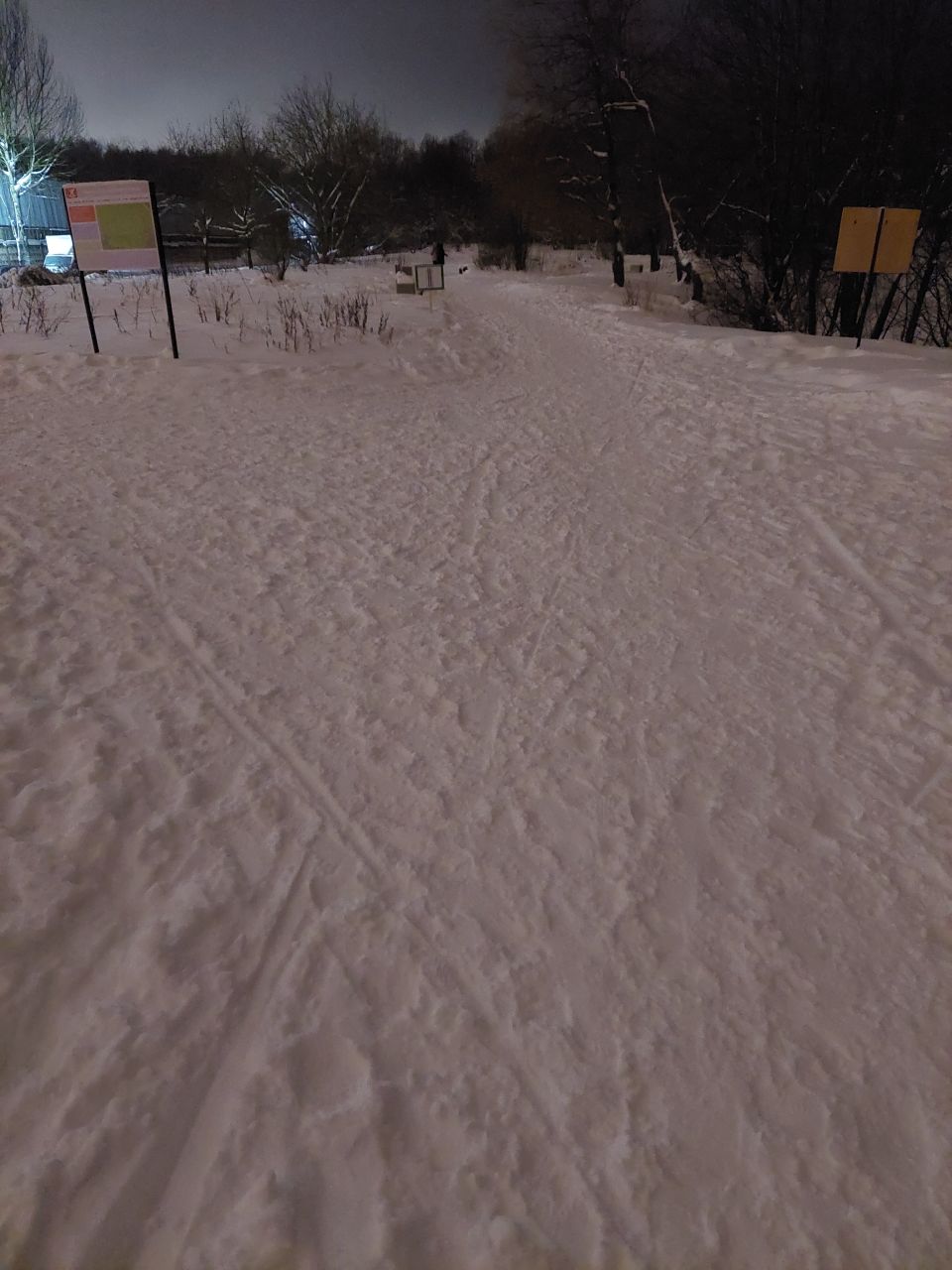 Бегал сегодня в 20:00 по освещенным аллеям от Белокаменной. Расчищено все почти до льда — лыжи плохо держат. Когда сходишь на части, где снежок, то лыжи держат слишком хорошо)) Буквально, залипают. То ли снег переморожен (ночью было ниже -20° и за день не отпустило), то ли парафин не по погоде. В силовом режиме приходится работать нон-стоп.