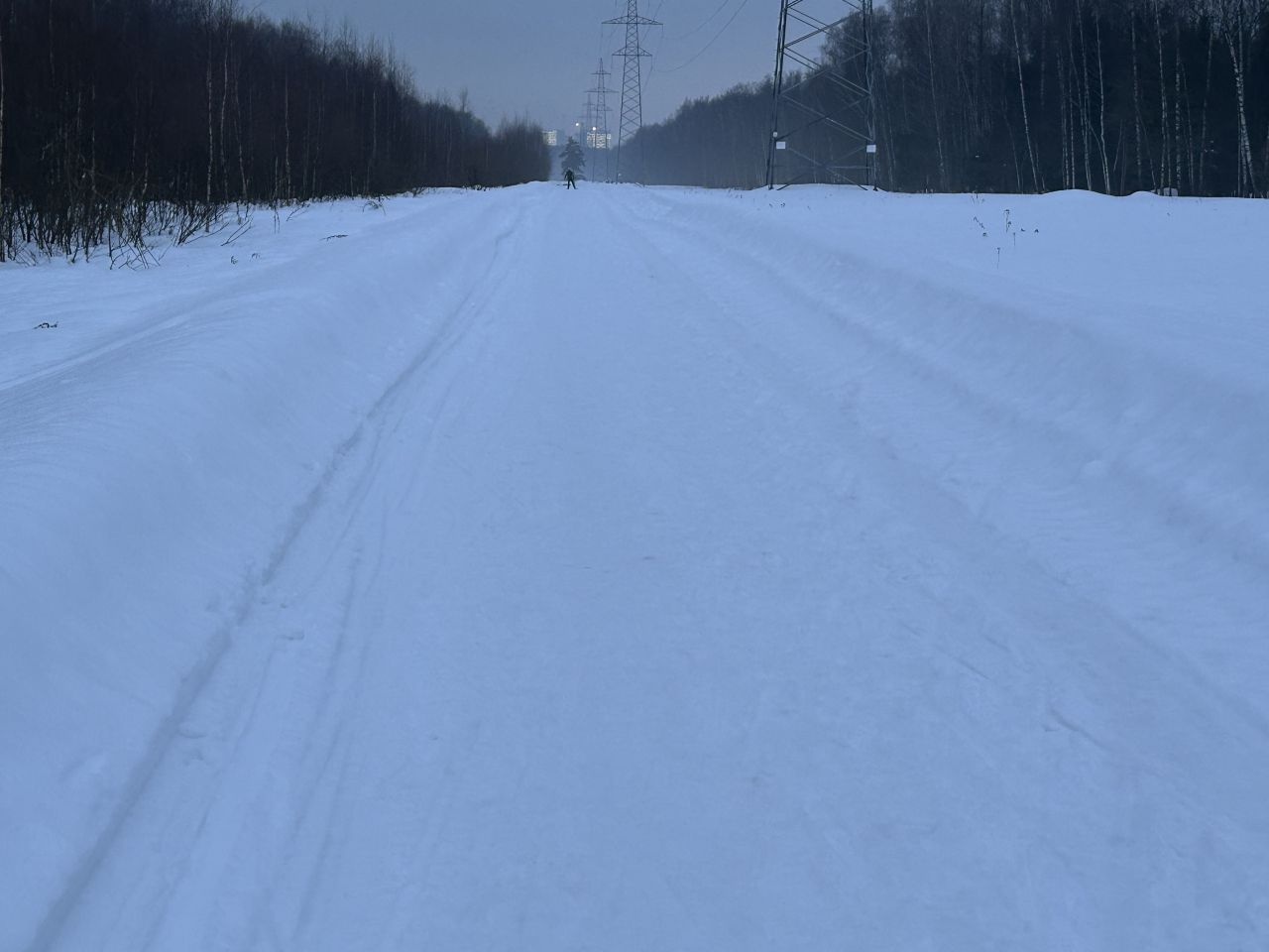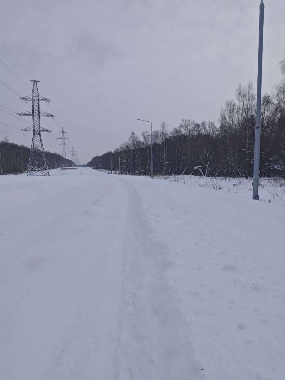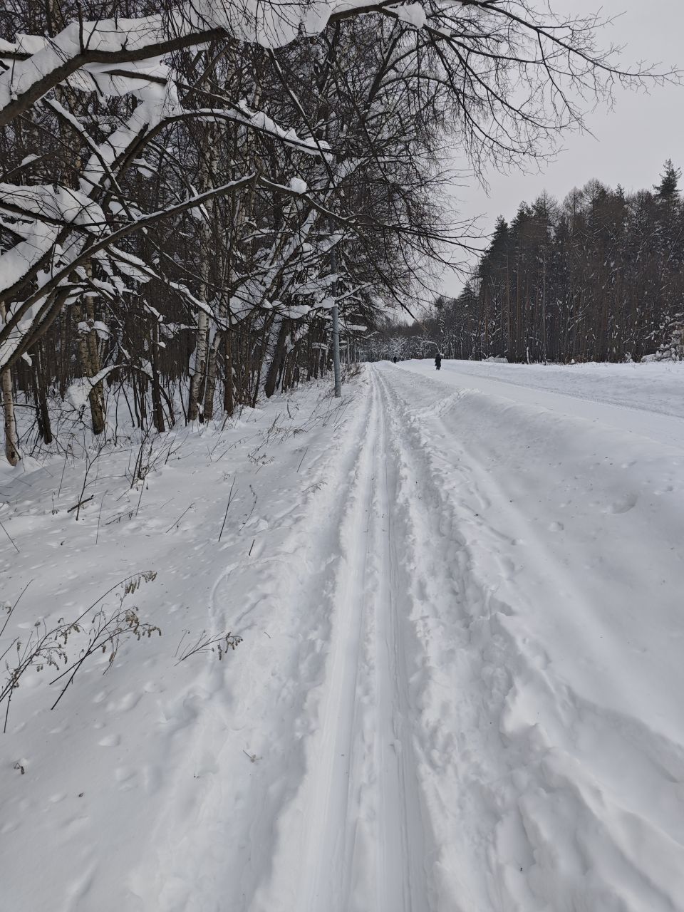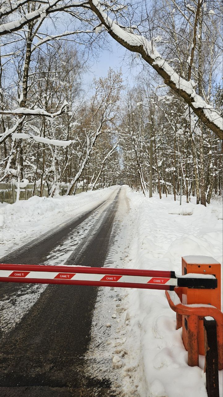 23.01.2026 В надежде найти накатанную дорогу (но не утоптанную до состояния пластика) для конька поехал к началу Бумажной. Думал, что для прогулок не самый популярный вход, и его не будут вычищать до асфальта. Но нет! Вдоль больничного забора подмели лес до асфальта — последнее фото со шлагбаумом (во дворах так не убираются). Прошёл пешком. Абрамцевская в сторону белокаменной сперва показалась нормальной, но, если приглядеться, то половина полотна сереет асфальтом из-под снега. Прямо по Бумажной тоже были видны серые области и в целом снег желтоватый, видна колея автомобиля. По Абрамцевской в сторону МКАД только тропинка. Вдоль ЛЭП — лыжня самотоп. Не стал тратить время, поехал в Метрогородок к трамвайному кругу. Там по прямой от наземного паркинга прокатился до Бабаевских прудов. Первое фото спиной к прудам. Посередине утоптанный снег, по бокам лыжня. Моих умений не хватает по такому плотному снегу ехать коньком. Местами лыжи разъезжаются вбок. Но в общем впечатления положительные. В отличие от прогулки 19.01.