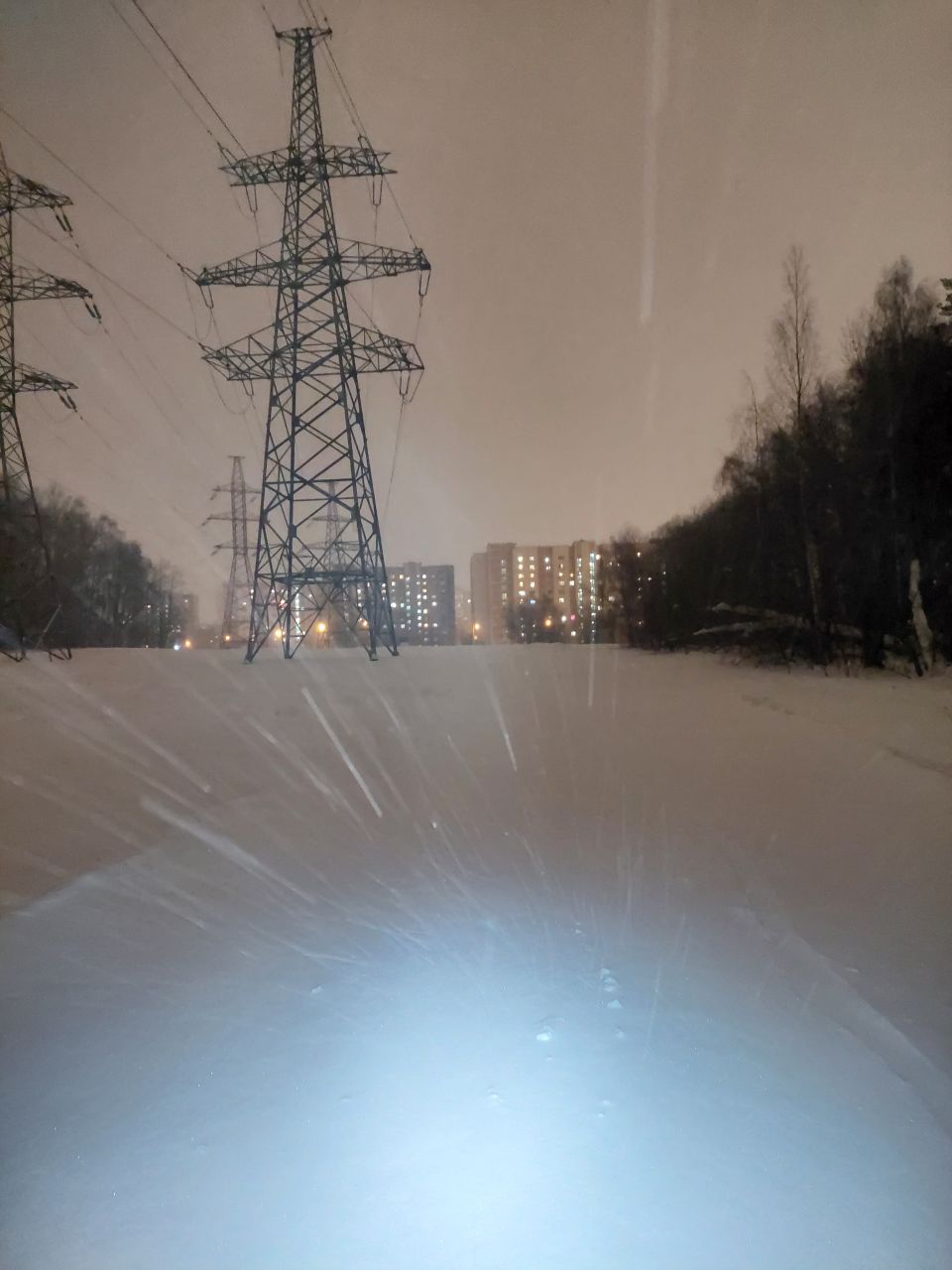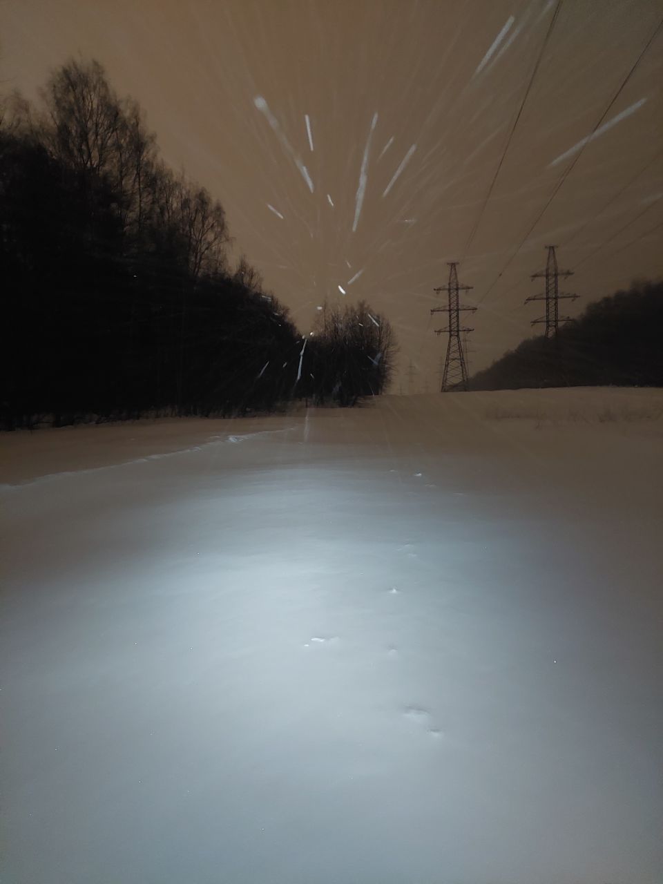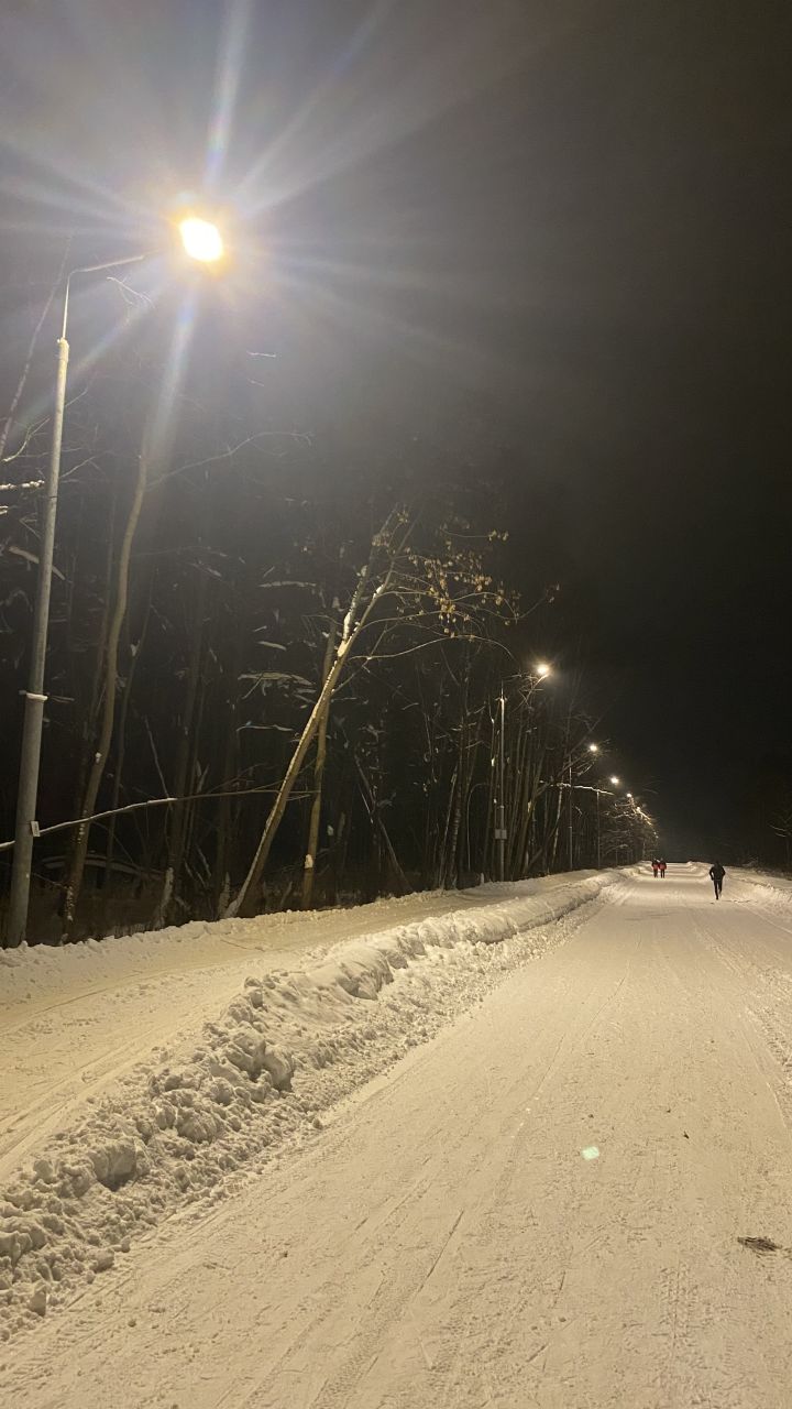 Вечером горят фонари, очень удобно. Каталась от мцк Белокаменная (есть теплый переход с туалетом, лавочками, где можно переобуться, и автоматами с кофе и снеками) по трассе вдоль фонарей до финиша и обратно. Я новичок, ходила классическим ходом, потратив в общем 73 минуты. На лыжне можно встретить собачьи мины.