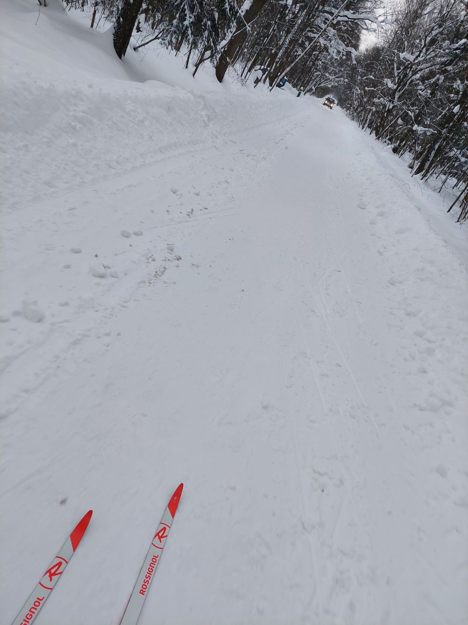 От Белокаменной строго сверху по нарезанной лыжне самотоп из свежего снега — выглядит симпатично, но рыхловат и мягок, подходит под туристические лыжи, на беговых шатает и продавливает. Под конек еще хуже — слишком уж расчищены дороги.