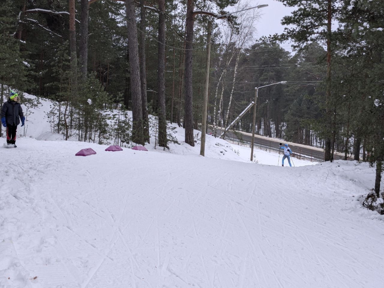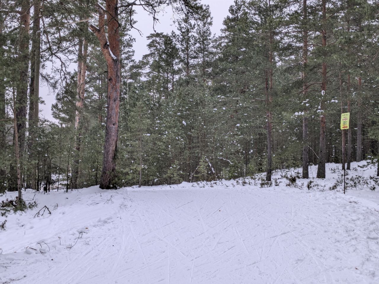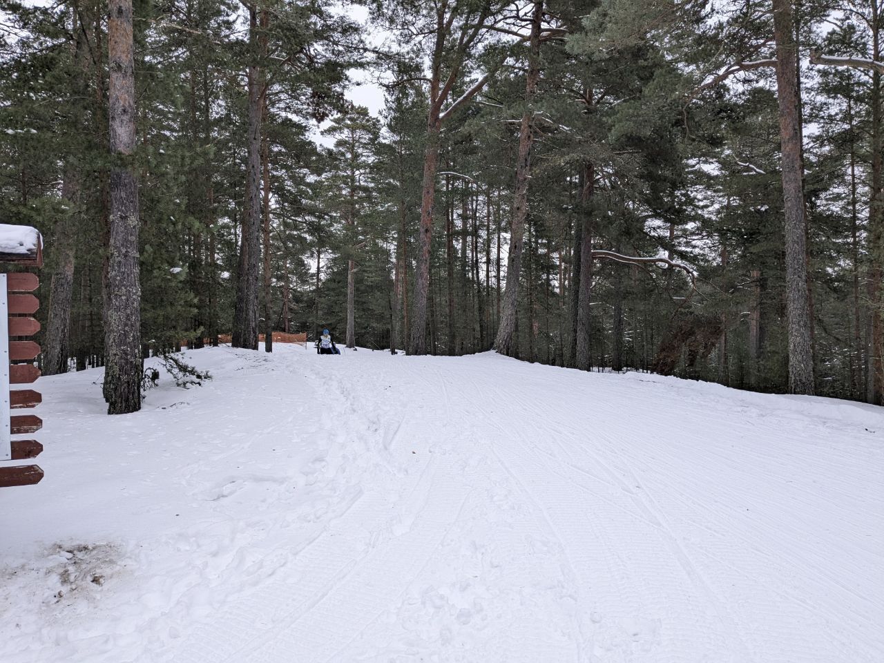 Трасса проходит в сосновом лесу, достаточно широкая и ровная.