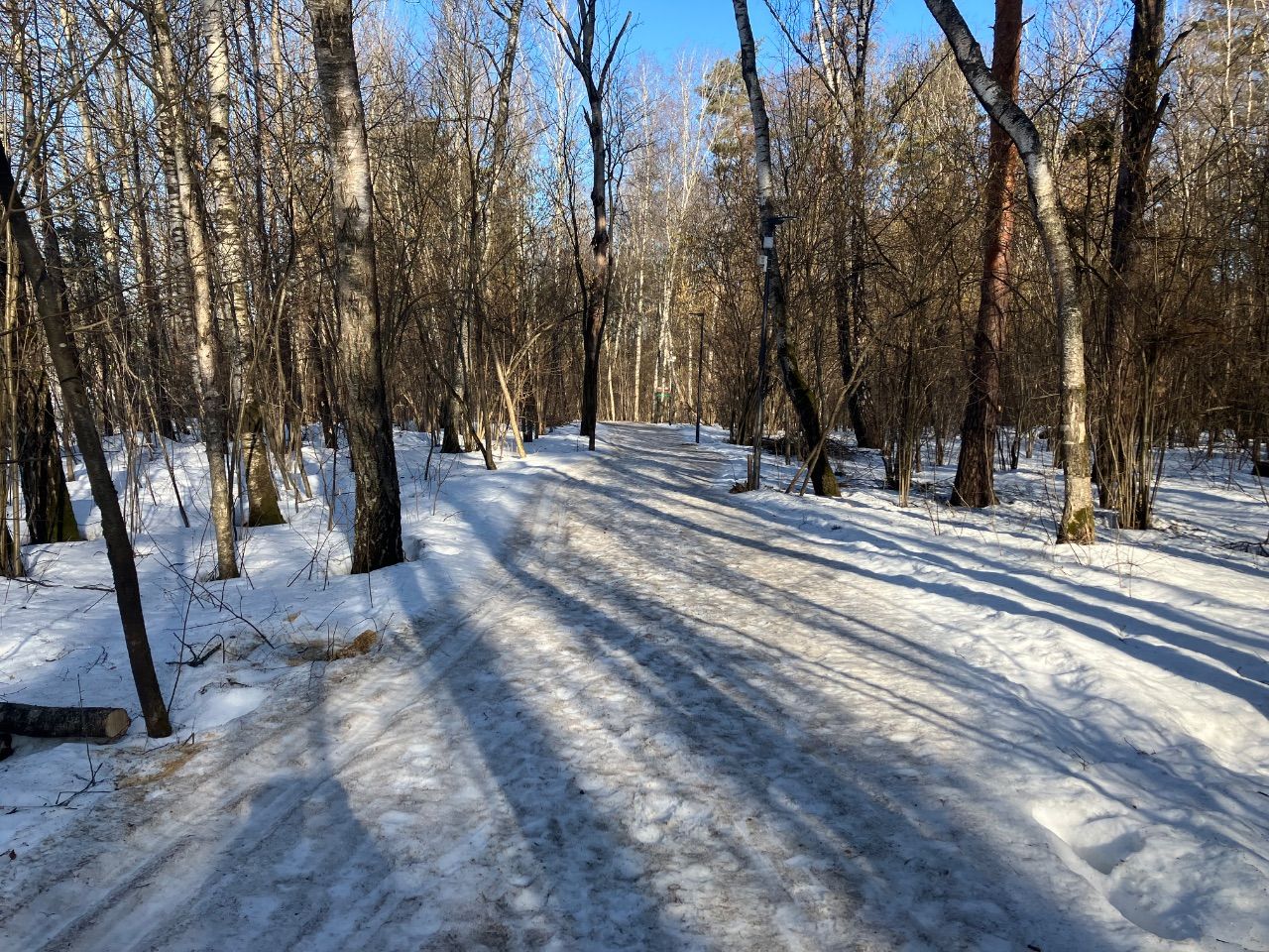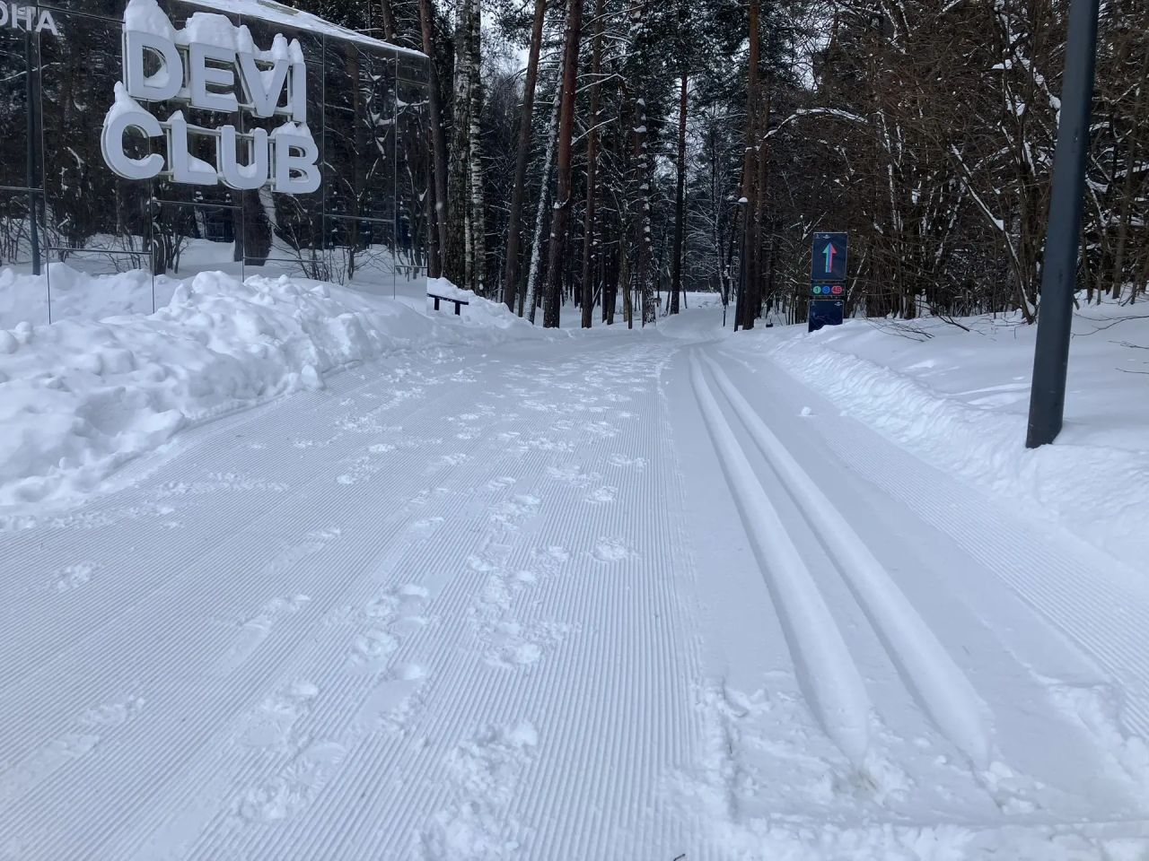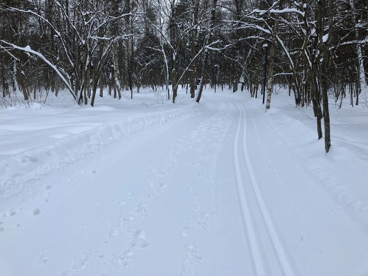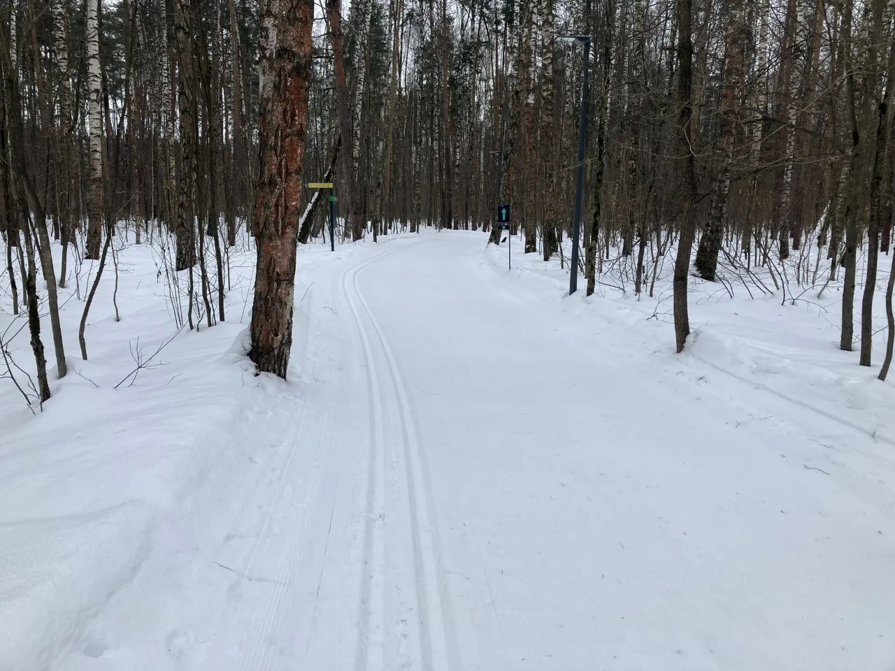 С 9 до 10 утра отлично. Ещё никто не катался, трасса сделана с ночи, плотная, чистая. По коньковому полотну ходят пешеходы. К 10 на трассу потянулись лыжники и собачники.