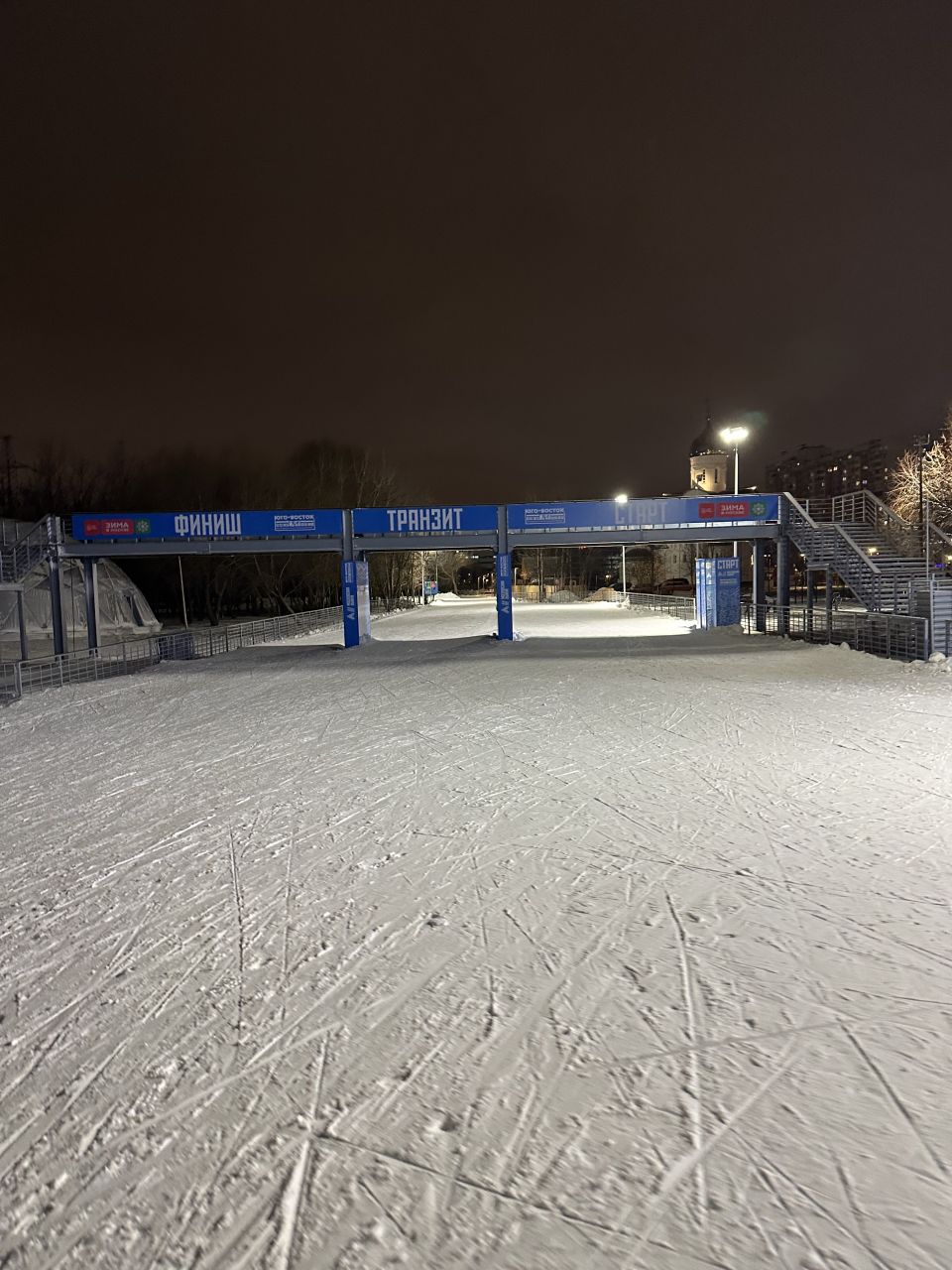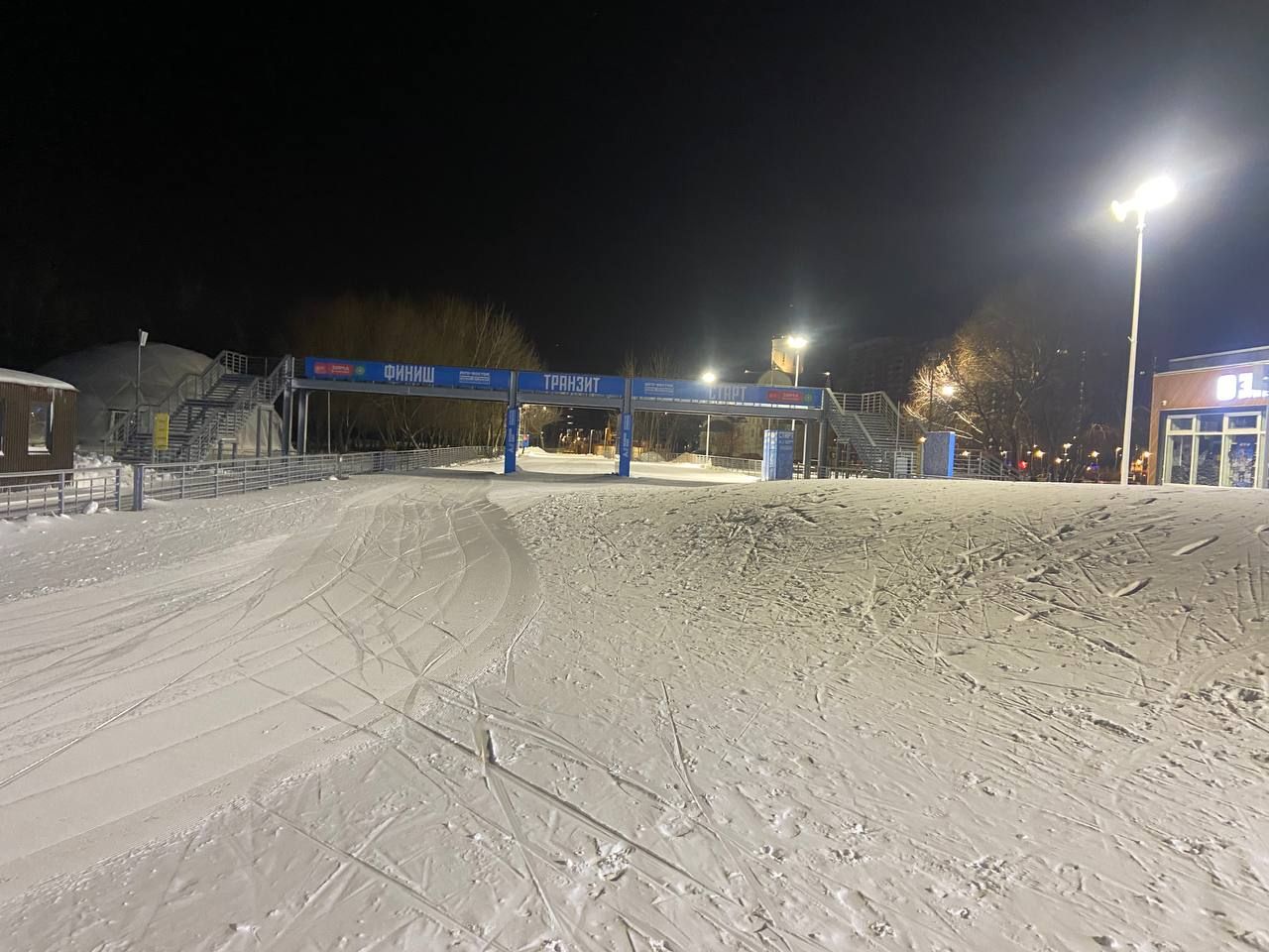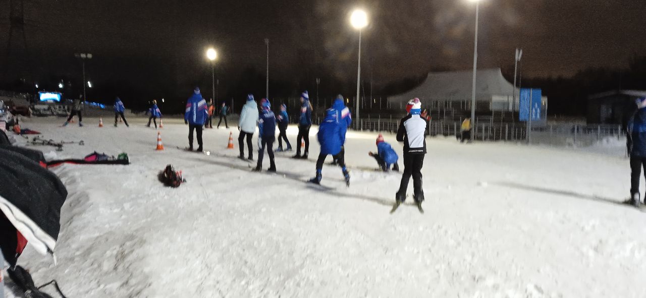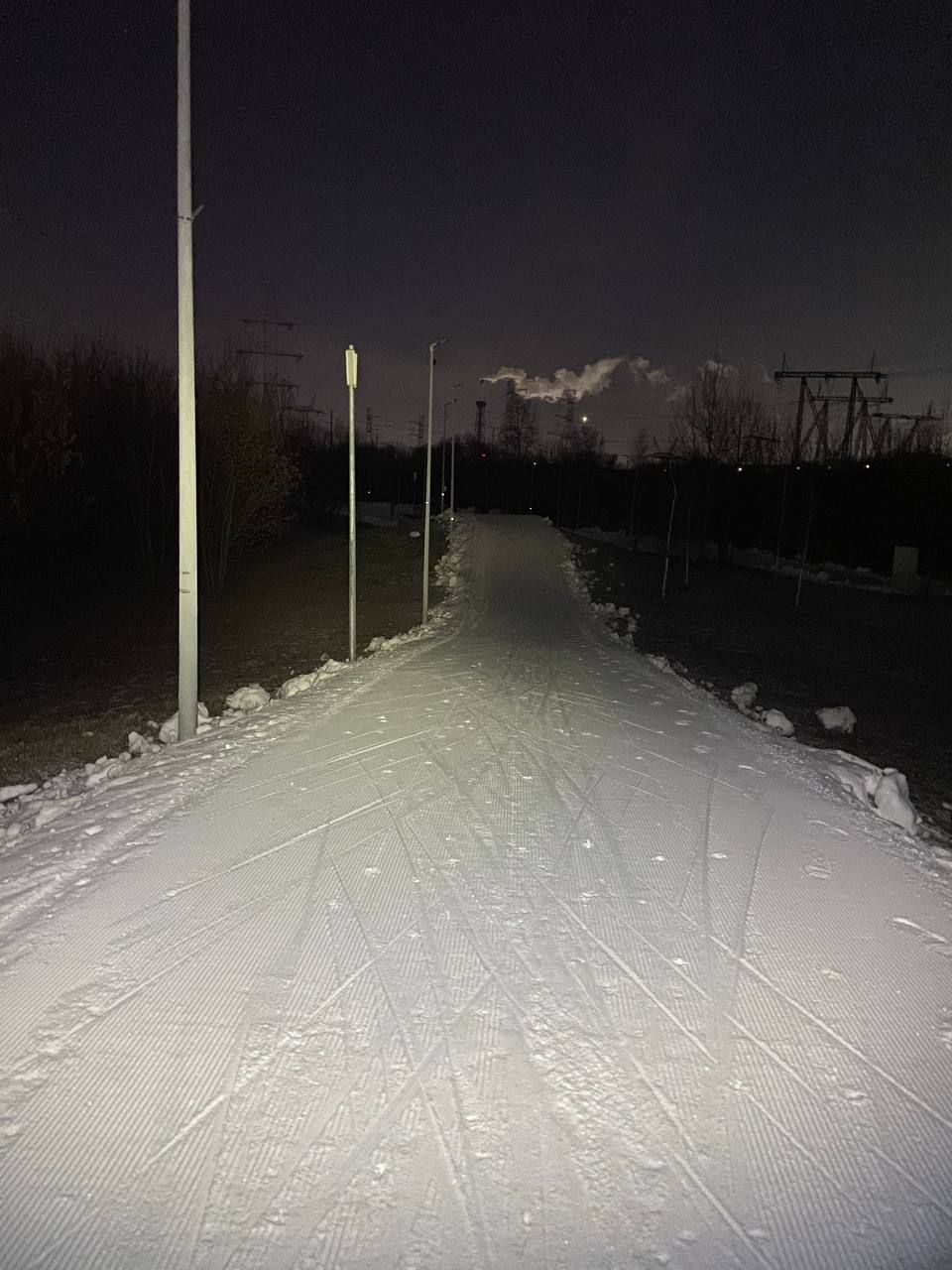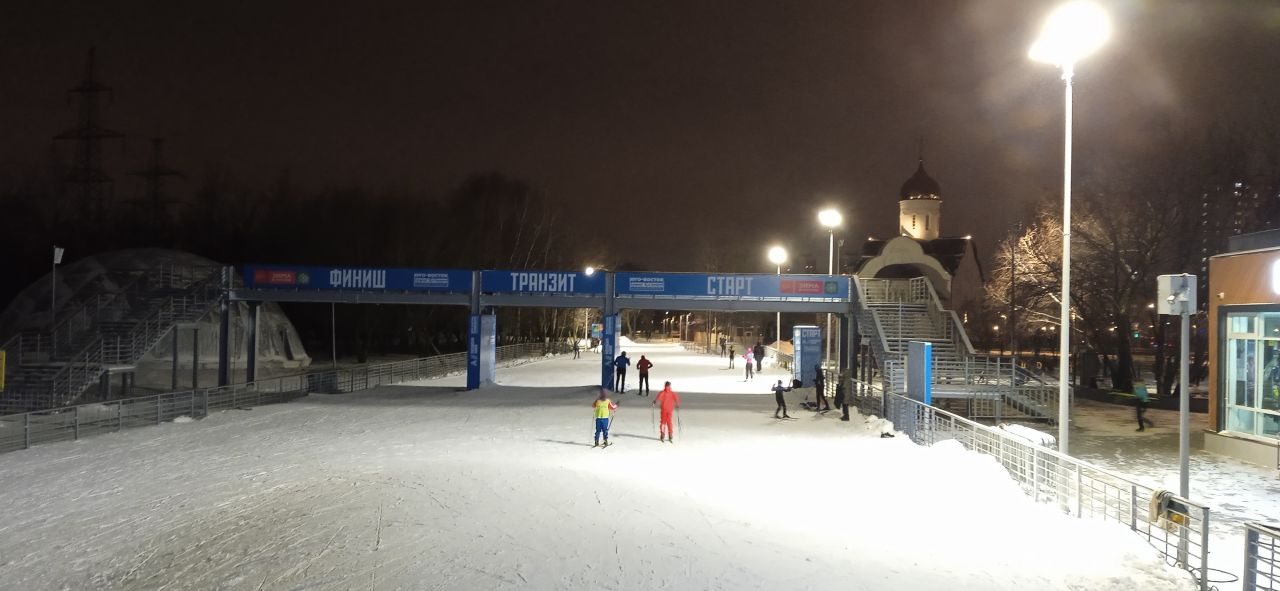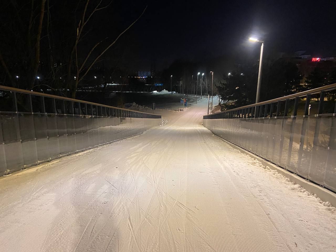 В Марьино хорошо, катучий белый пластик, с ледяной крошкой. Пару мест стерли до льда, где спуск к повороту и выезд на дальнюю петлю. Освещение не везде, но видимость хорошая без фонаря. К 22 часам трасса почти опустела.