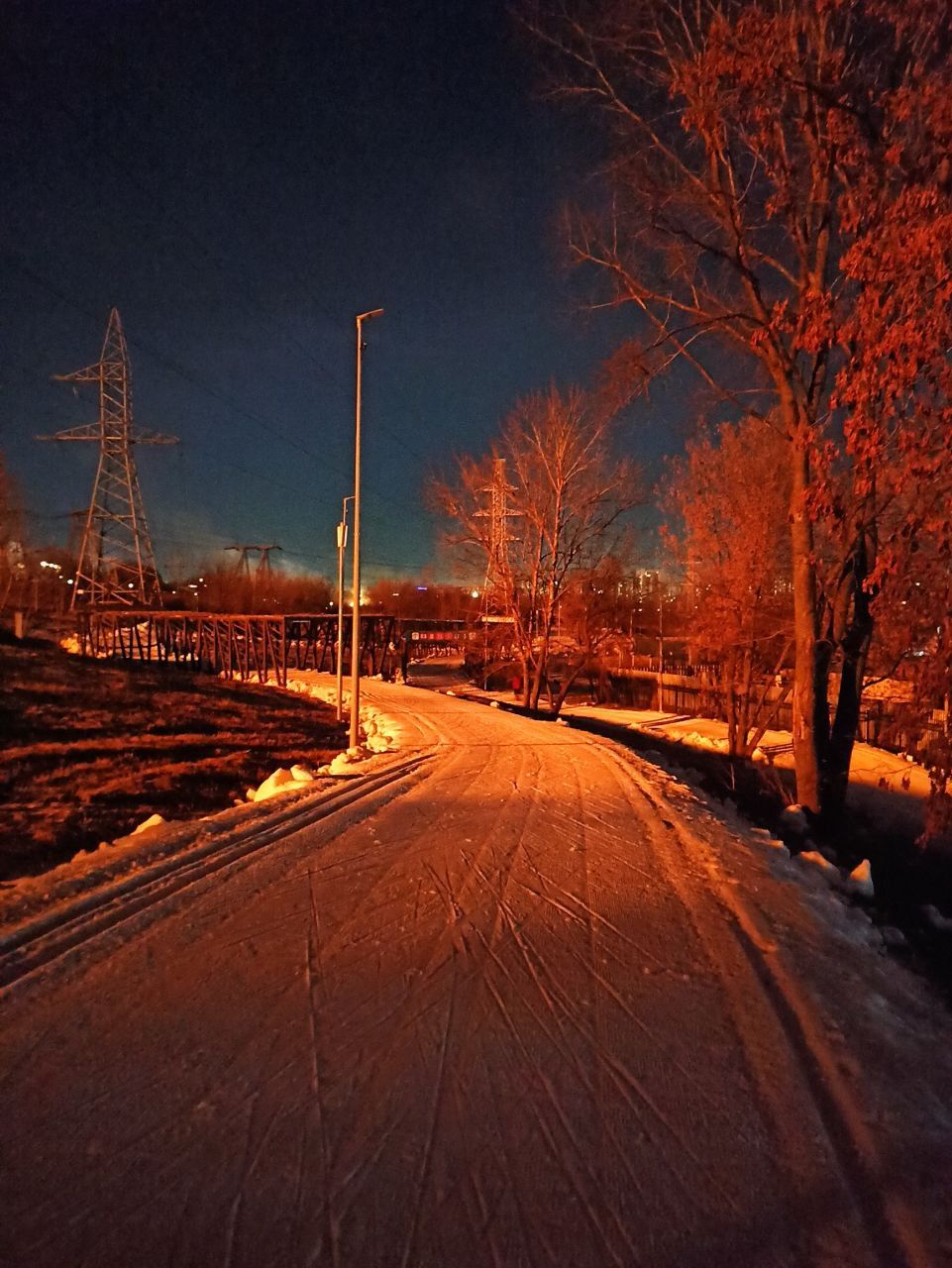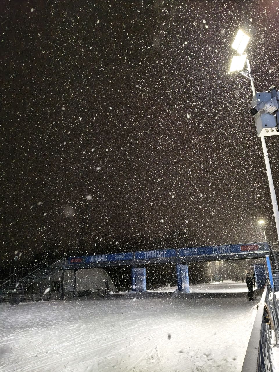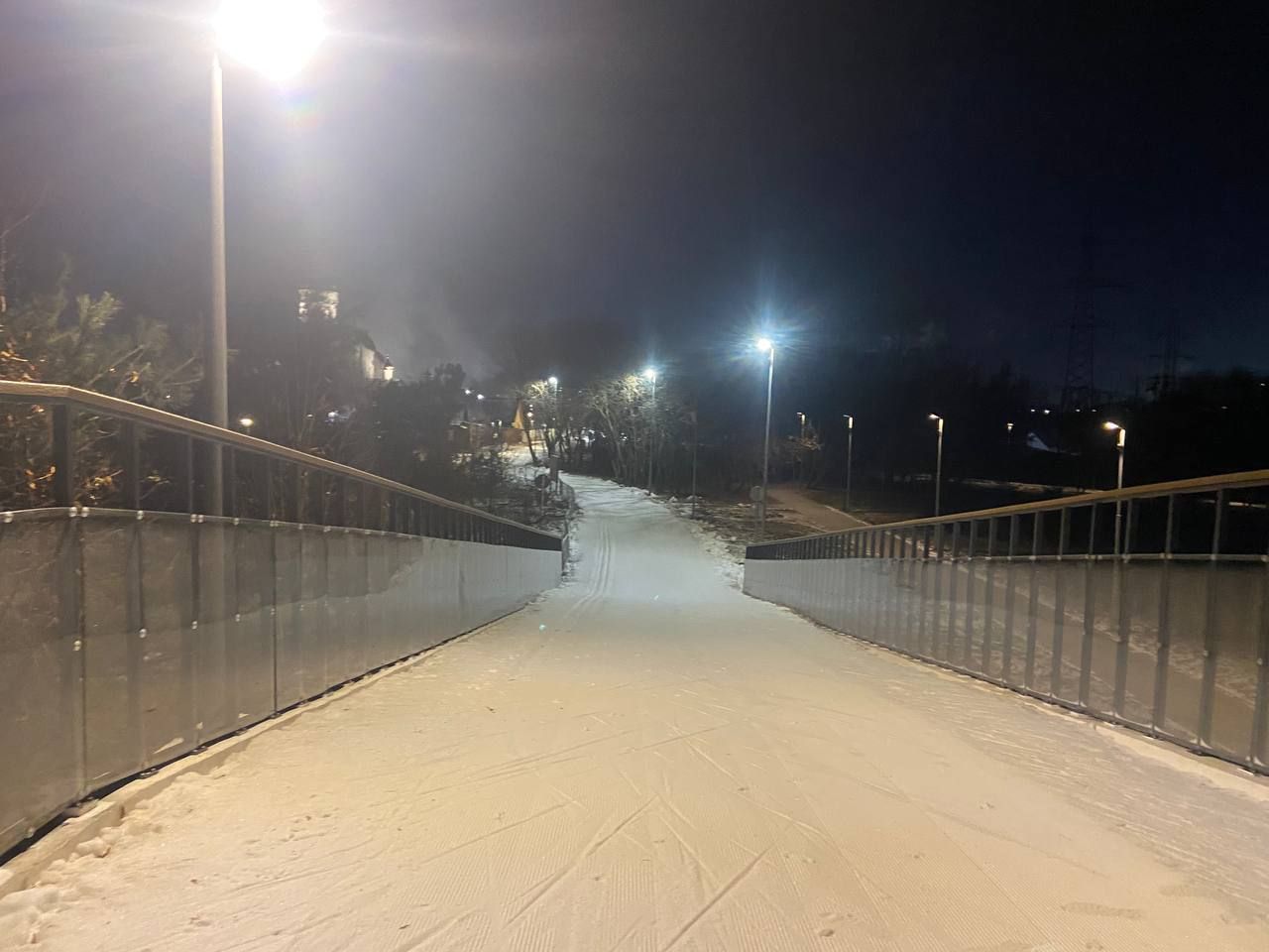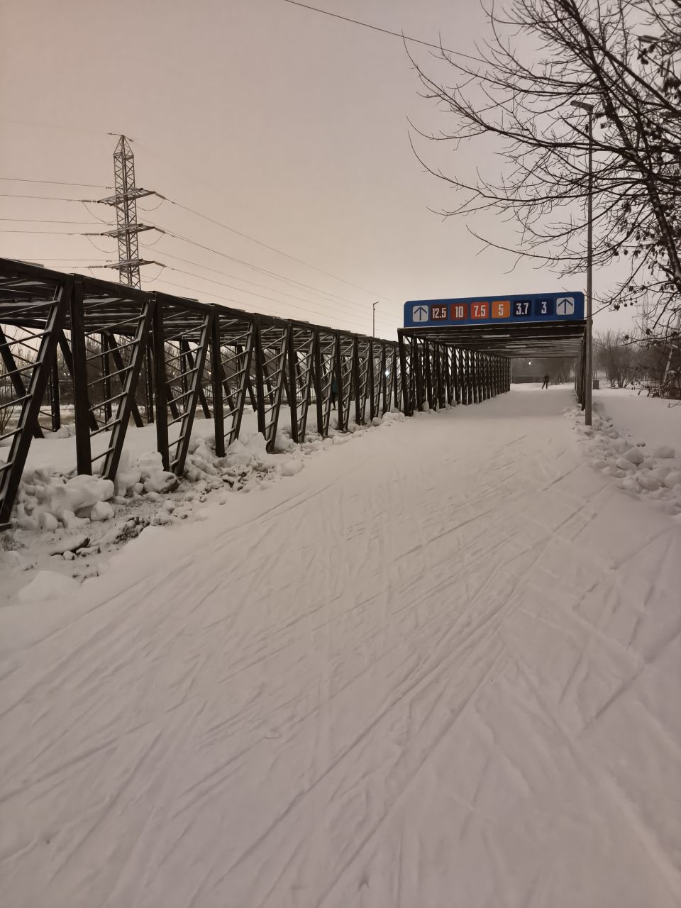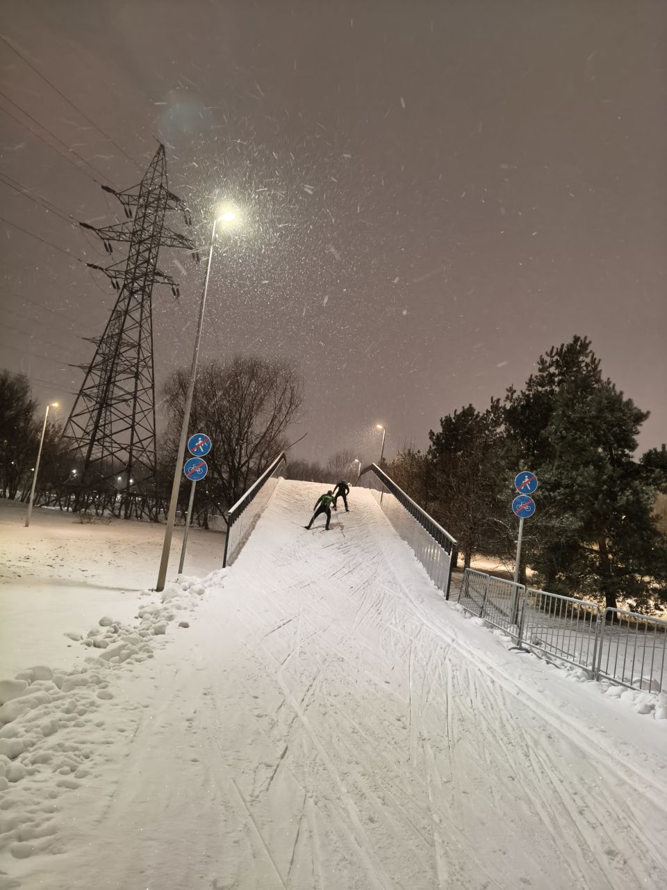 В Марьино хорошо, катучий белый пластик, с ледяной крошкой. Пару мест стерли до льда, где спуск к повороту и выезд на дальнюю петлю. Освещение не везде, но видимость хорошая без фонаря. К 22 часам трасса почти опустела.