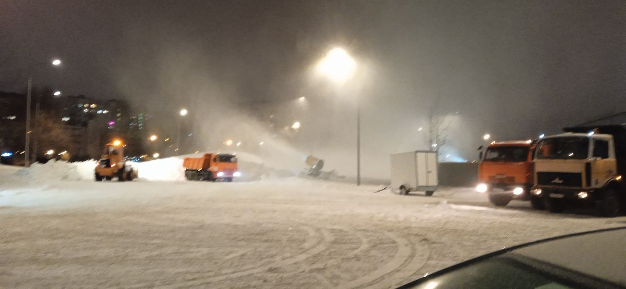 Подготовка идёт очень активно, очередь из камазов не успевает развозить гору снега. Хорошо, что в этом году снегогенерация устроена на парковке, что не мешает кататься.