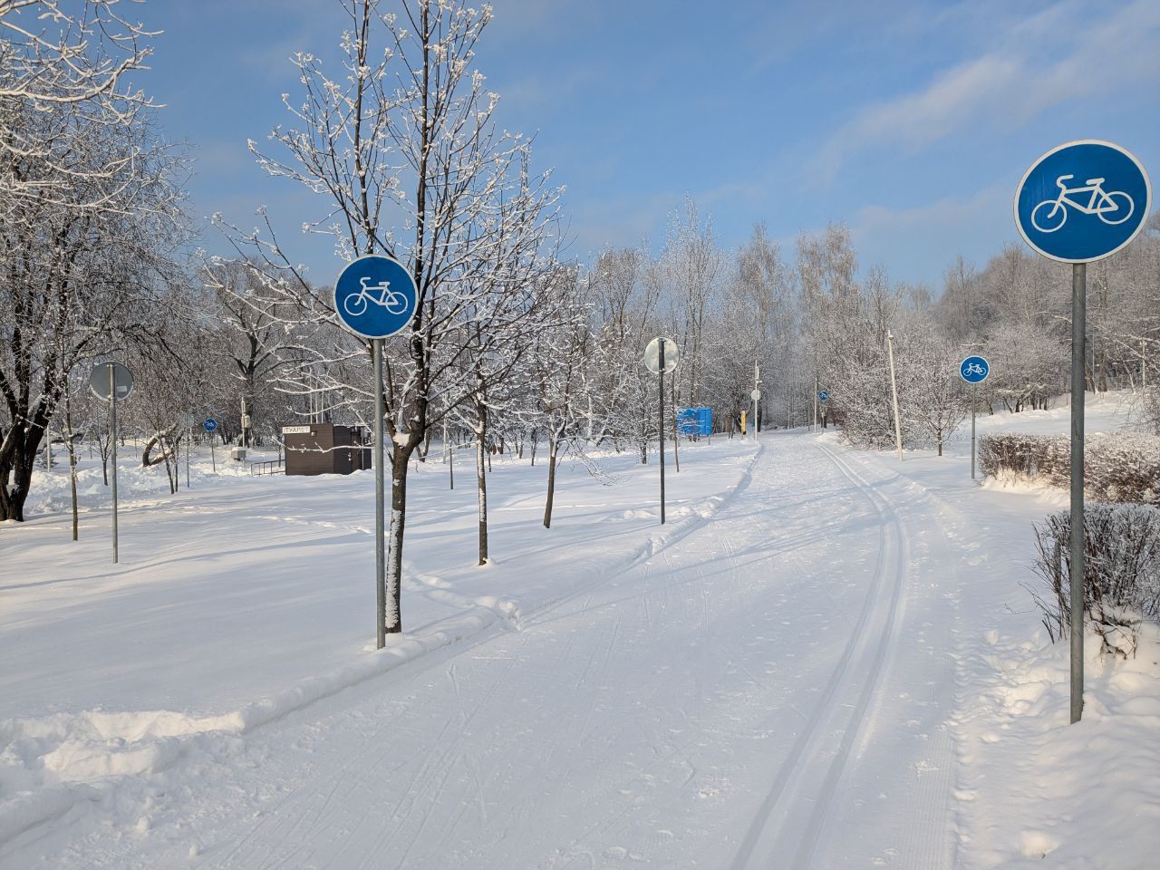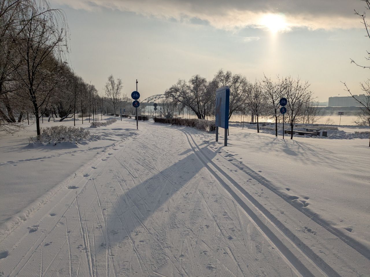 Памятуя, что в былые годы ратрак порой доезжал до Братеевского моста, решил попробовать прокатиться "от моста до моста". Теперь, как будто, здесь ездит трактор, но всё равно ширина есть, чисто, пересечения с дорожками аккуратные. Можно стартовать. На основной трассе развели потоки на участке у воды и памп-трека - отлично!