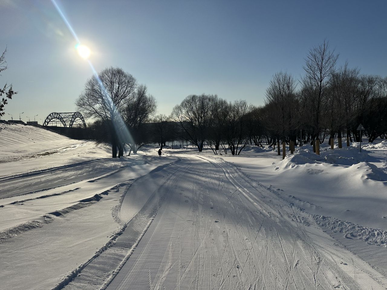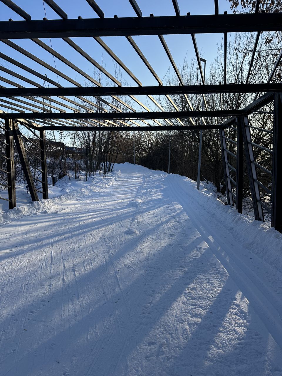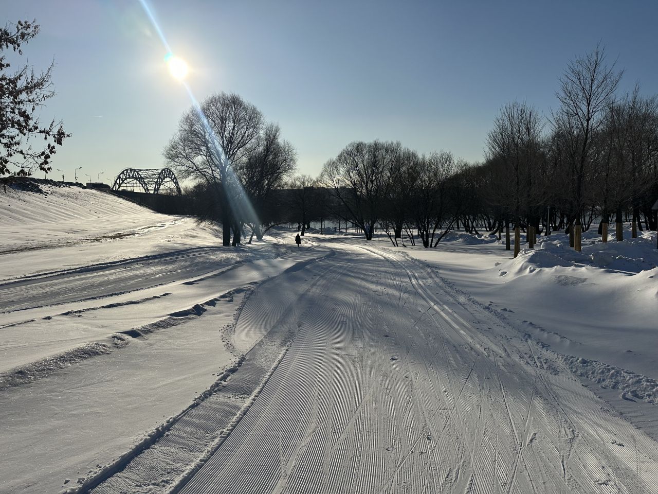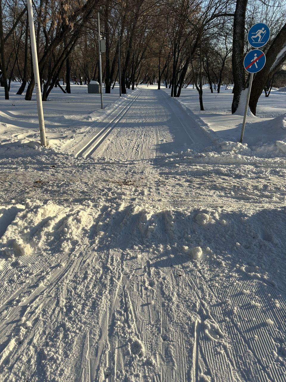 Сама трасса полностью готовилась, классика и конёк, почти идеальное качество - плотно, снежно, быстро на солнце (сейчас чуть подтупливают лыжи в тени) 9/10. Есть неровный участок с бугром на подъеме из Марьино в Капотню.