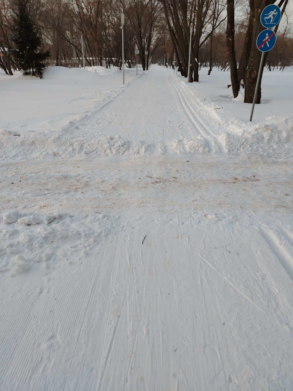 На коротких кругах днём 13.02 были соревнования, а на кругу 7.5 км на половине его длины лыжню срыли: где вельвет ратрака на всю ширину, где ездил трактор и что-то расчищал - с пергол обвалился мокрый снег. И стала проваливаться правая палка, местами сантиметров на 40.