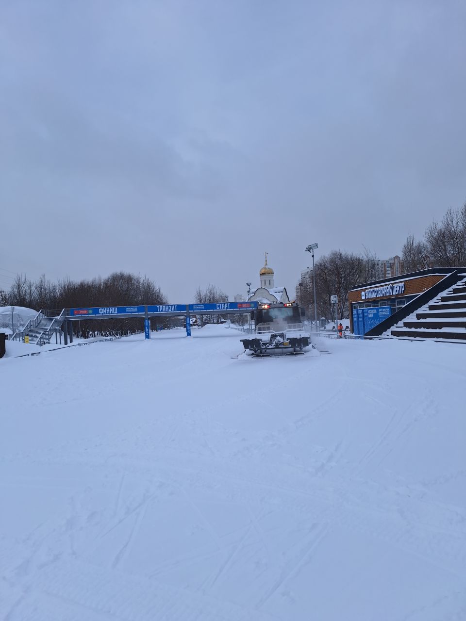 Начал катать ратрак. Снег под шпалерами чистят ручными снегоочистителями, а не трактором, как в прошлый раз. Пока немного мягко, к вечеру укатают ОК.