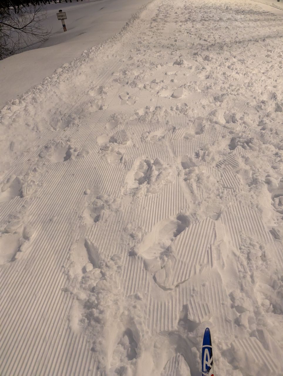 На 20-00 Круг 3.7км вязкий, но подготовлен, ехать можно, а вот 5 км ратрак прошел, но граждане все ногами превратили в кашу (на фото). 7.5 км и более не готовился. Завтра, 21 февраля, весь день соревнования Пионер кап.