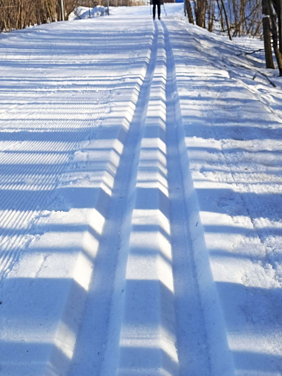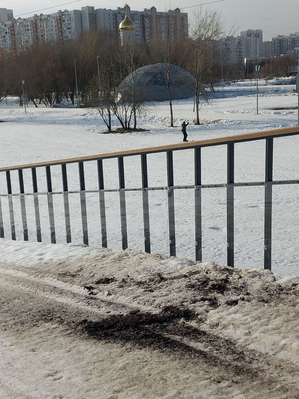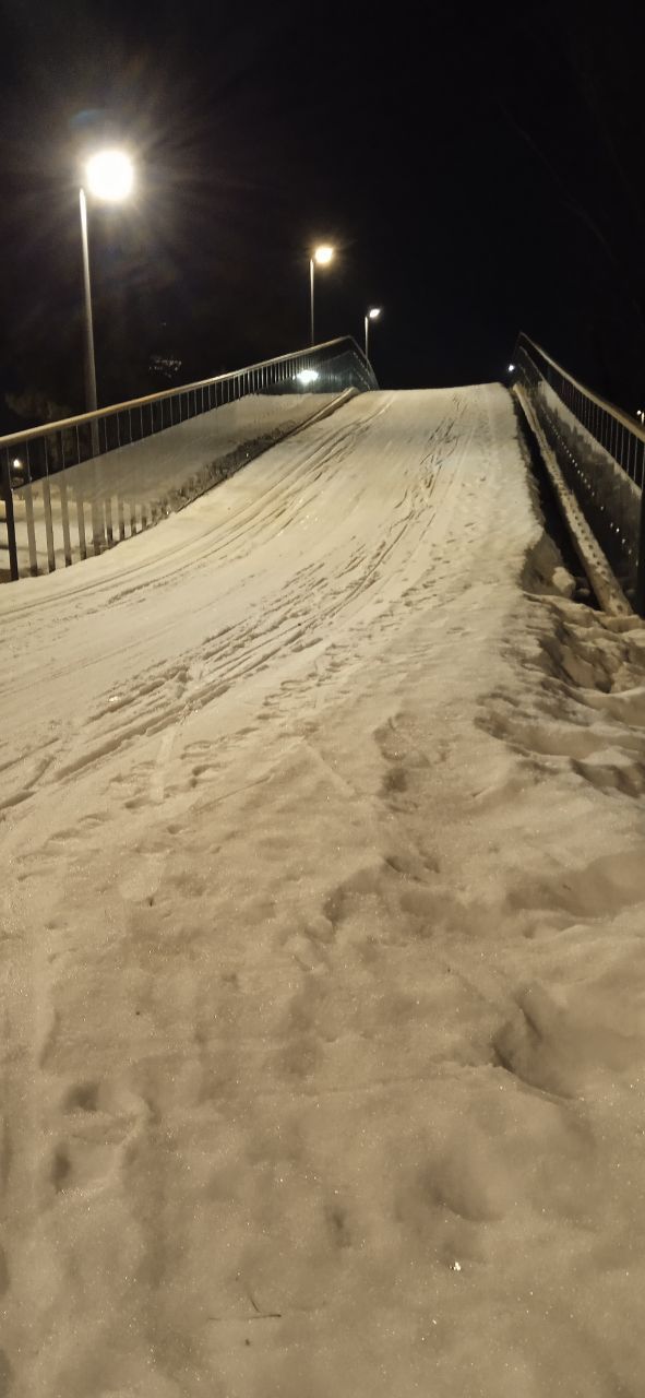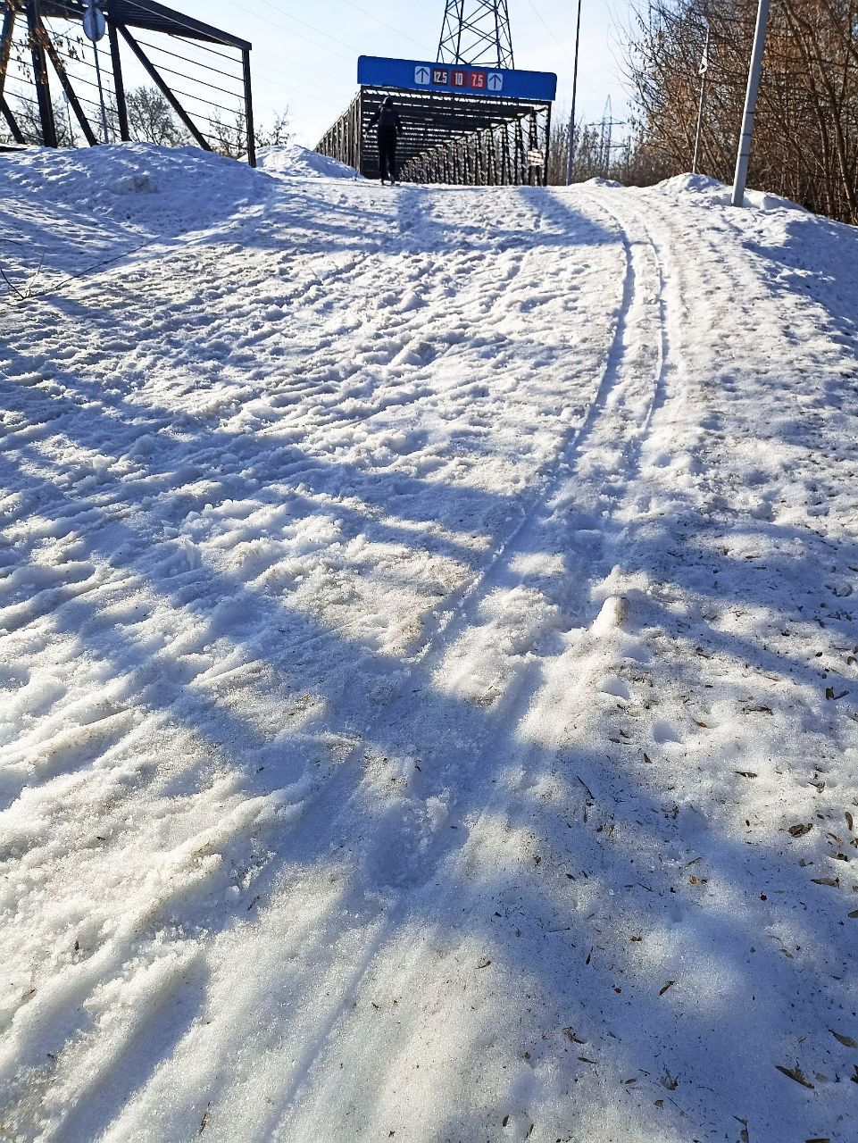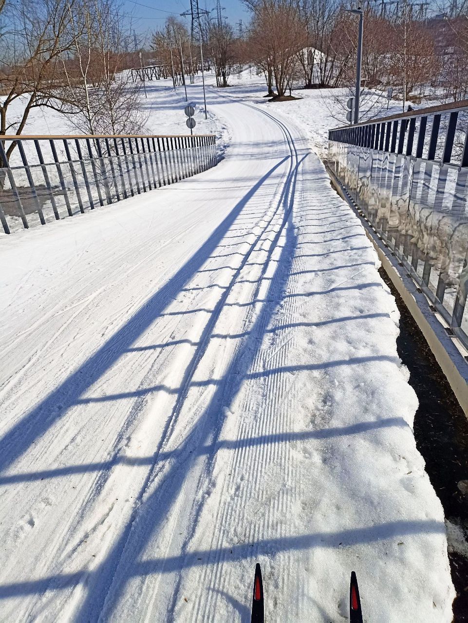 На последнем мостике перед стадионом на самом верху справа на лыжне оттаял кусок грязи/земли, убрать бы его и снегом присыпать.